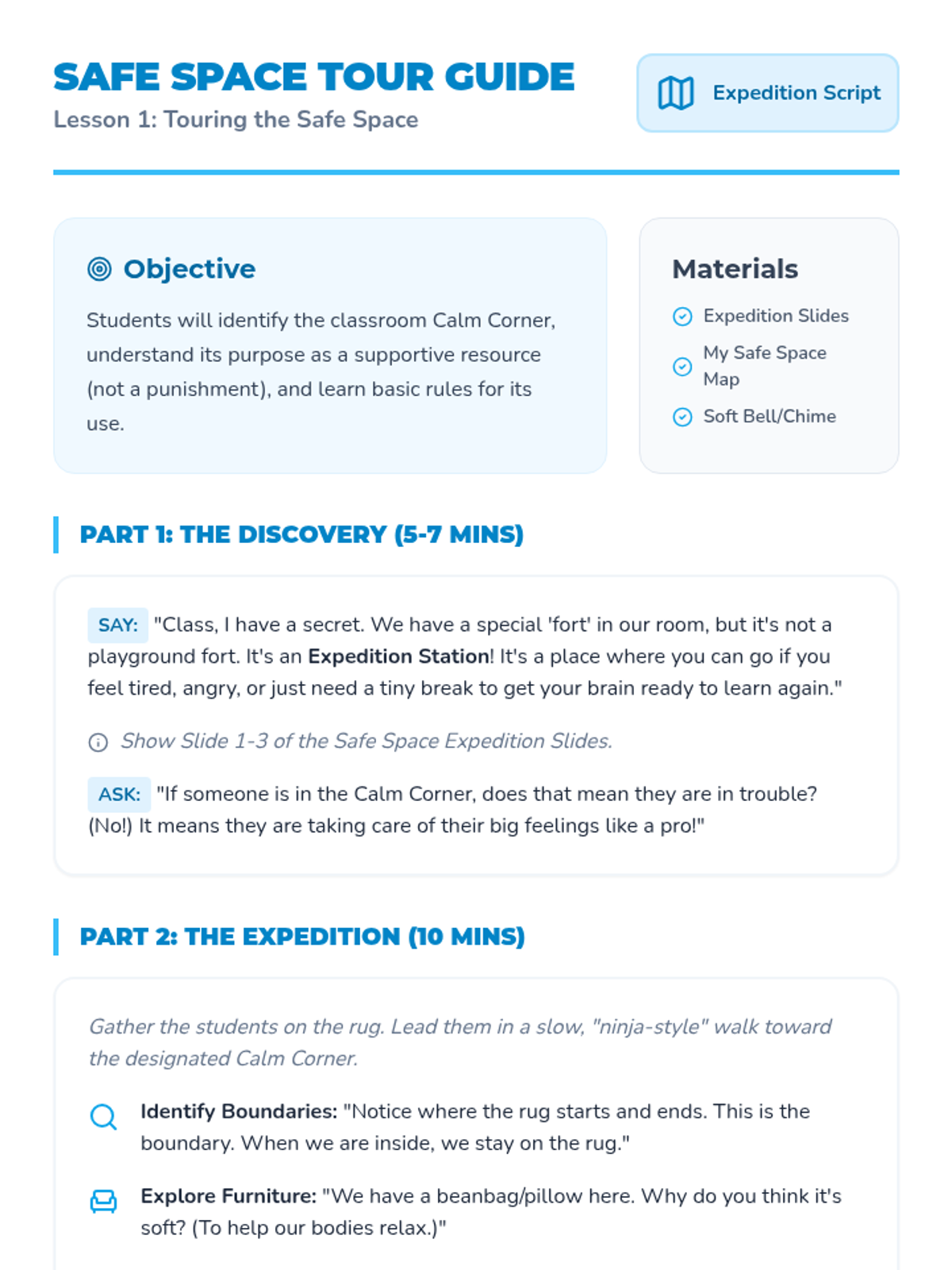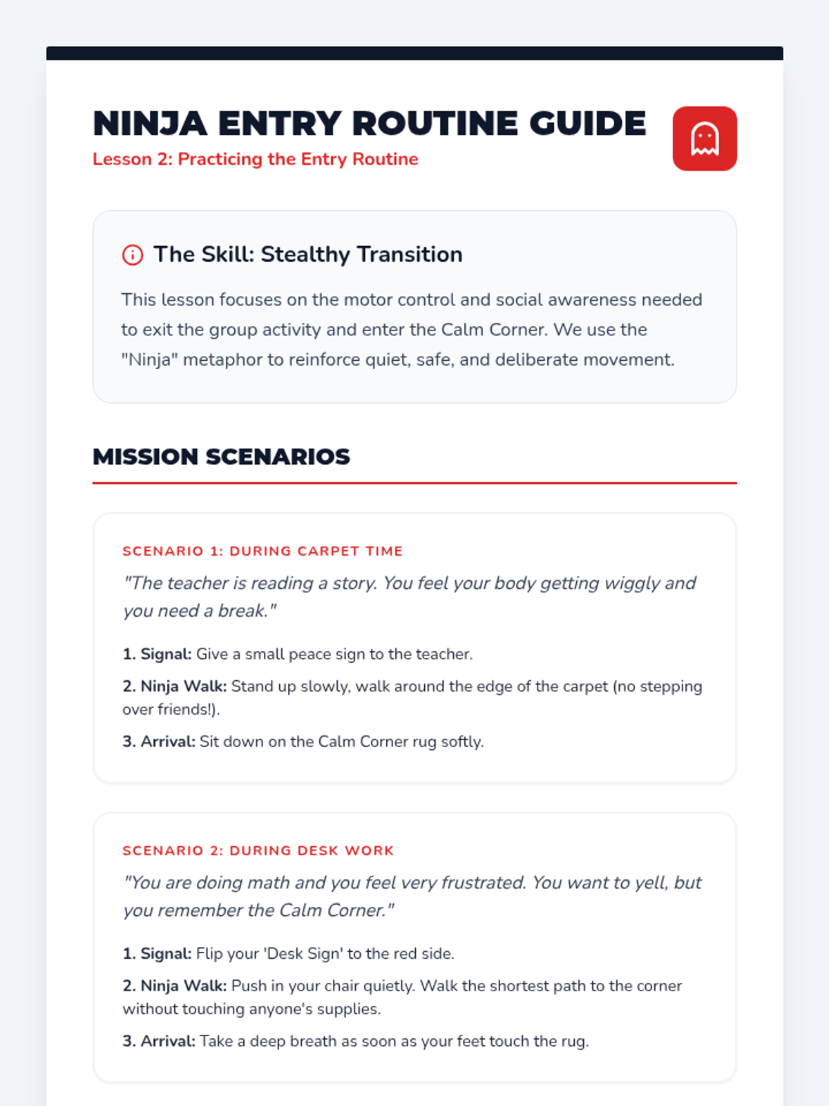 A comprehensive unit for Kindergarten students on identifying, accessing, and effectively using a classroom Calm Corner for self-regulation and recovery. Students progress through routines of entry, timing, cleanup, and re-entry to ensure the space remains a productive tool for learning readiness.