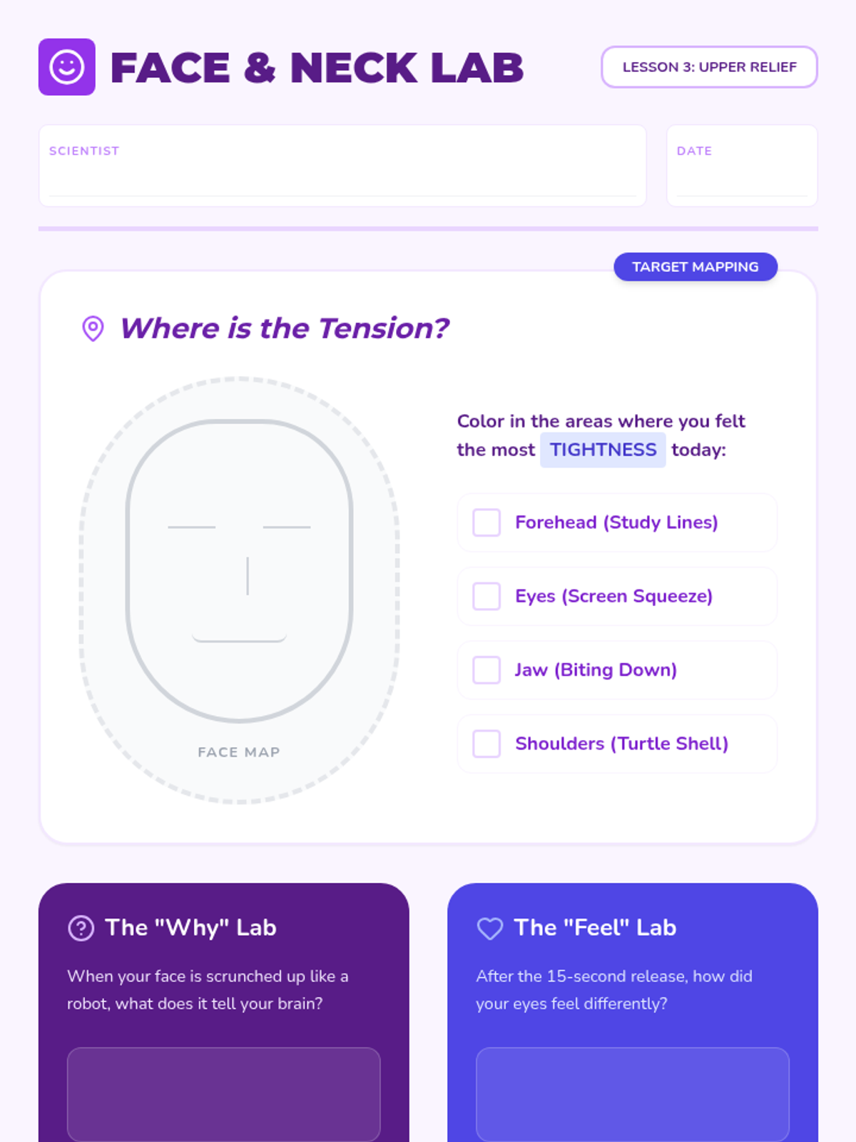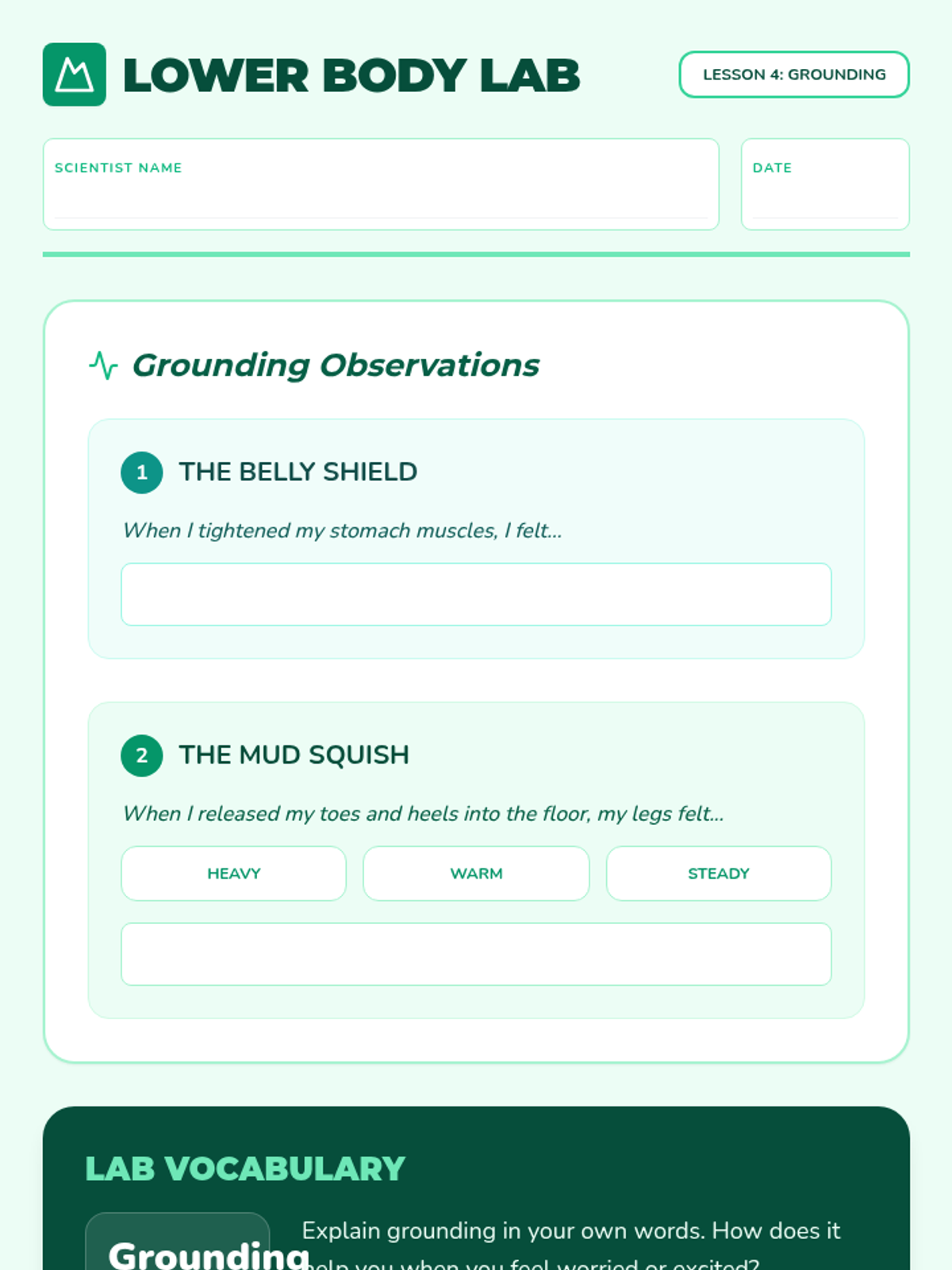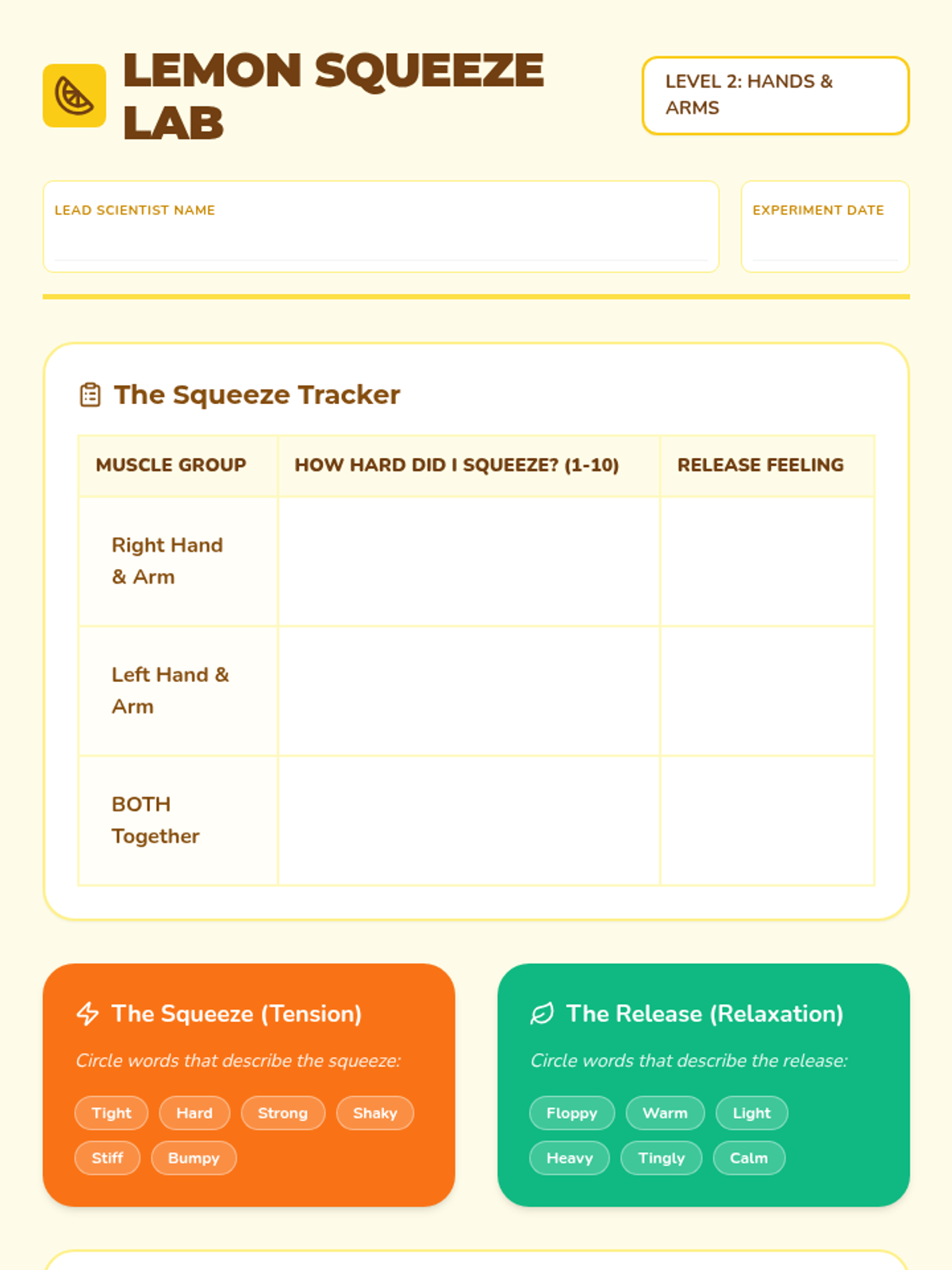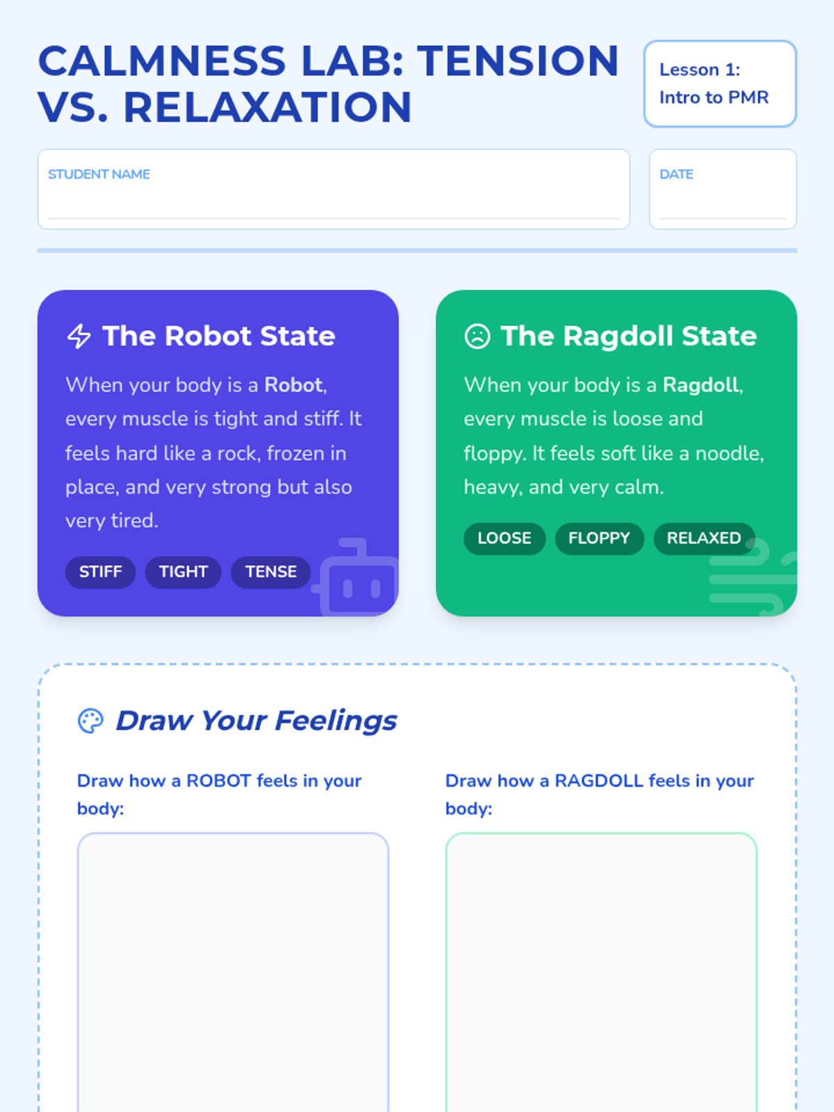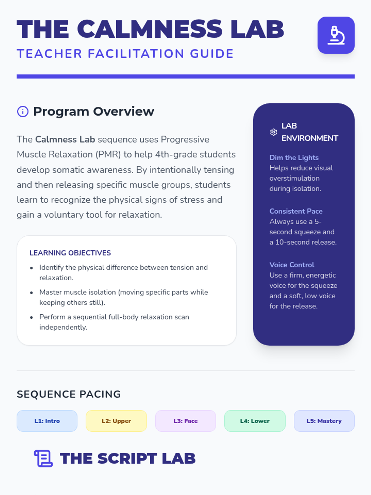This sequence introduces 4th-grade students to Progressive Muscle Relaxation (PMR) through the 'Calmness Lab' theme. Students learn to distinguish between tension and relaxation, isolate muscle groups (upper body, face/neck, lower body), and finally perform a full-body scan to manage stress and physical tension.