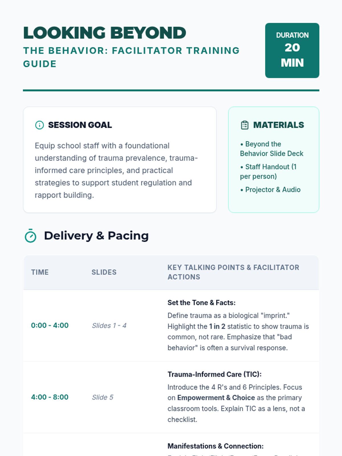 A professional development sequence designed to equip school staff with the knowledge and tools to support students experiencing trauma, focusing on looking beyond behavior to address grief, loss, and family instability.