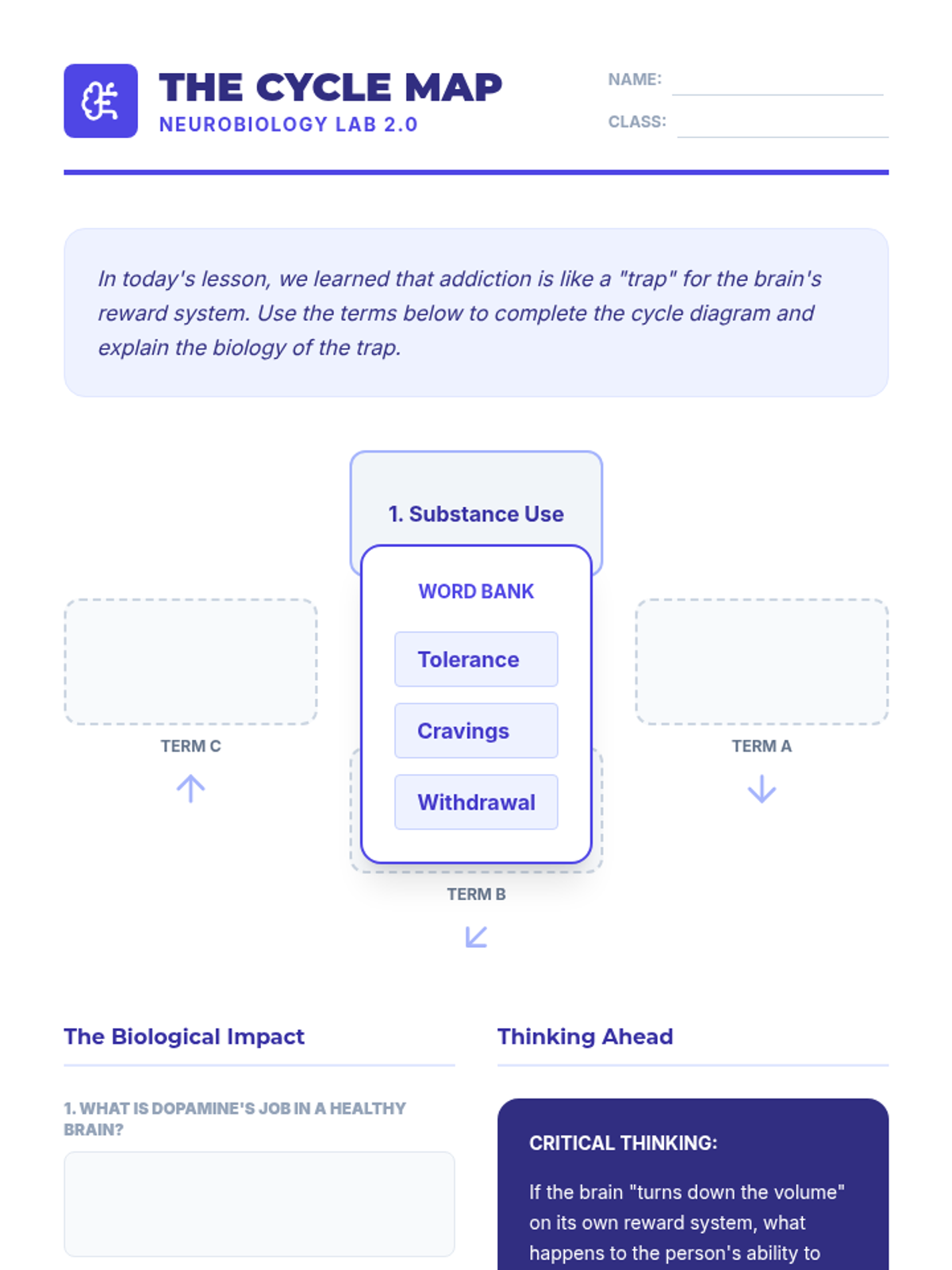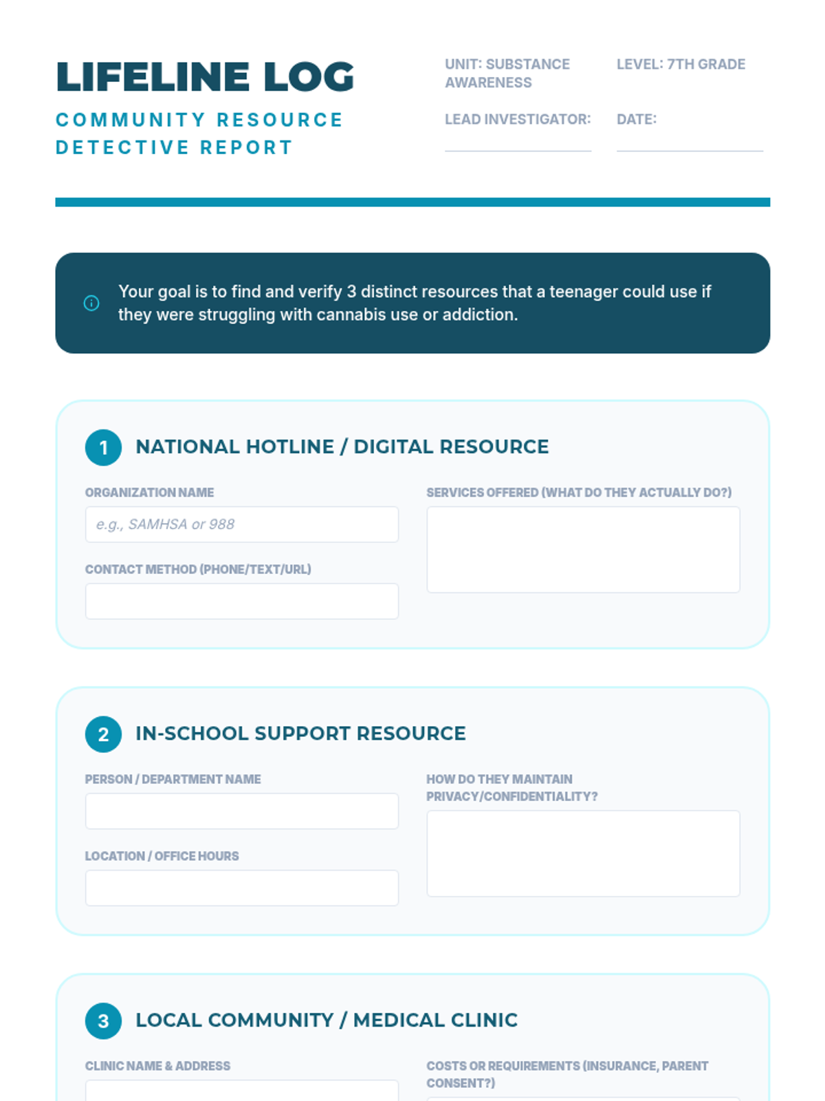 A 5-lesson sequence for 7th-grade students exploring the transition from cannabis use to dependency, the neurobiology of addiction, barriers to seeking help, and local community health resources. Students build empathy and advocacy skills to support peers in need.