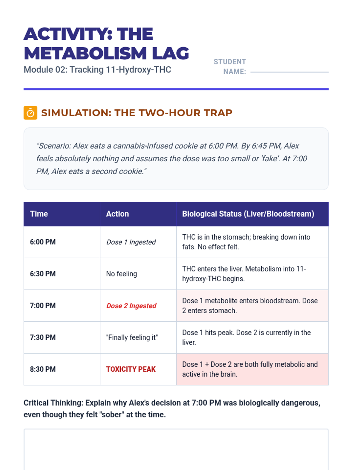 An 8th-grade health sequence exploring the physical and mental health consequences of cannabis use, including respiratory risks, the dangers of delayed intoxication from edibles, mental health correlations, and impacts on sleep and motivation.