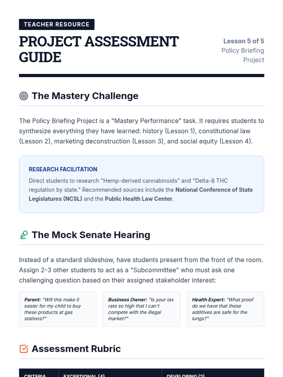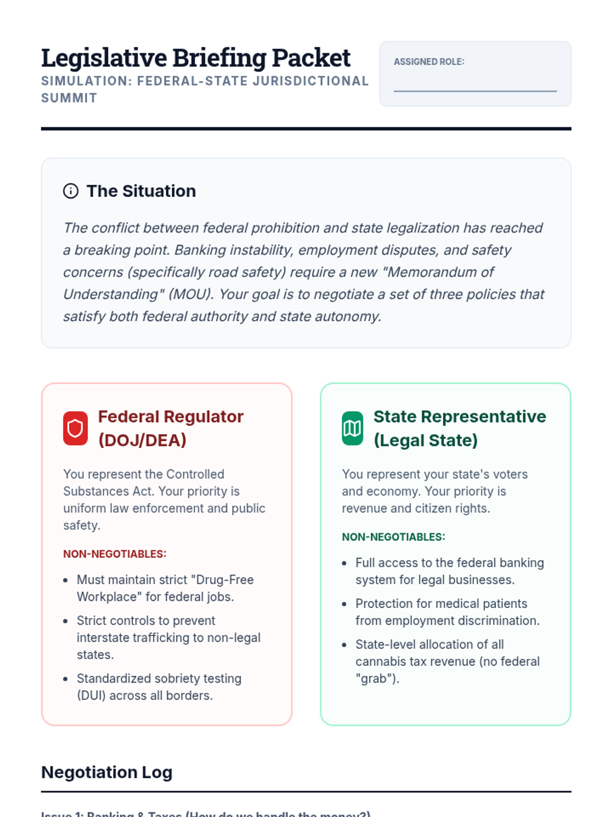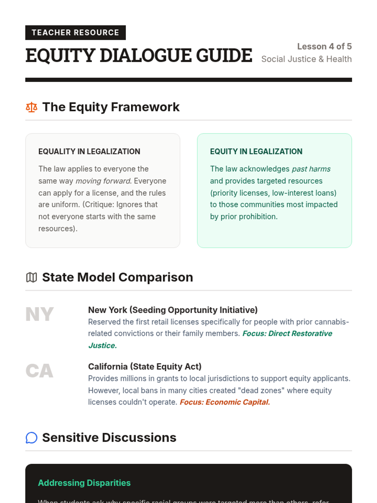 A 12th-grade health and civics sequence exploring the evolution of cannabis laws, the conflict between state and federal regulations, industry marketing tactics, and social equity in public policy. students move from historical analysis to active policy creation.