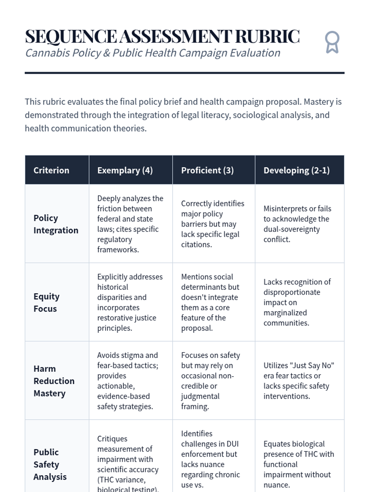 An undergraduate-level exploration of cannabis through the lens of public health, legal history, and social equity. This sequence analyzes the transition from prohibition to regulation, focusing on harm reduction and evidence-based policy.