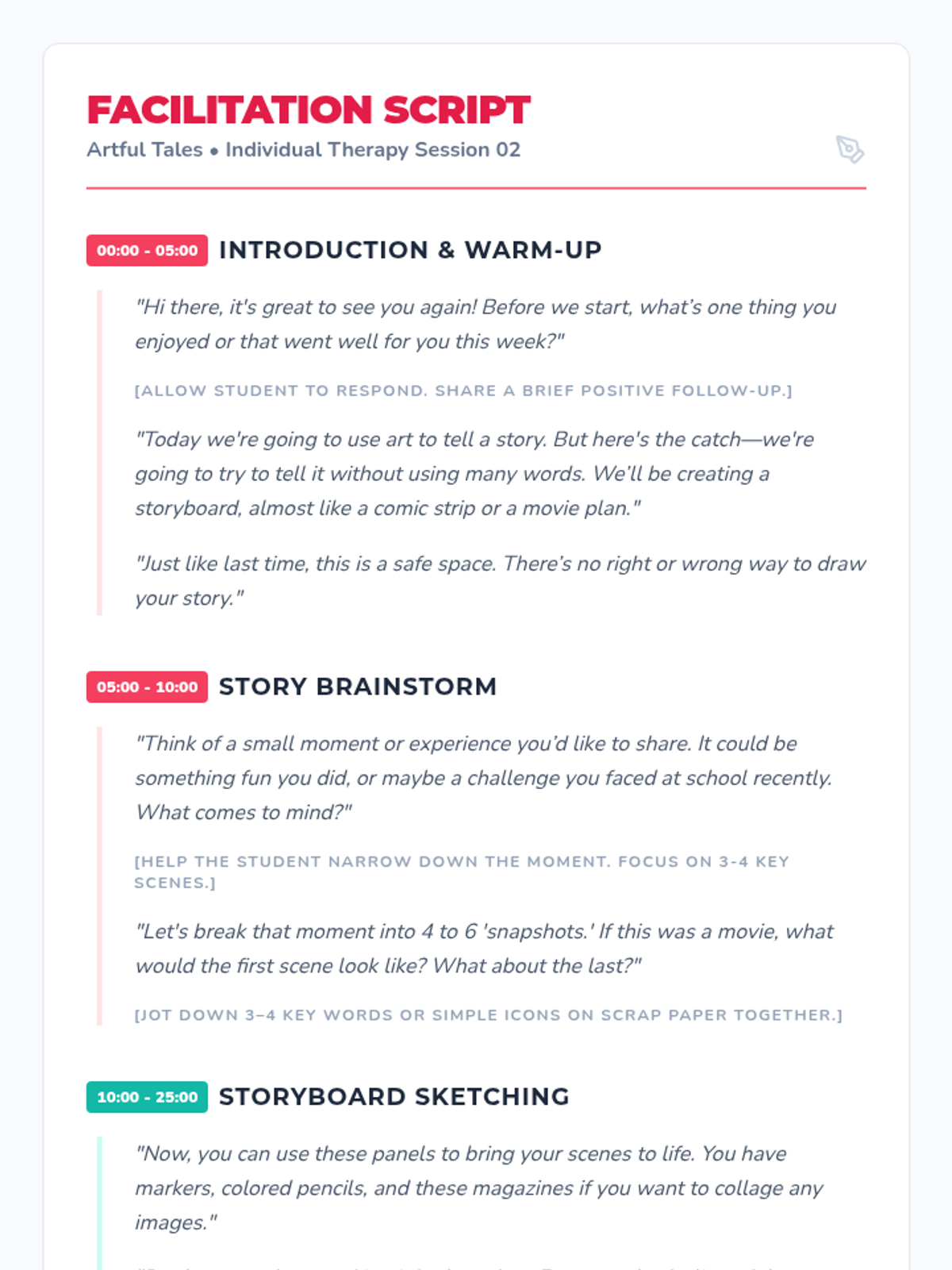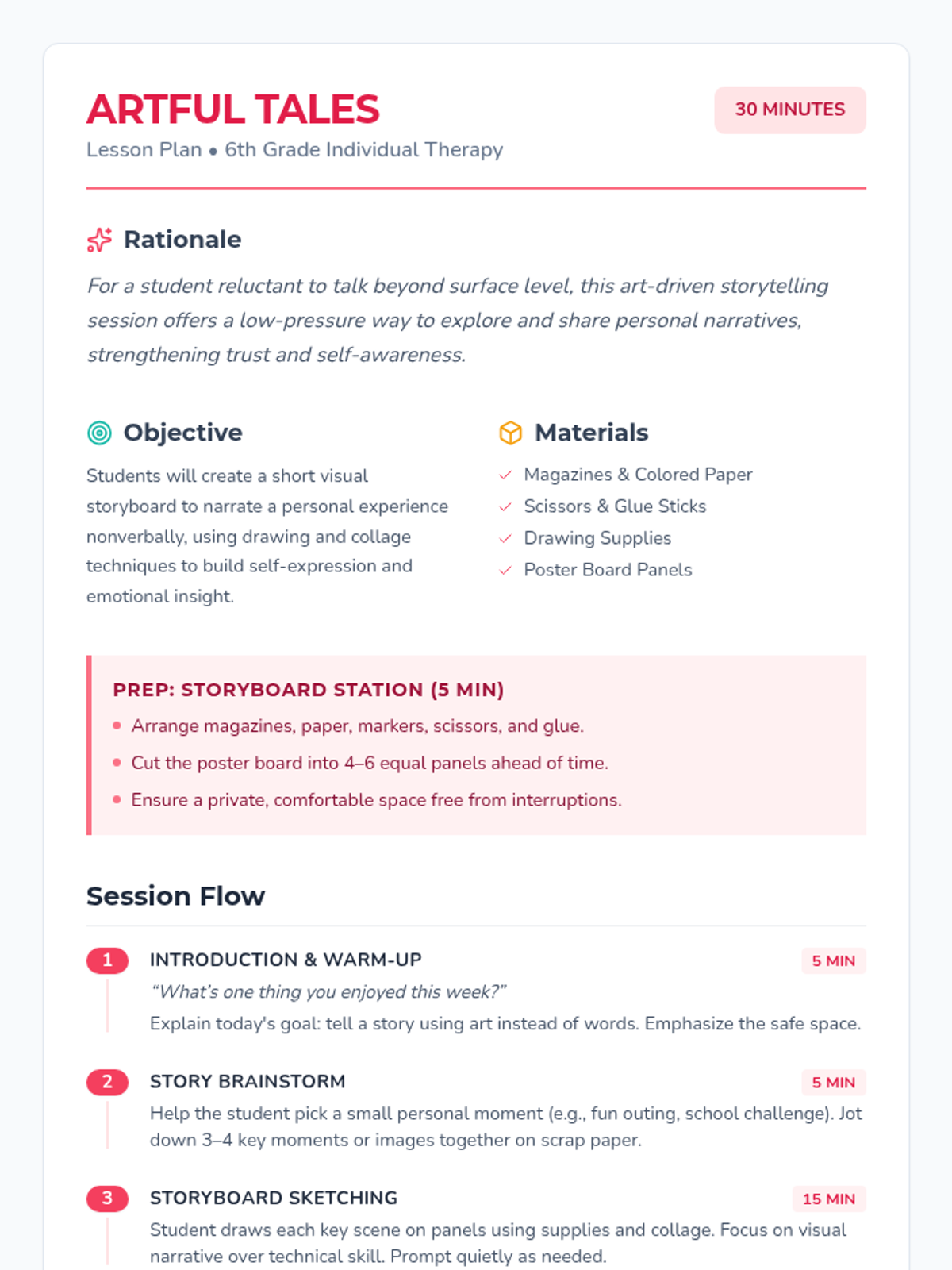 A sequence of two art-based therapeutic sessions for 6th-graders to explore emotions and personal narratives nonverbally. Through color mapping and visual storyboarding, students build self-awareness and trust in a creative, low-pressure environment.