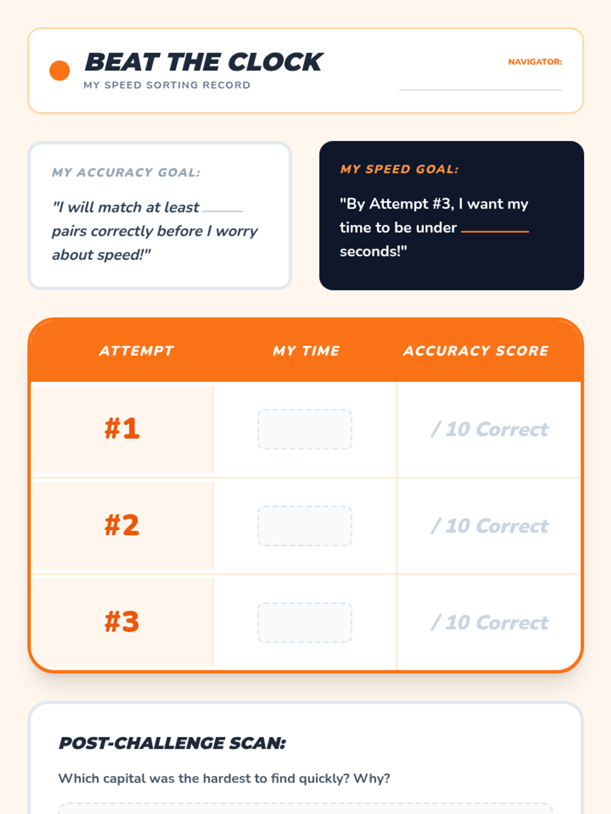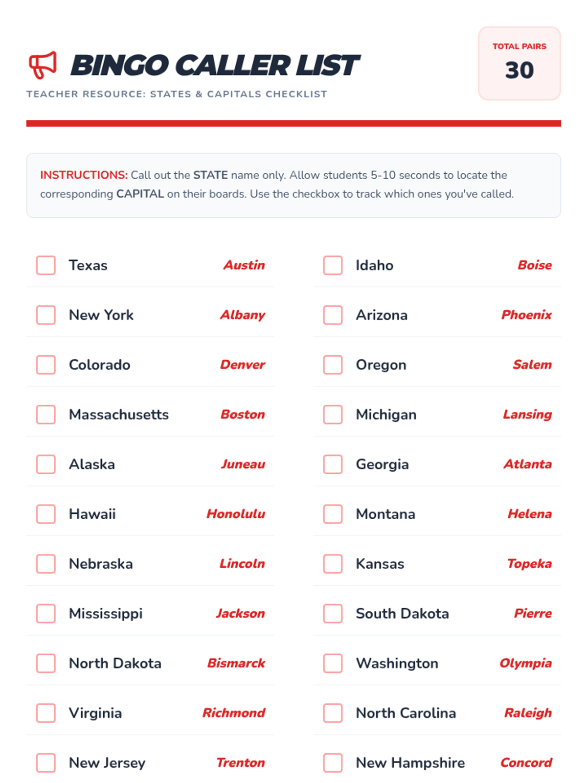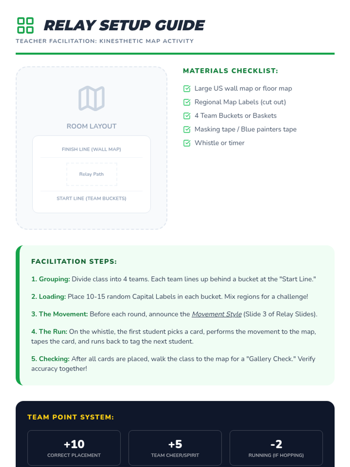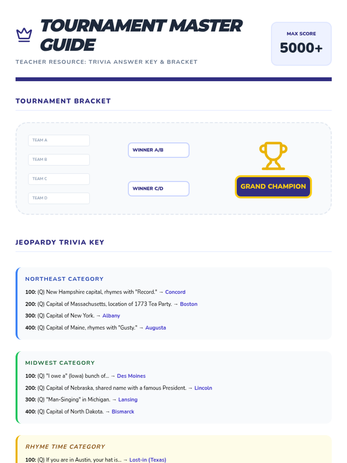 A game-based geography sequence for 3rd graders to master US state capitals through mnemonics, active play, and competitive challenges. Students move from initial recognition to rapid recall using varied instructional strategies.