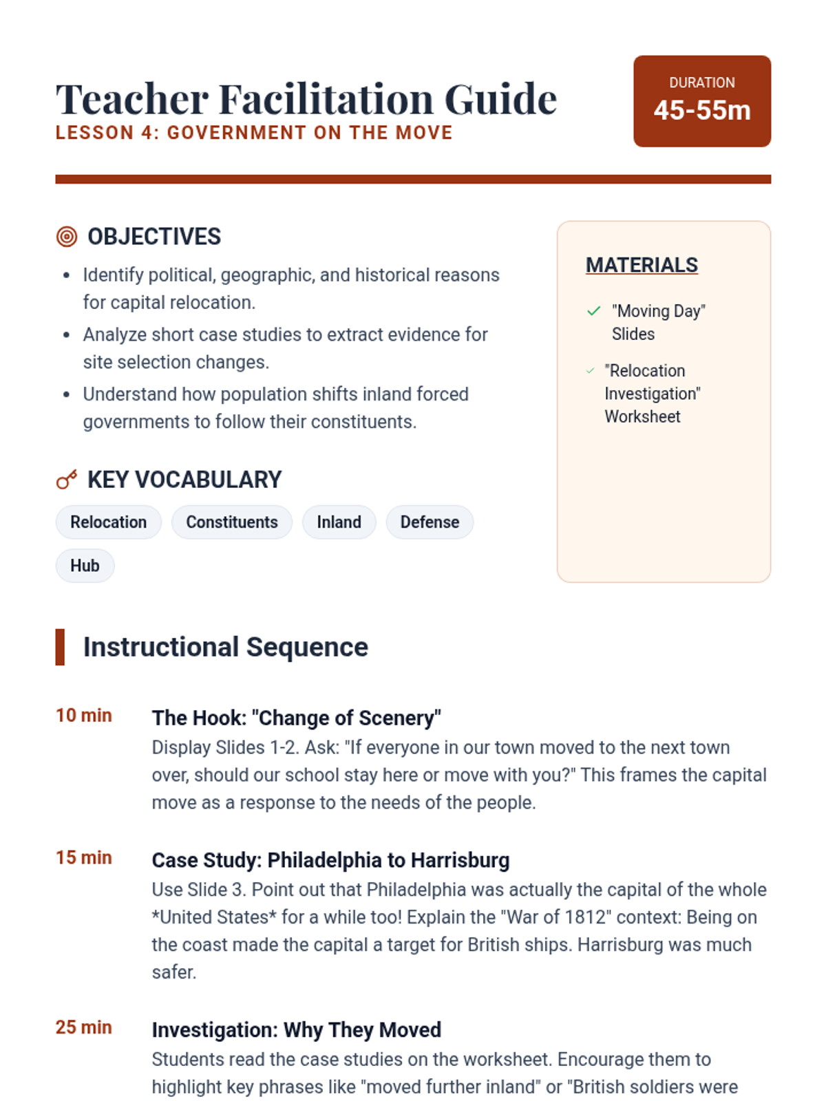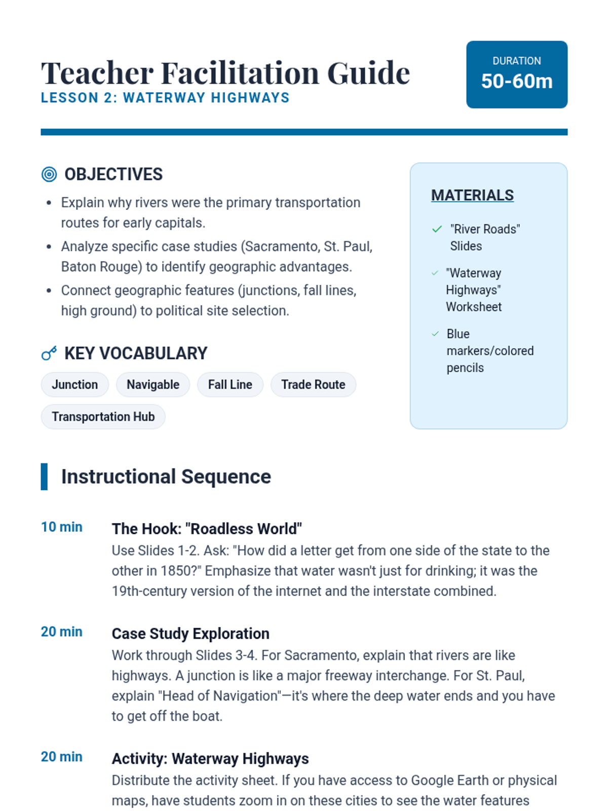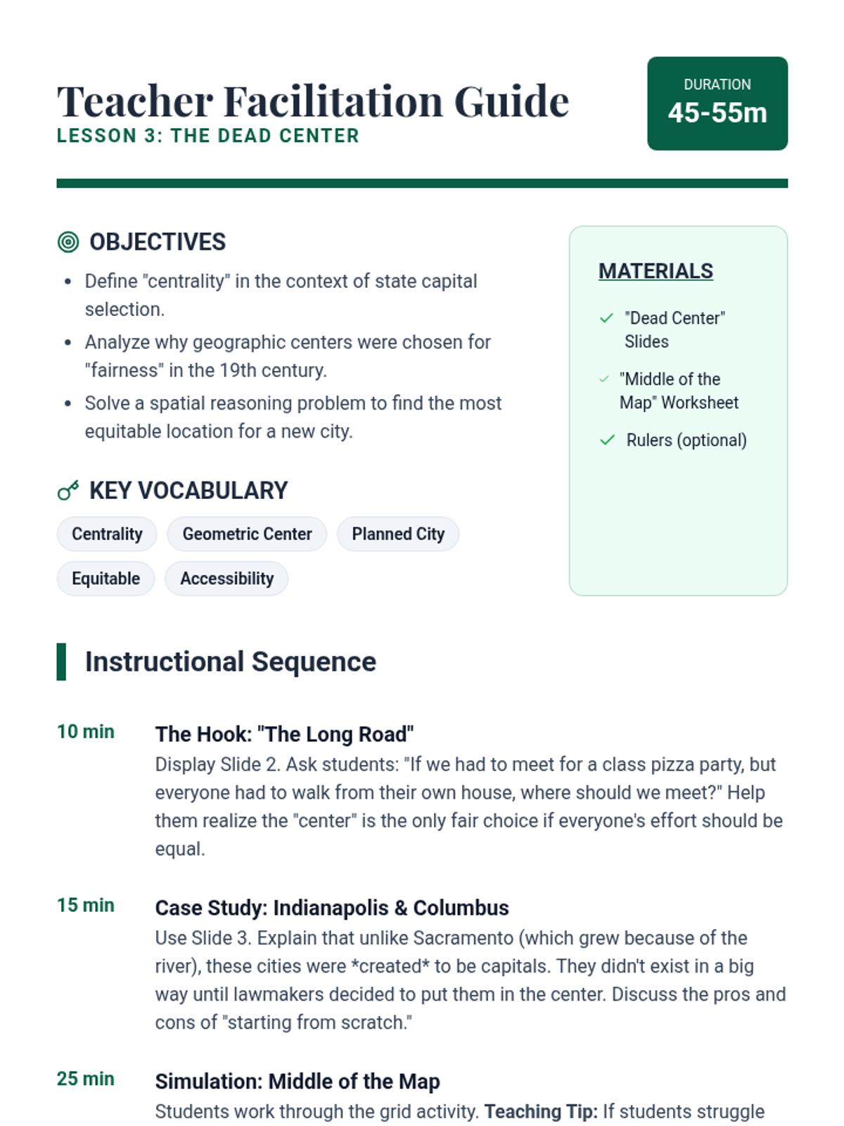 This inquiry-based geography sequence explores why state capitals are located where they are, focusing on geographic advantages, transportation, and historical context rather than rote memorization. Students analyze the distinction between economic hubs and political centers through data, maps, and simulations.