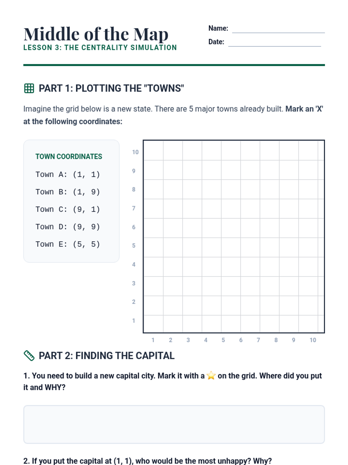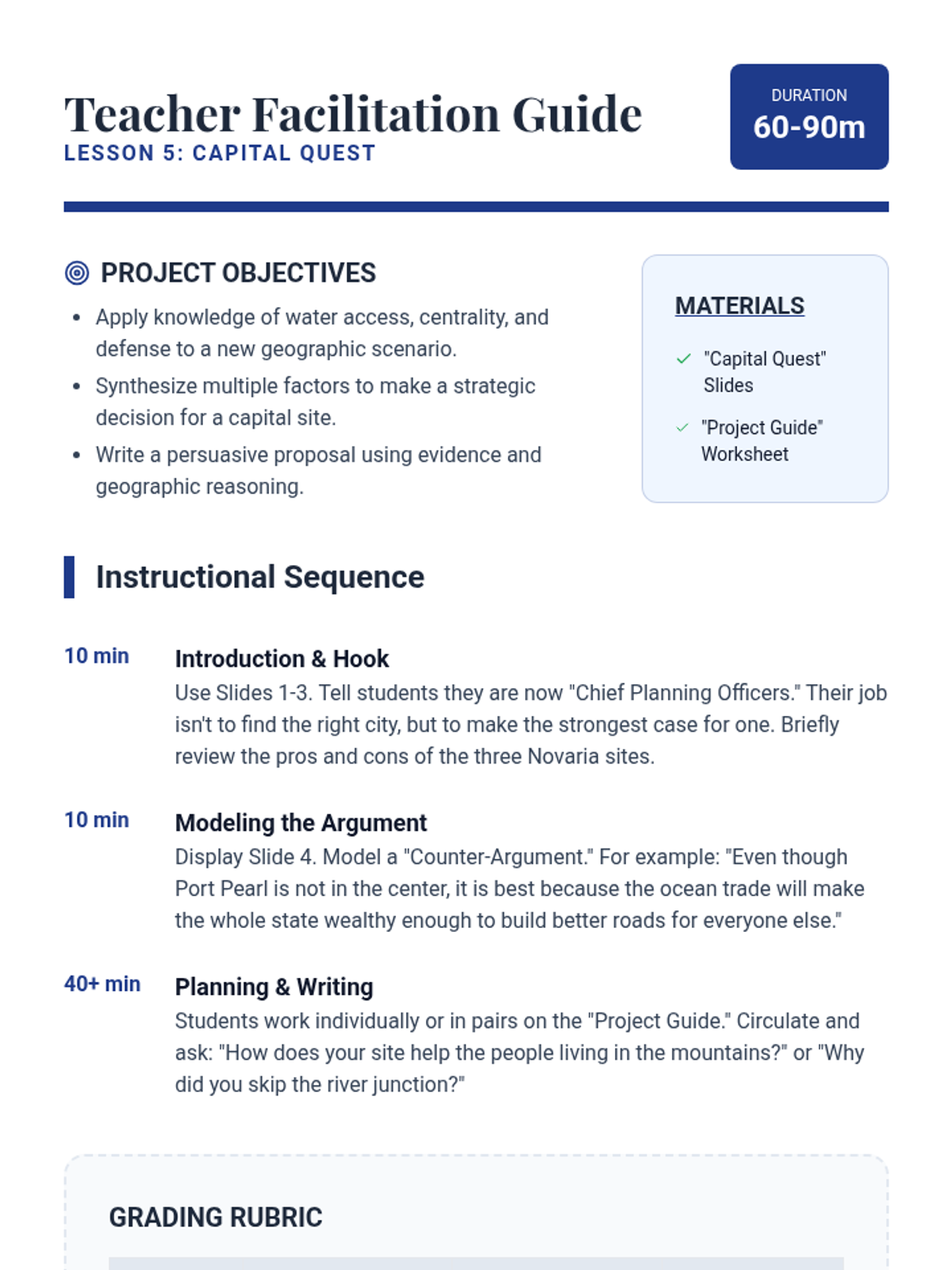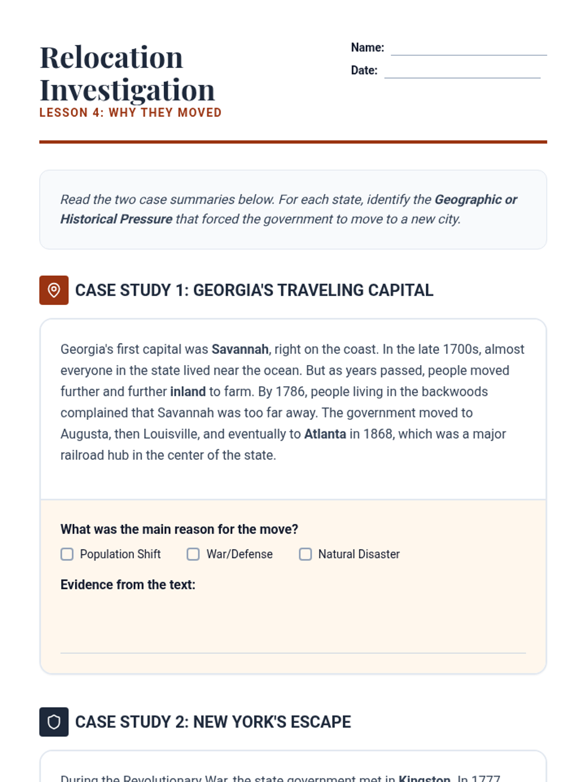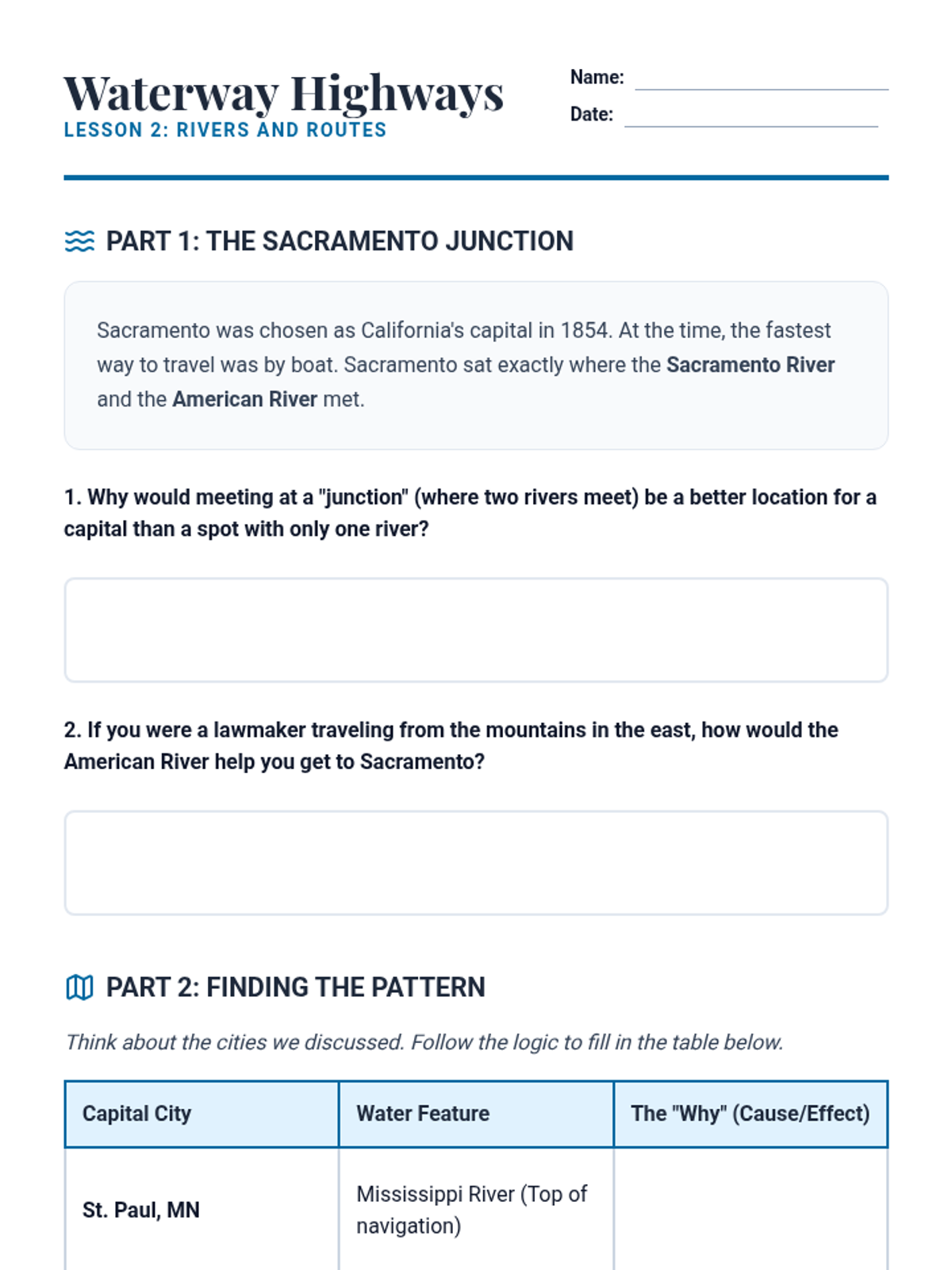 This inquiry-based geography sequence explores why state capitals are located where they are, focusing on geographic advantages, transportation, and historical context rather than rote memorization. Students analyze the distinction between economic hubs and political centers through data, maps, and simulations.