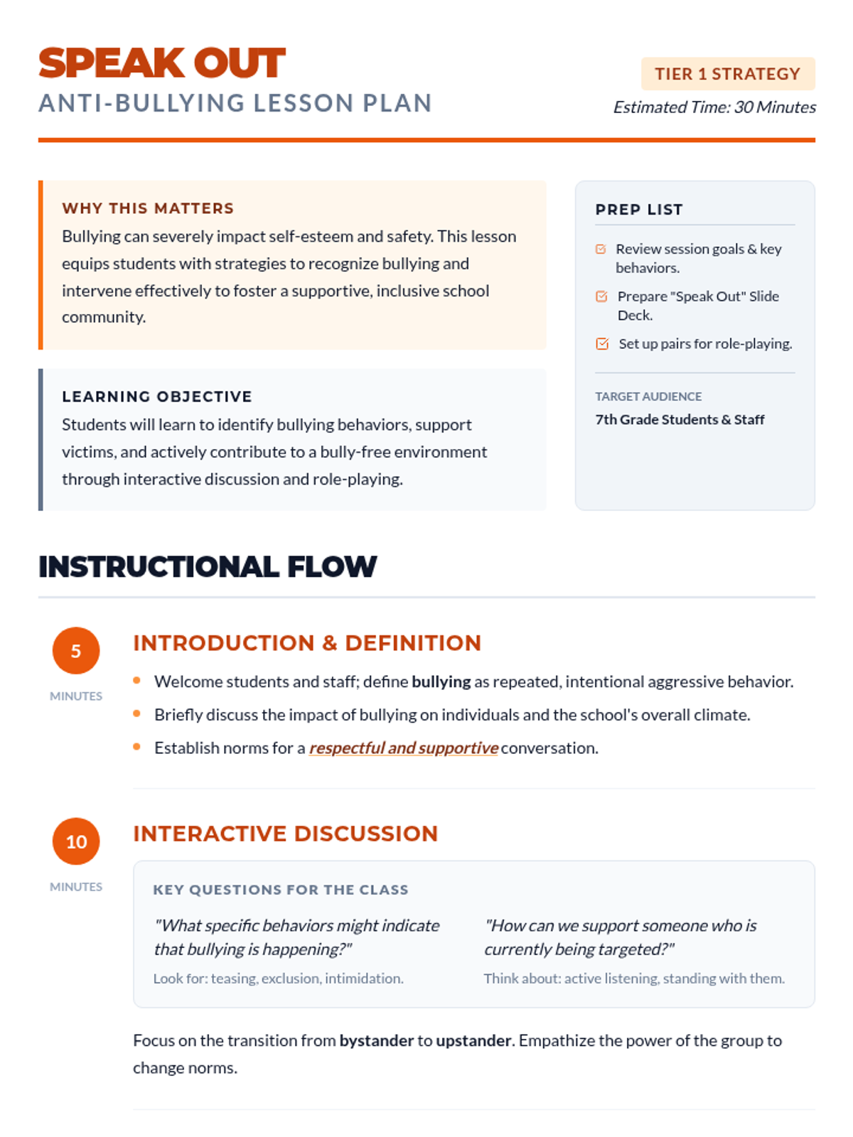A comprehensive two-part unit for 7th graders focused on creating a safe school culture through suicide prevention awareness and anti-bullying strategies. Students learn to recognize warning signs, provide empathetic support, and intervene effectively in bullying situations.