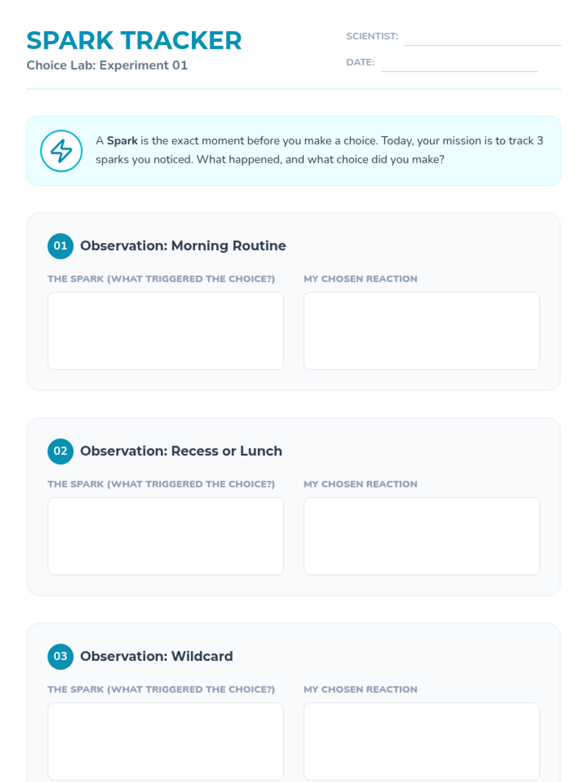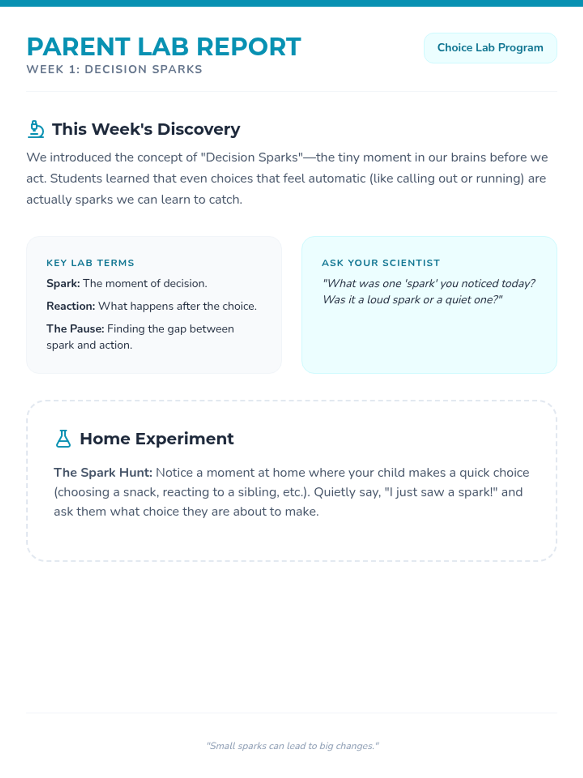 A 5-week social-emotional learning group for 4th graders focused on responsible decision-making, self-control, and social awareness. The program uses a "Choice Lab" theme to help students experiment with and refine their behavior in social settings.