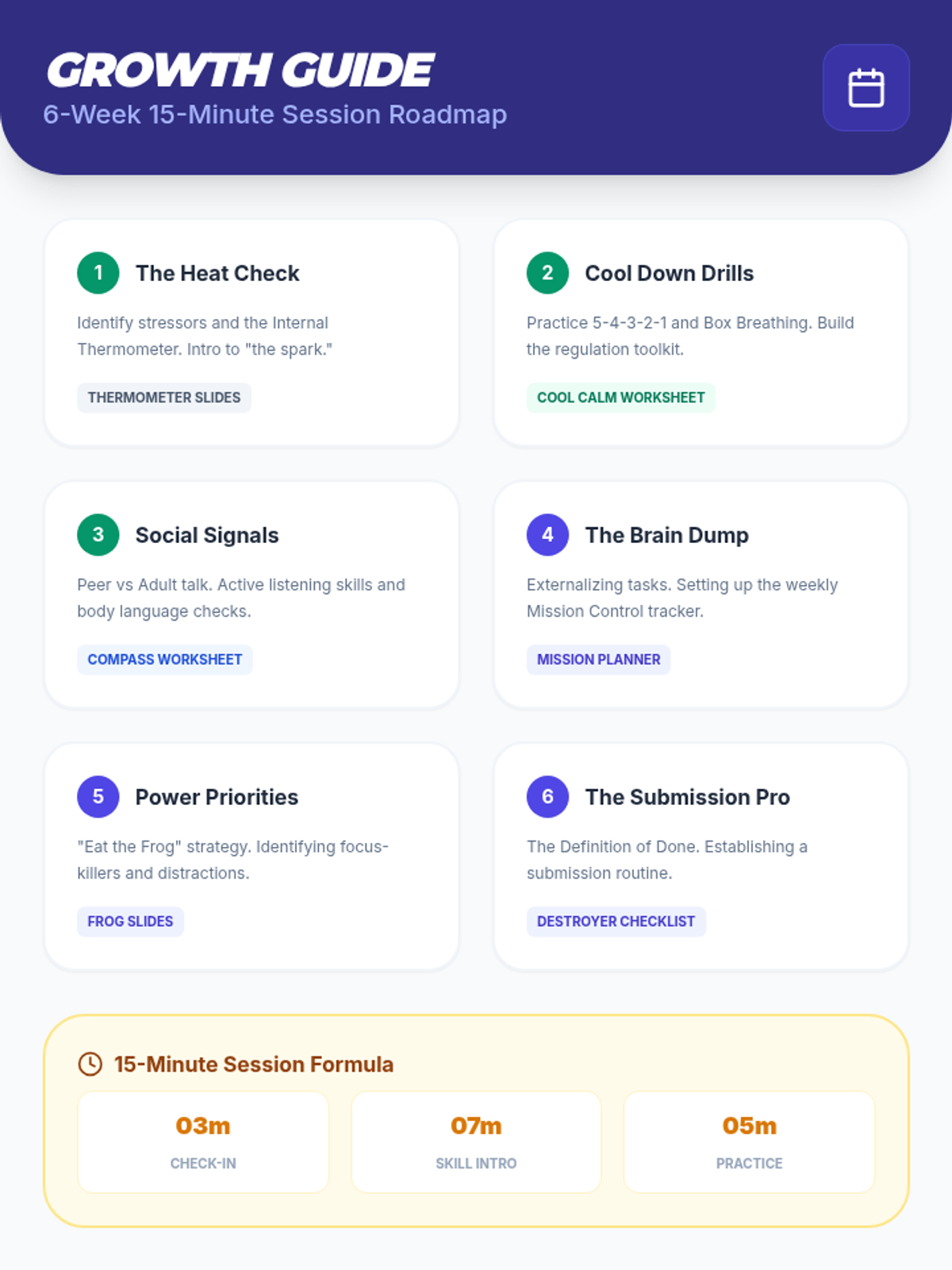 A comprehensive individual counseling program designed to equip students with essential social-emotional and academic organizational skills. The program focuses on self-regulation, effective communication, and structured task management.