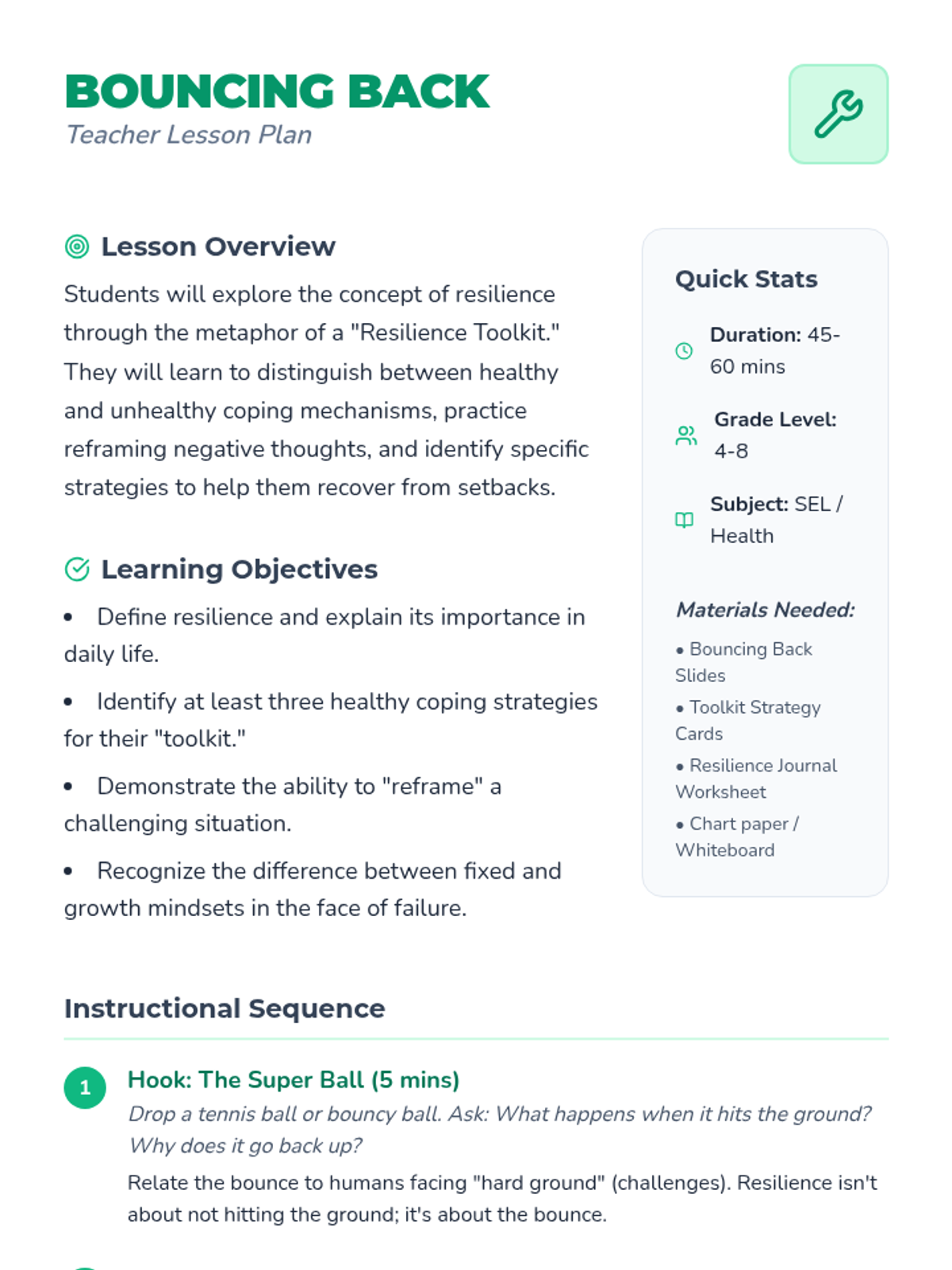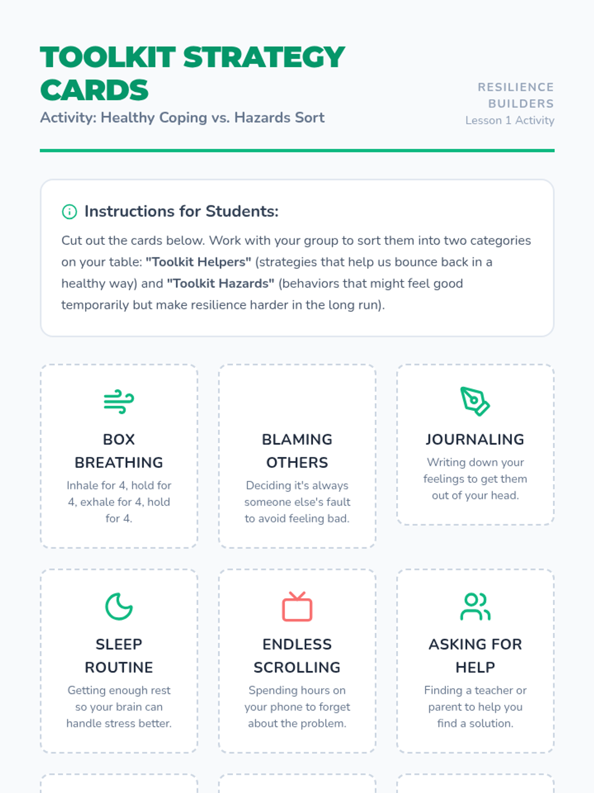 A series of lessons designed to help students identify, understand, and manage intense emotions through healthy coping strategies. Students will learn to recognize physical emotional cues and build a personalized toolkit of resilience strategies.