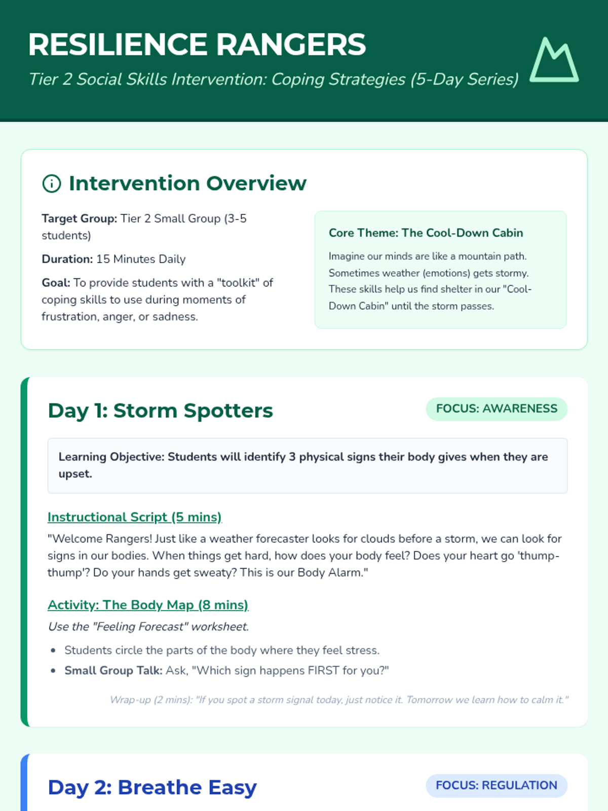 A 5-day Tier 2 social skills intervention focused on developing and practicing coping strategies for managing difficult emotions and situations. Students learn to recognize physical warning signs, use breathing and grounding techniques, and employ positive self-talk through interactive role-plays and games.