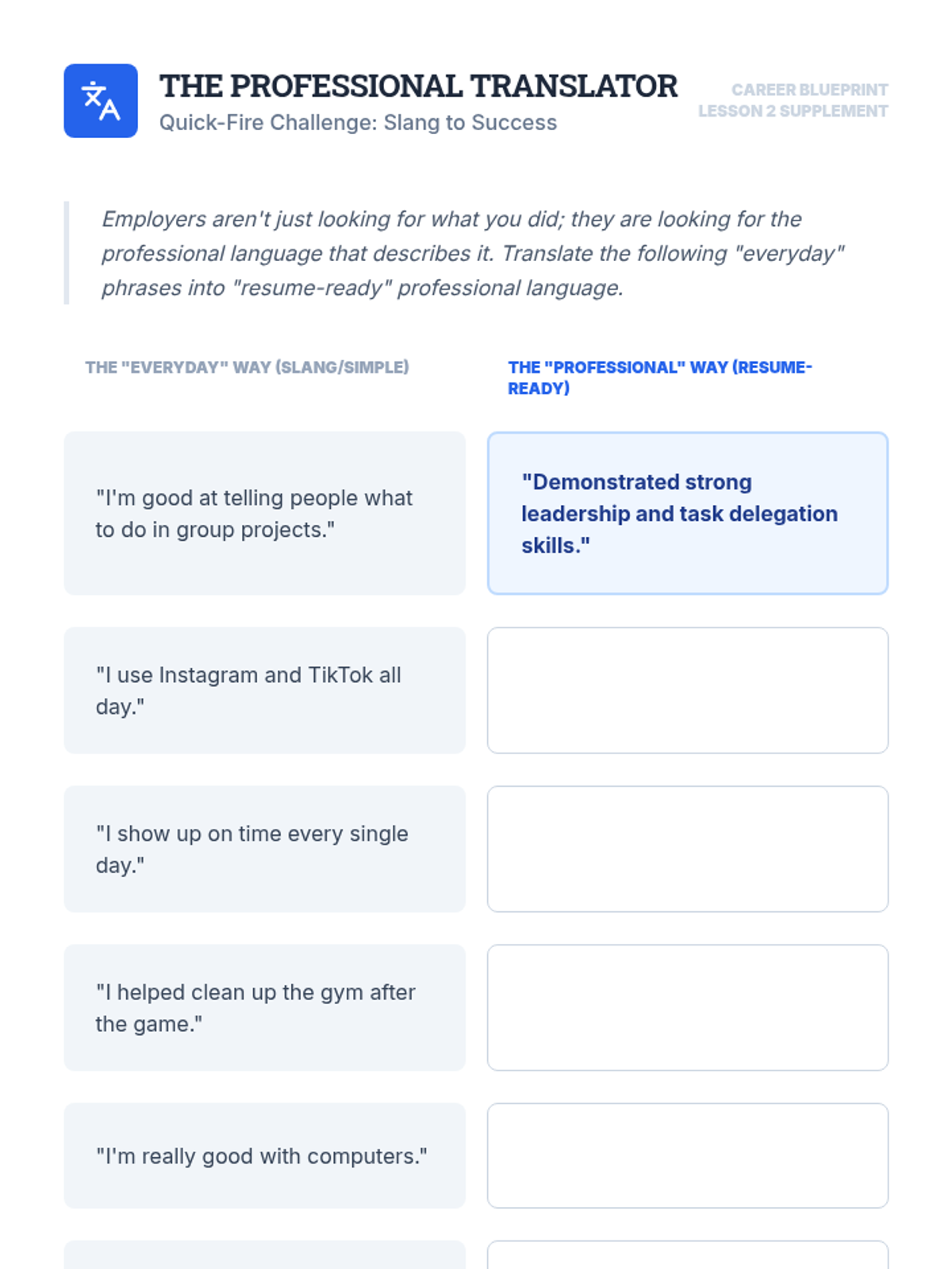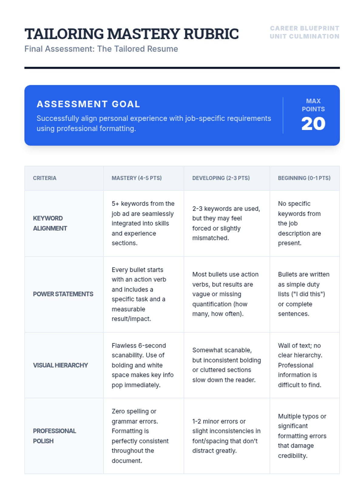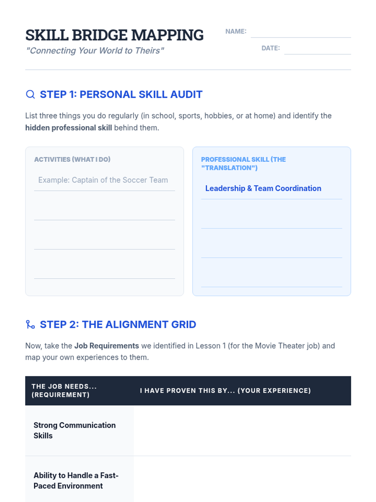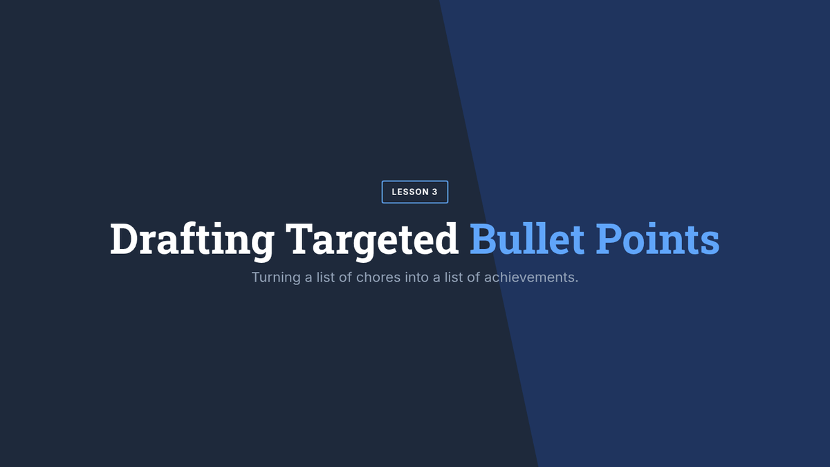 This sequence guides students through deconstructing job postings to create aligned resume content. Students learn to identify requirements, translate personal experiences into professional language, and draft high-impact bullet points, culminating in a tailored resume for a specific role.
