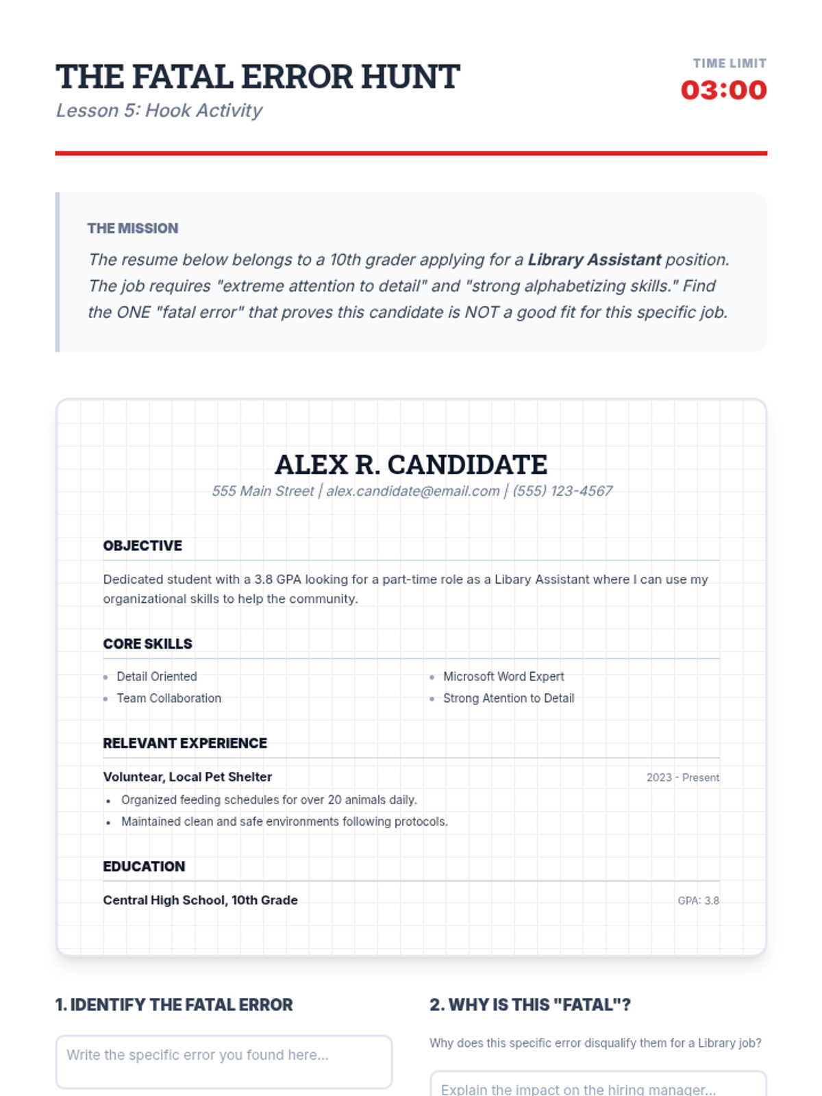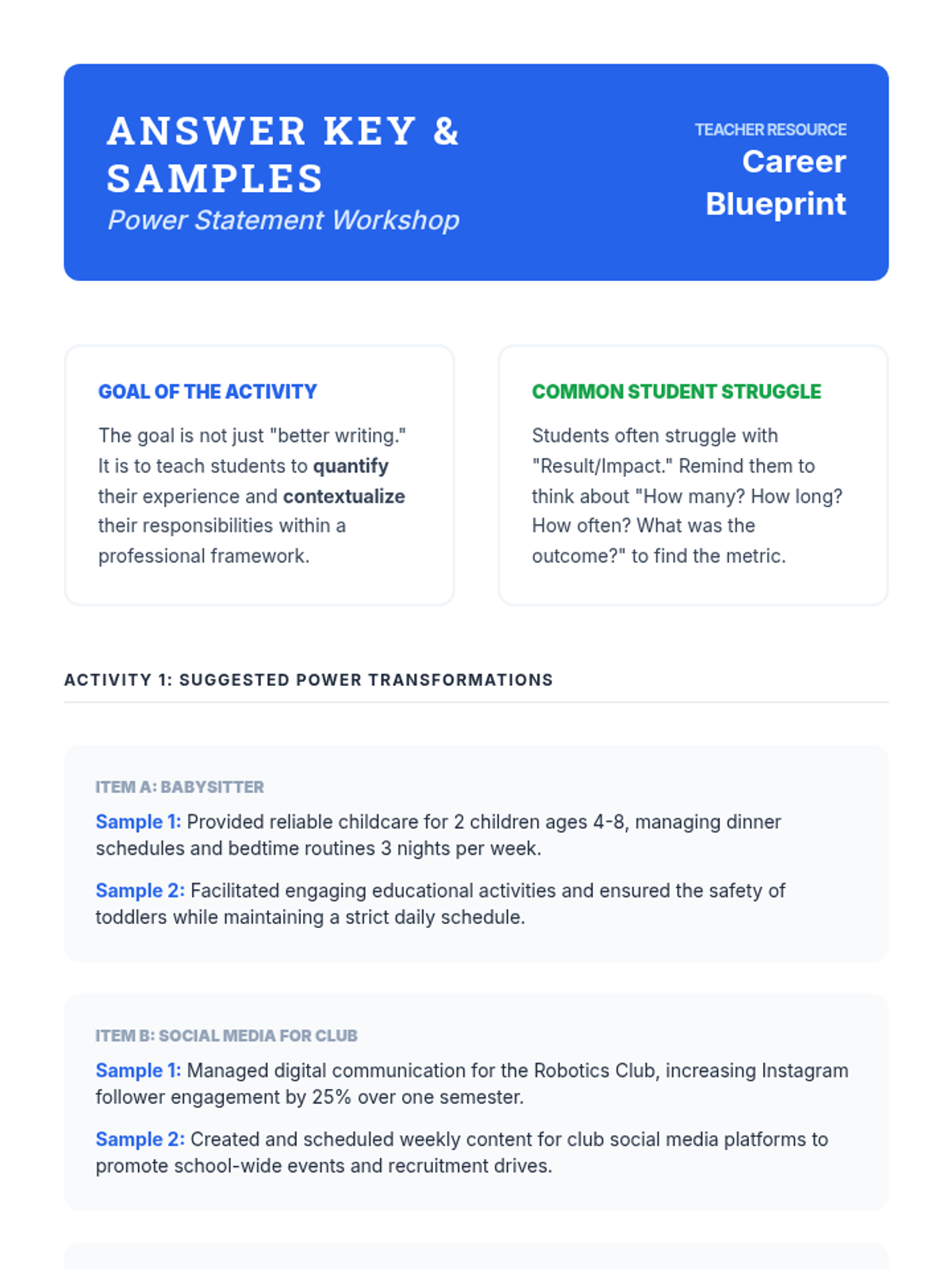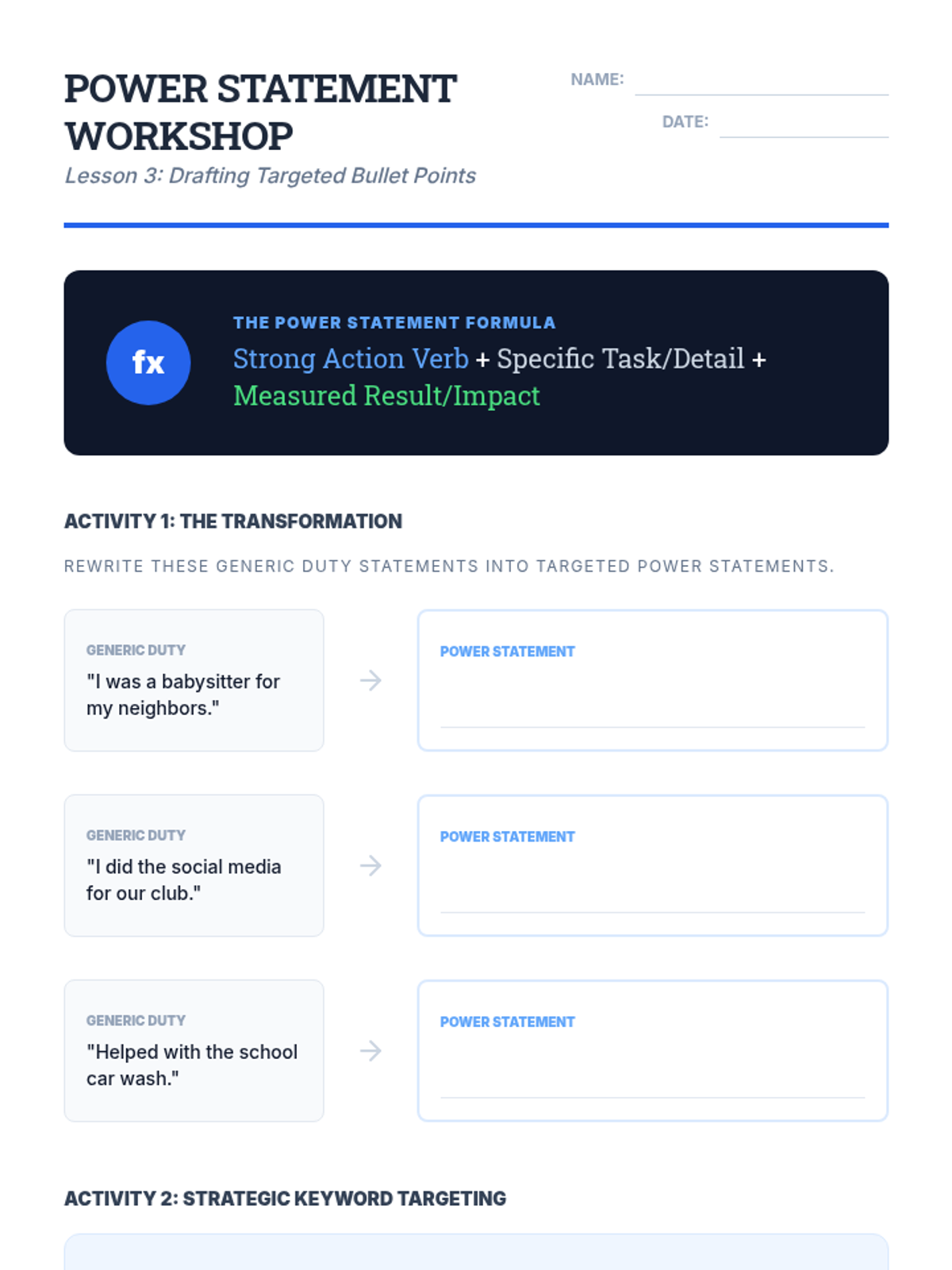 This sequence guides students through deconstructing job postings to create aligned resume content. Students learn to identify requirements, translate personal experiences into professional language, and draft high-impact bullet points, culminating in a tailored resume for a specific role.