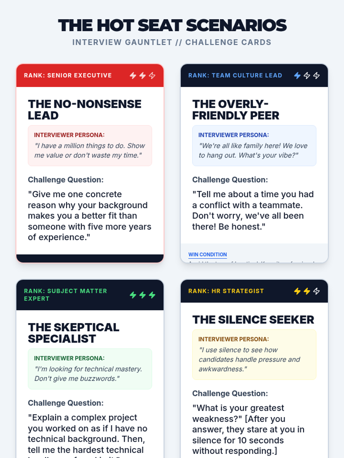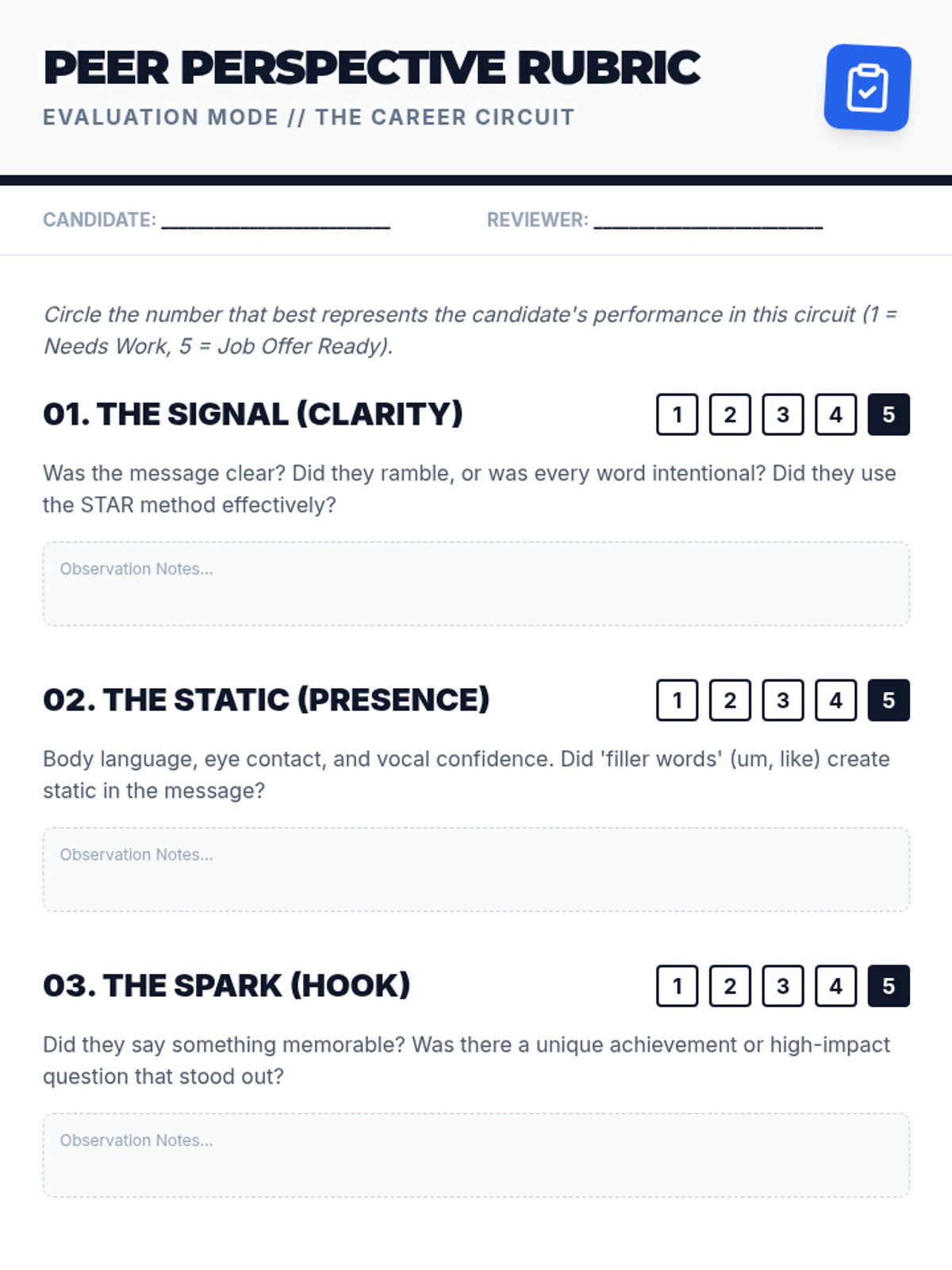 A comprehensive role-playing experience designed for adult learners and college students to master the art of networking and professional interviewing. The sequence uses a 'circuit' theme, guiding students through high-stakes scenarios and peer feedback loops.