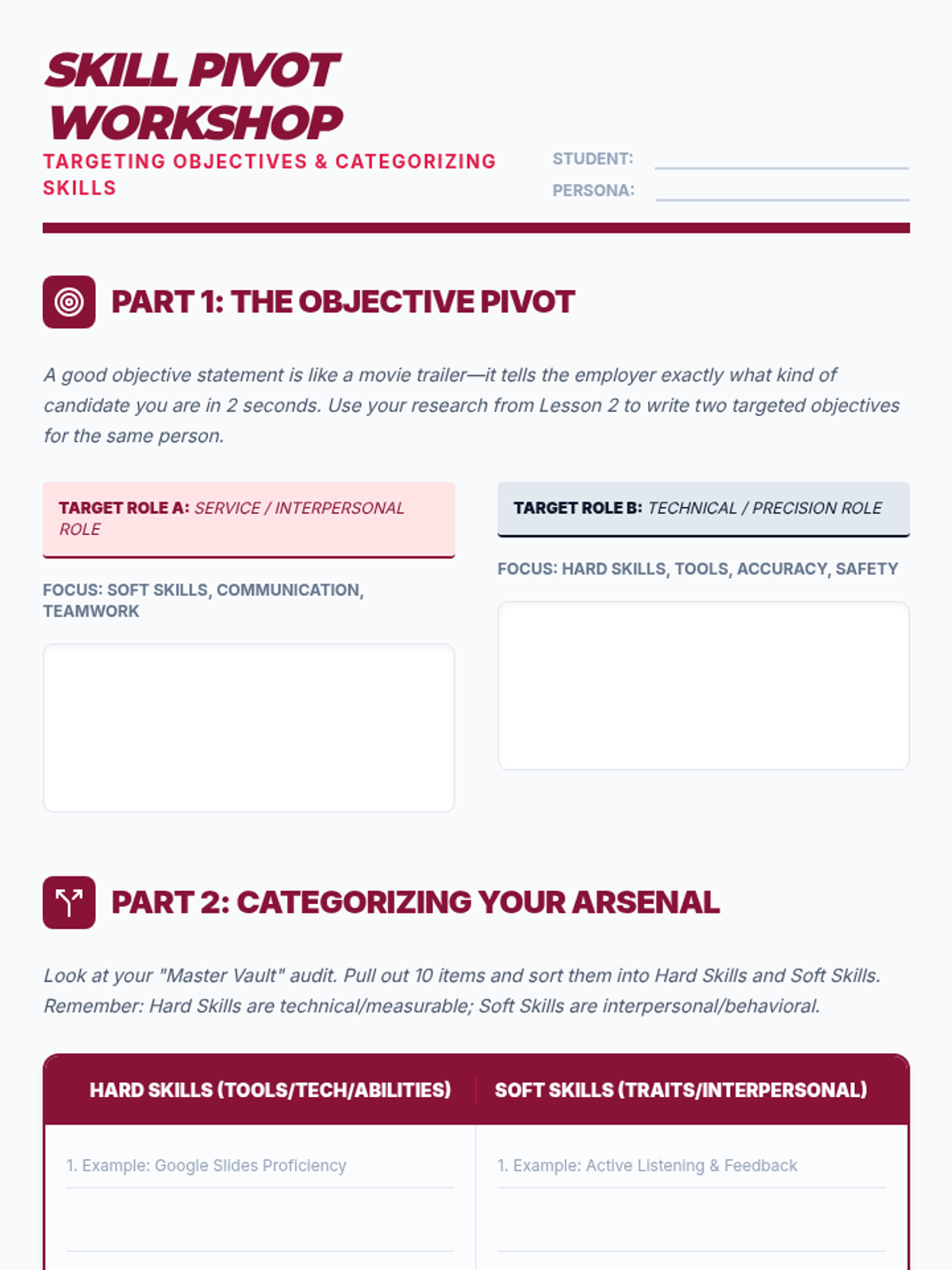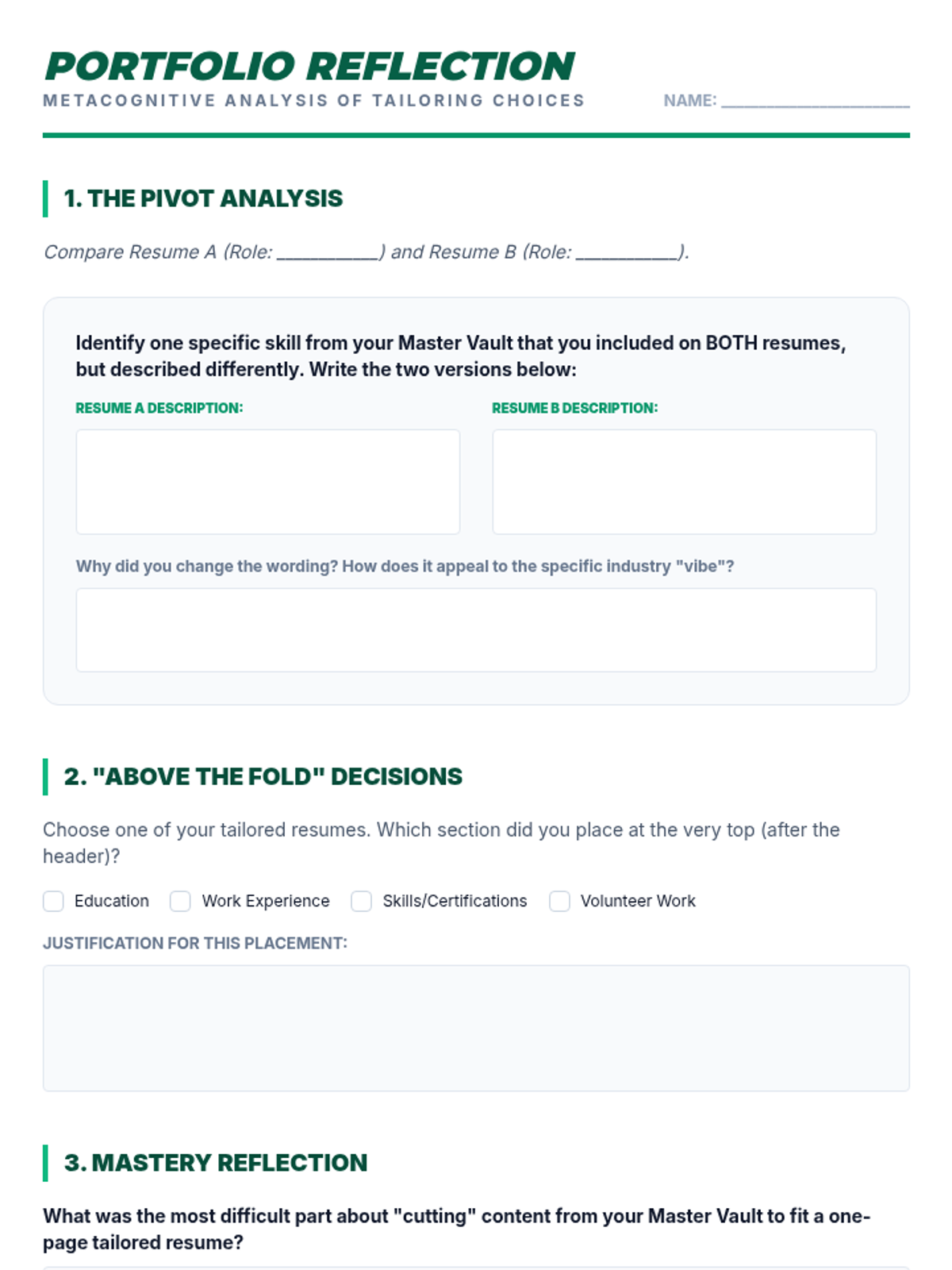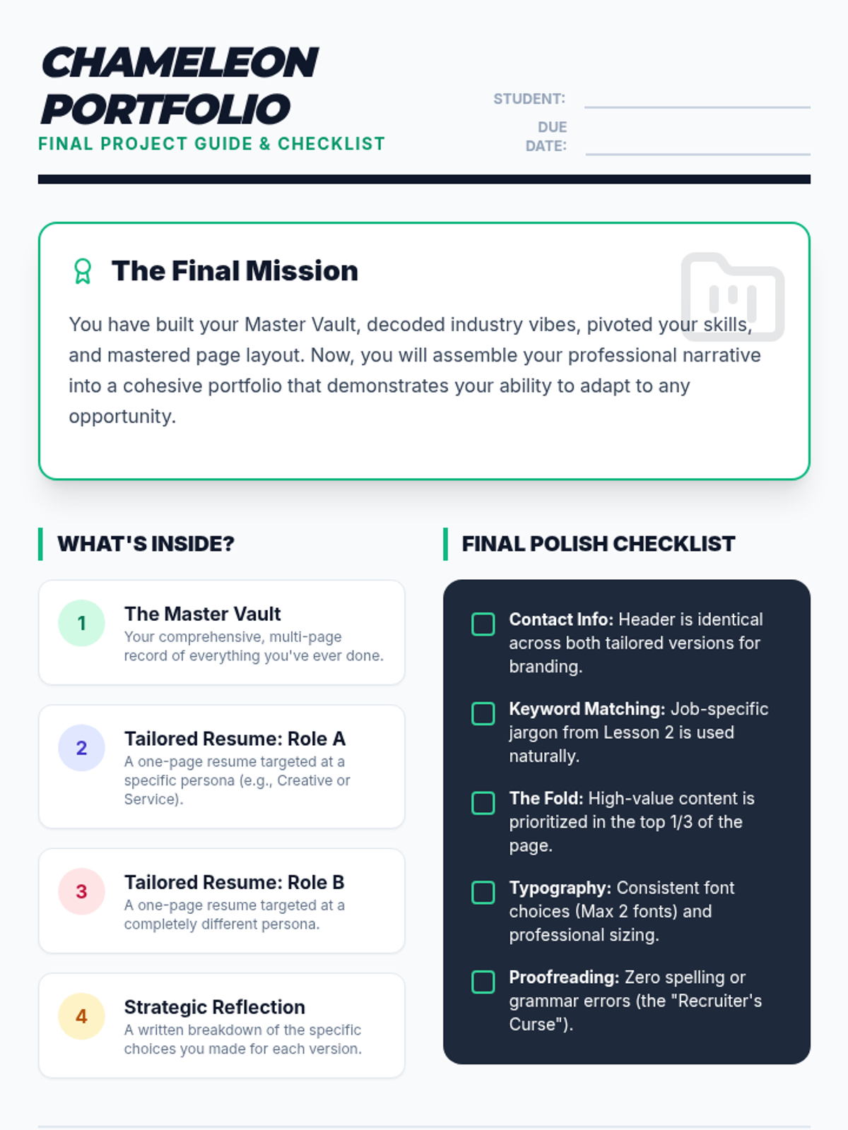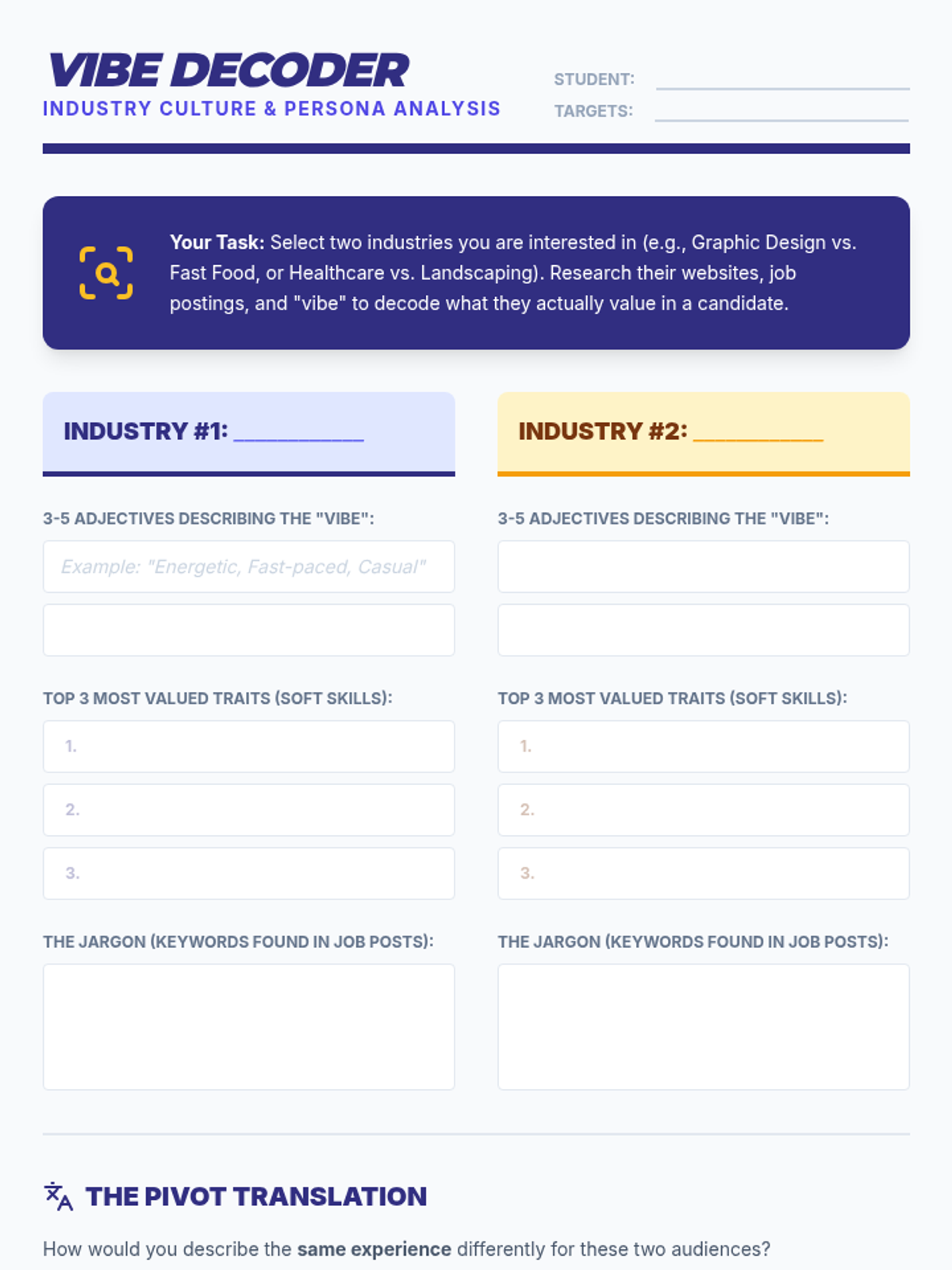 A project-based unit where 10th-grade students learn to adapt their professional narrative by creating a master resume and tailoring versions for diverse industries. Students explore industry cultures, differentiate between soft and hard skills, and strategically organize content to appeal to specific employers.