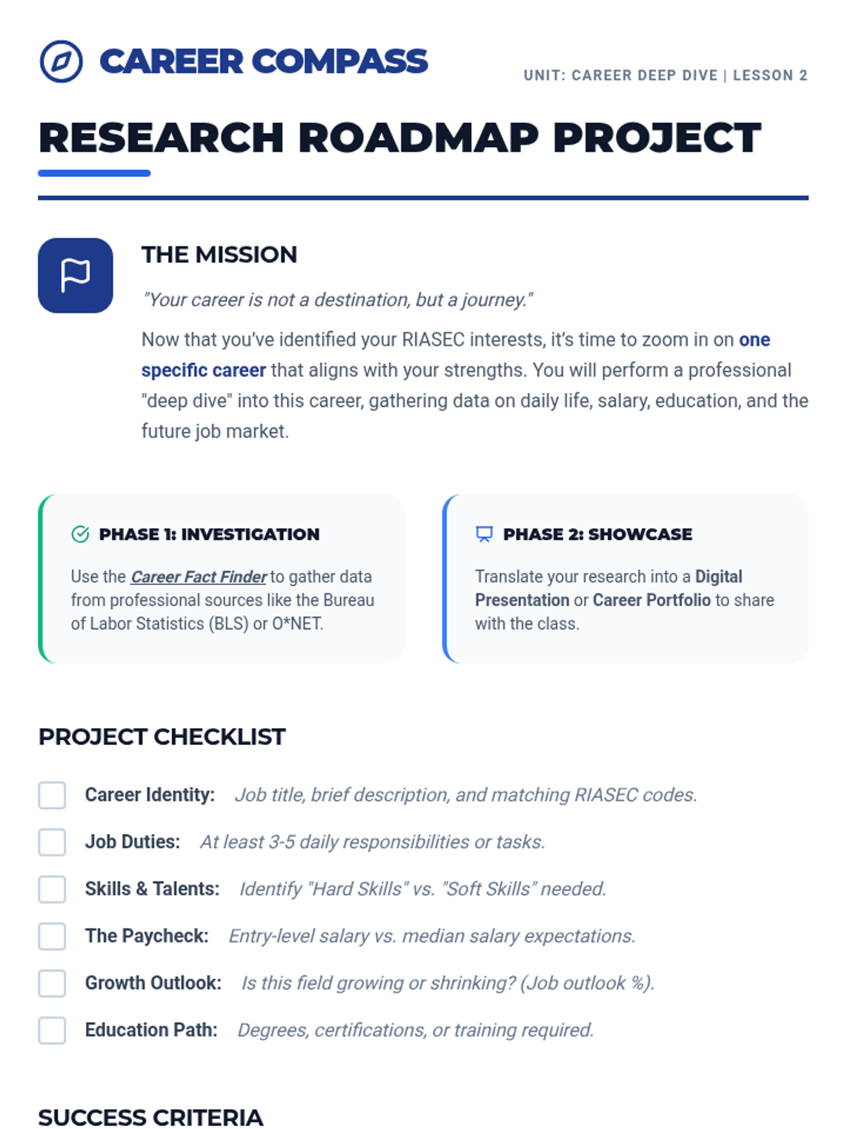 A comprehensive career exploration unit for 10th graders that moves from self-discovery via interest inventories to in-depth career research and final professional presentations.