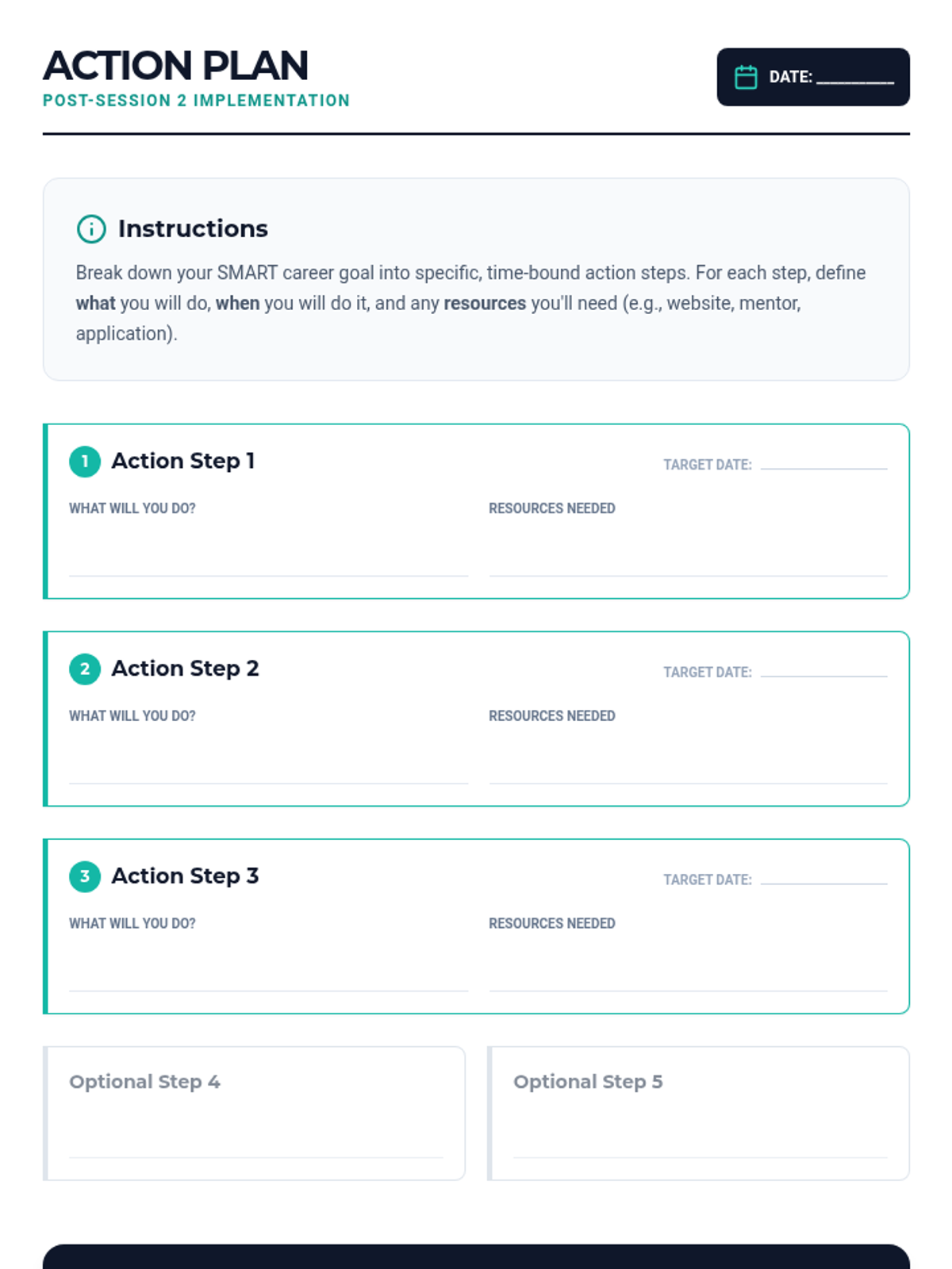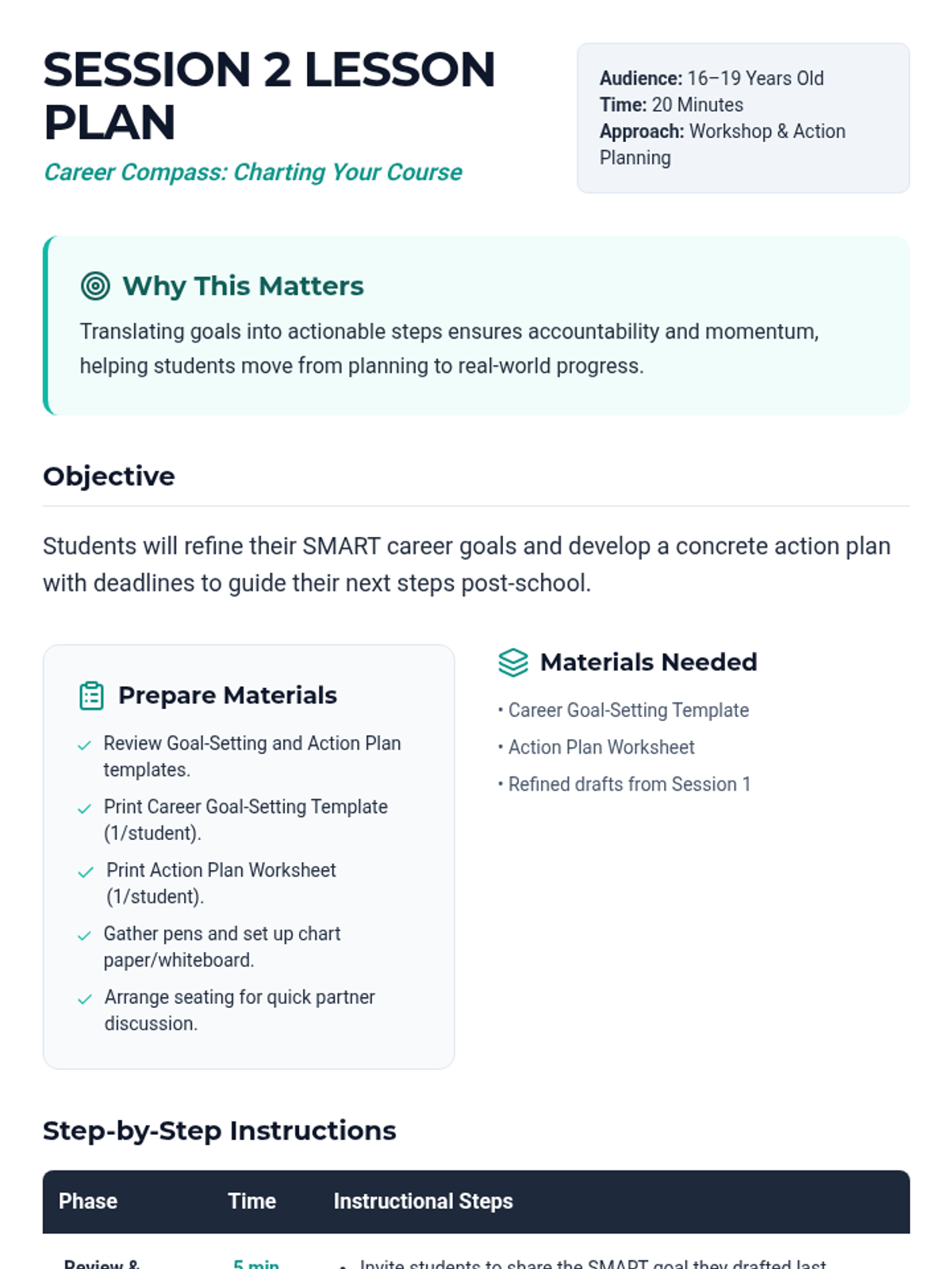 A two-session career planning course for 16-19 year olds focusing on self-assessment, goal setting, and creating actionable career plans. Students explore their strengths and interests to navigate their postsecondary journey with confidence.