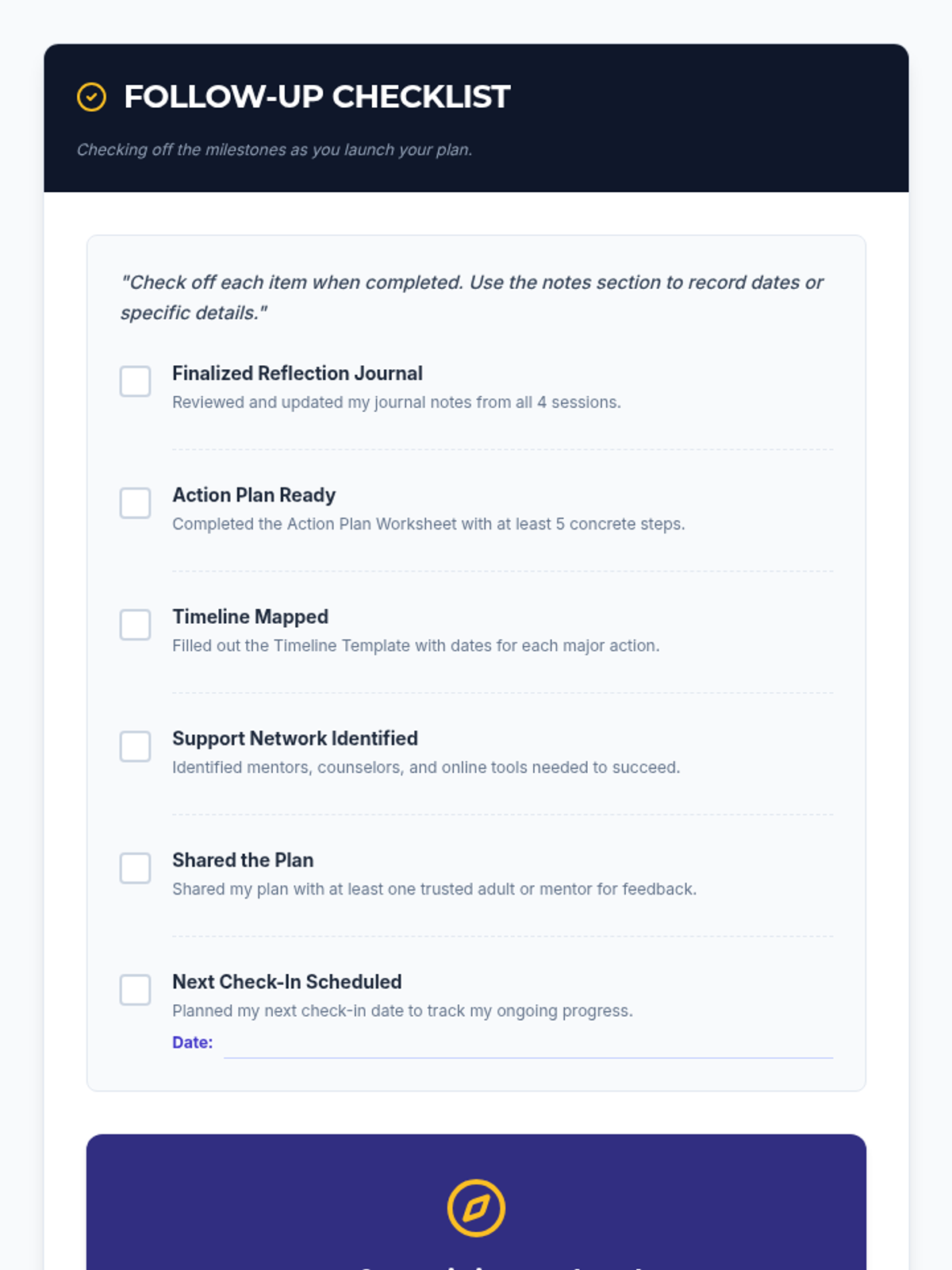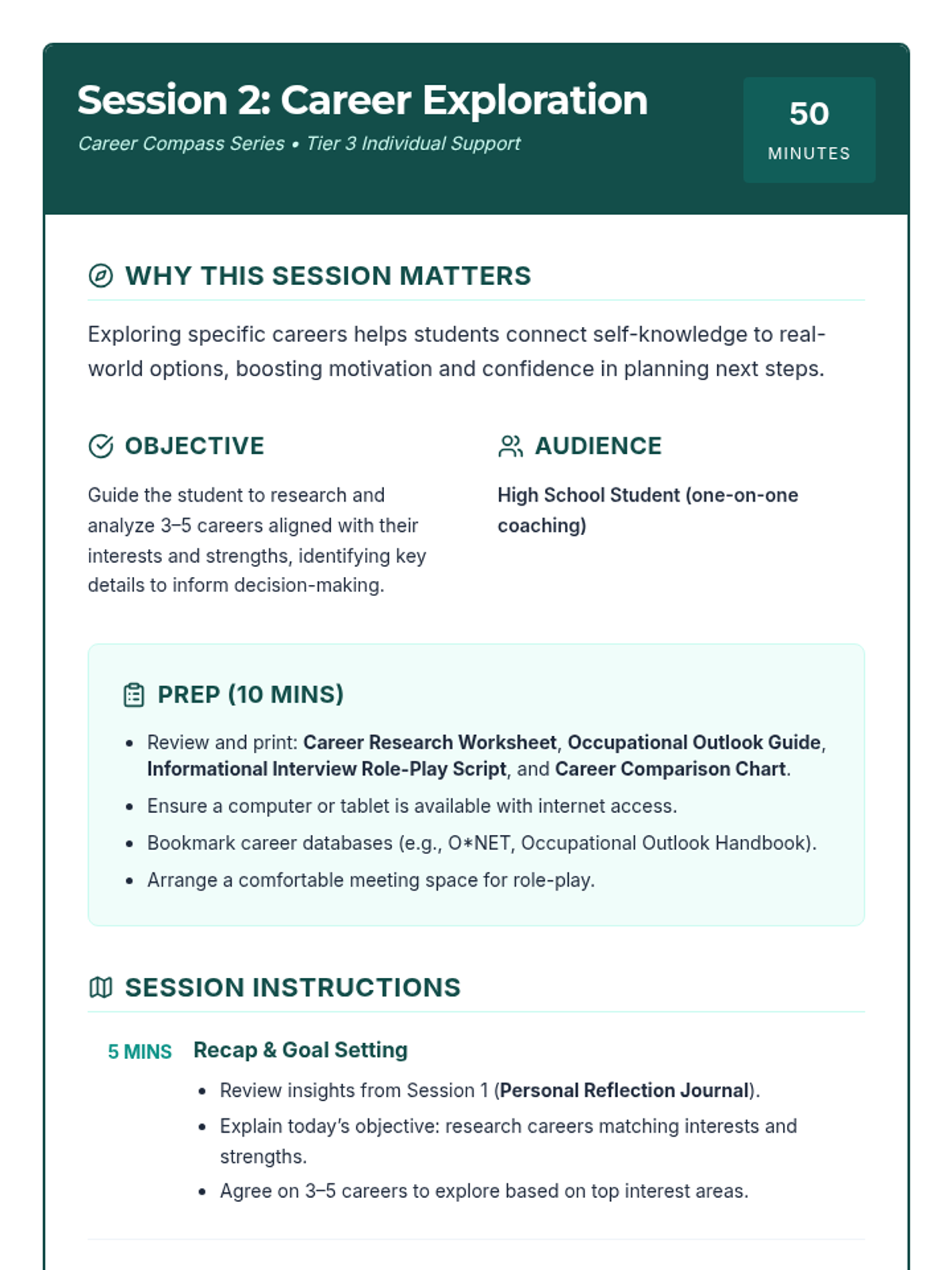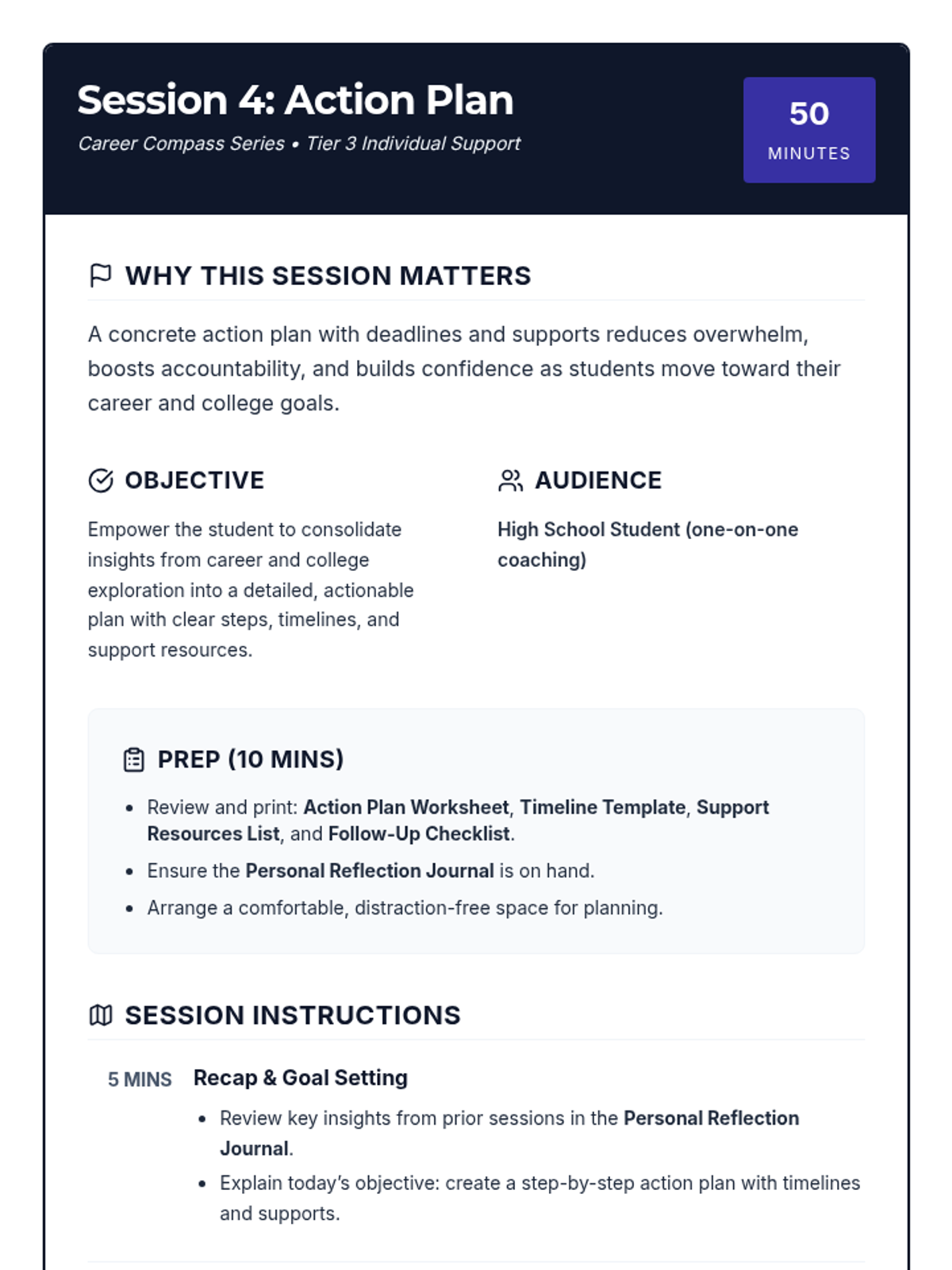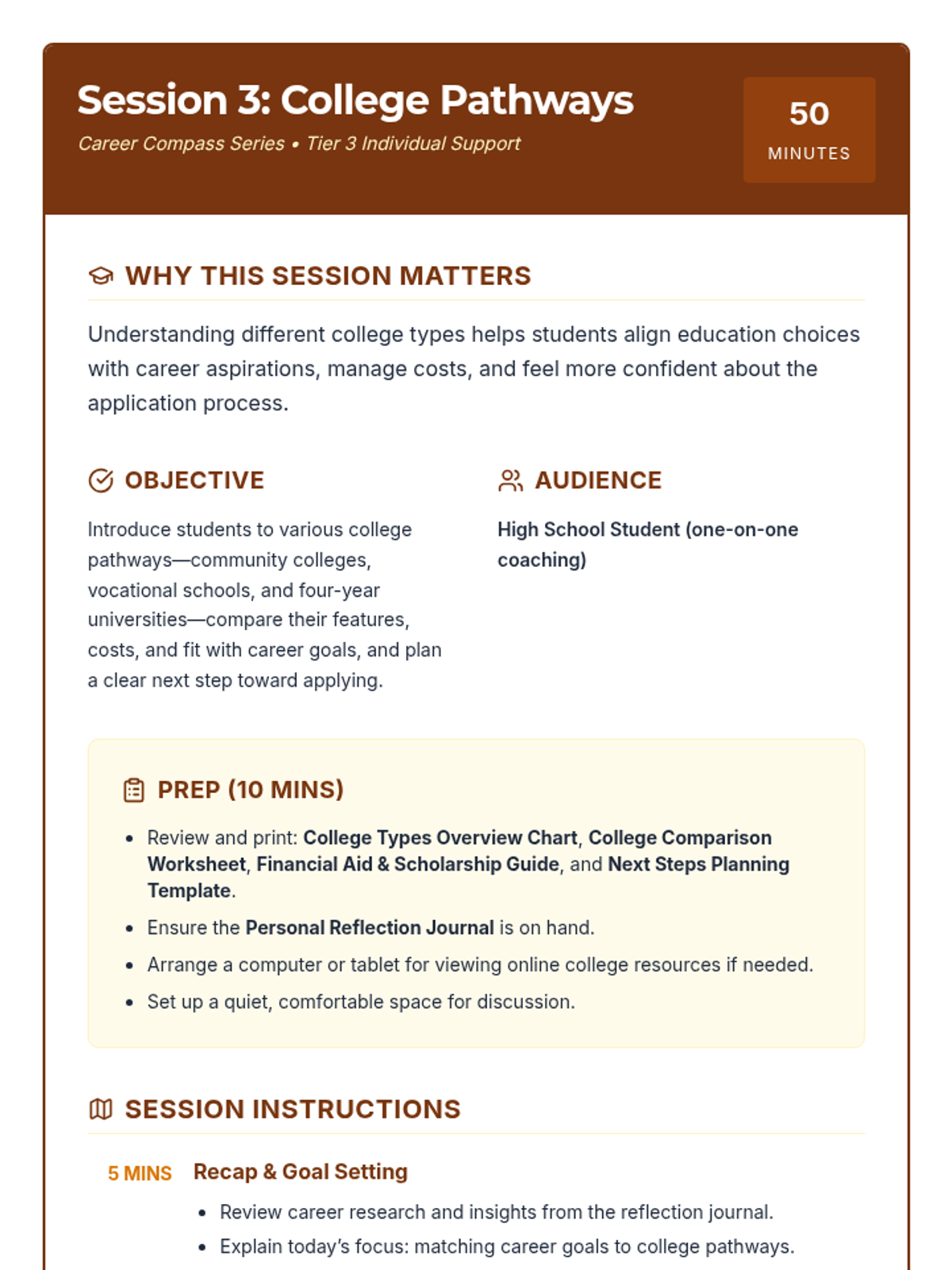 A four-session personalized coaching series designed to help students with low motivation and self-esteem explore career options and college types. Through guided activities, self-reflection, and research, students will build confidence in making informed decisions.