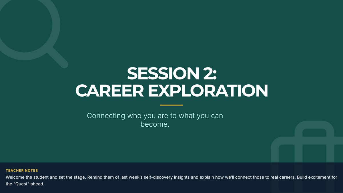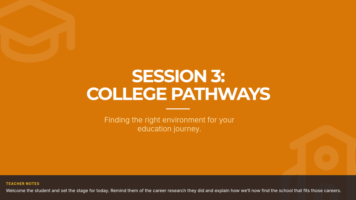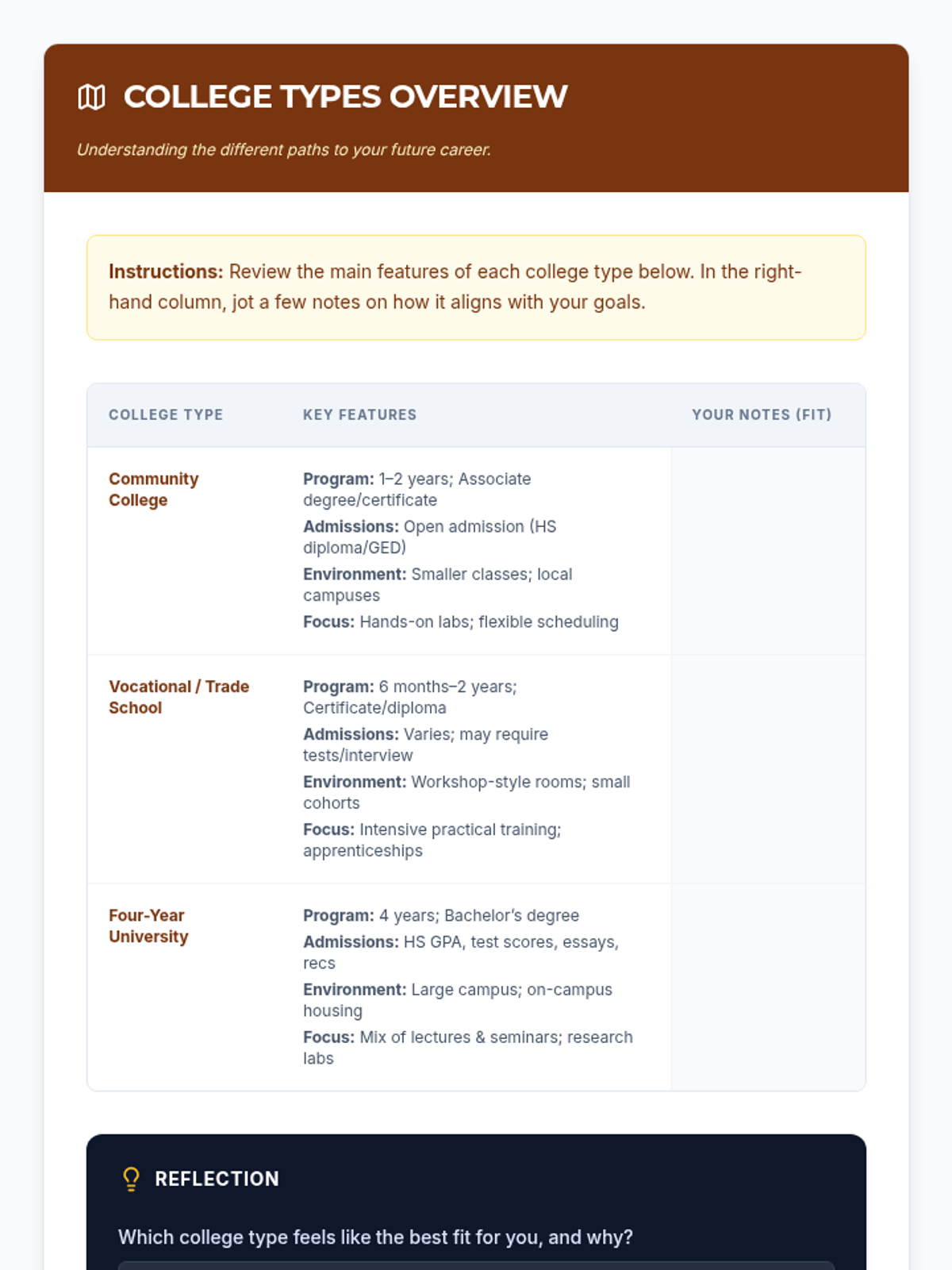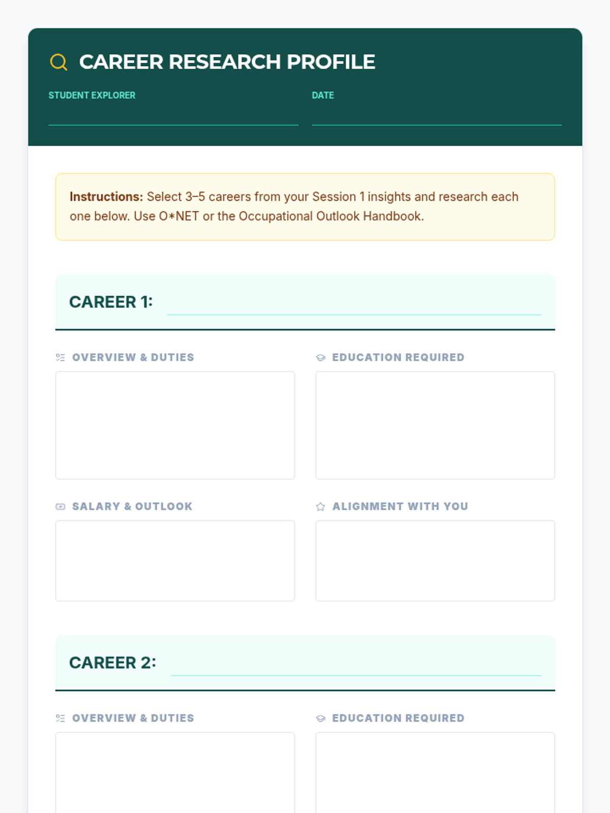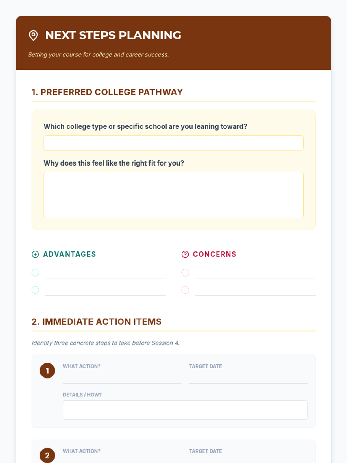 A four-session personalized coaching series designed to help students with low motivation and self-esteem explore career options and college types. Through guided activities, self-reflection, and research, students will build confidence in making informed decisions.