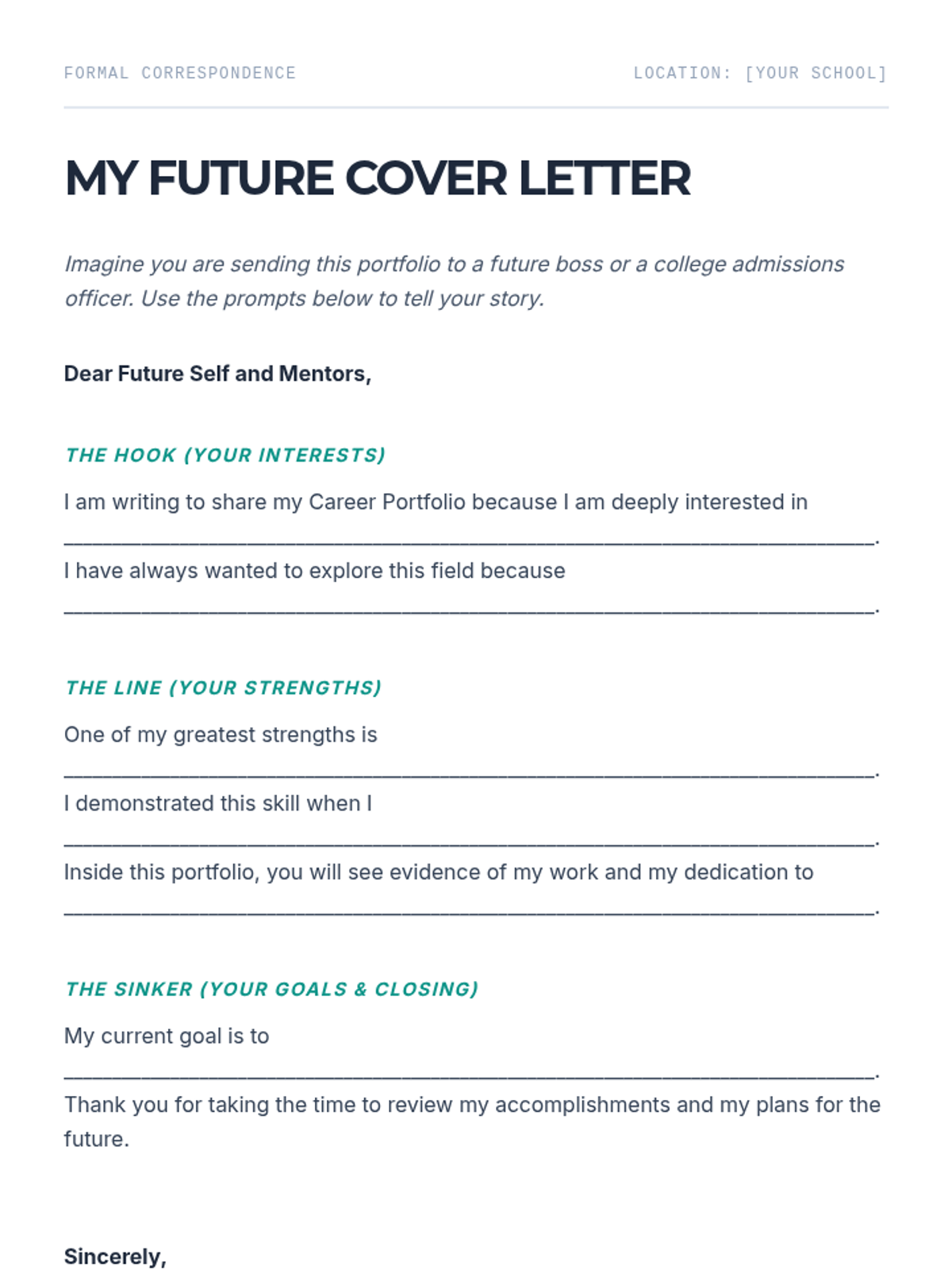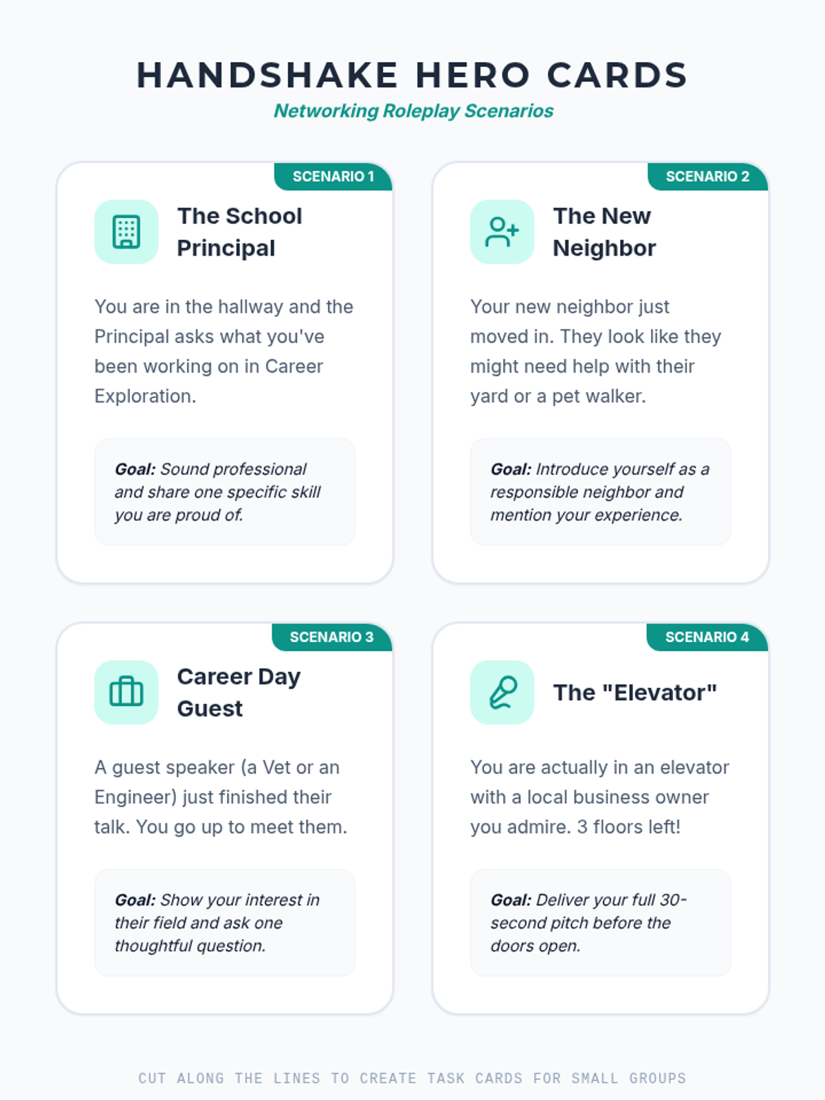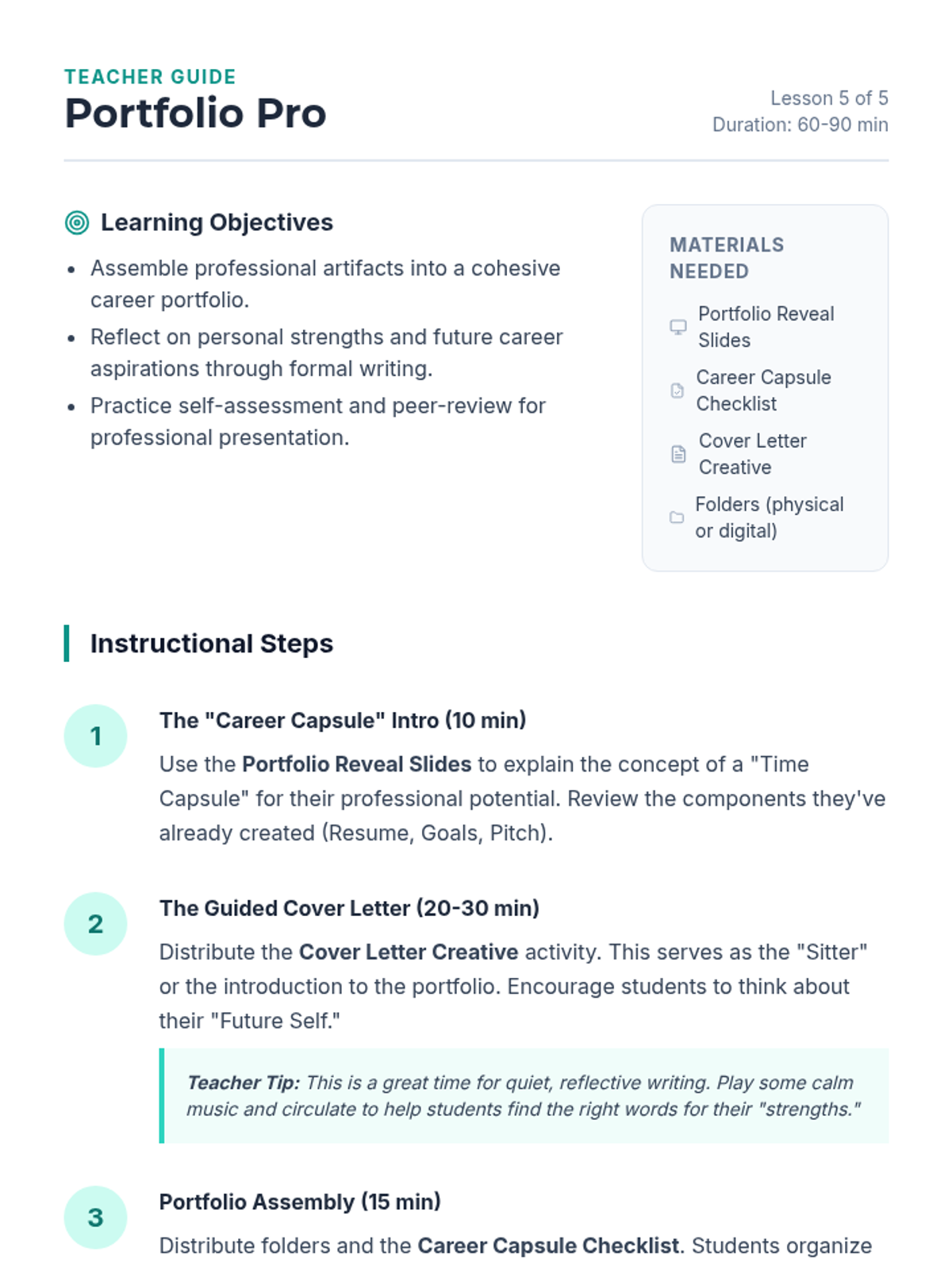 A comprehensive career exploration unit for 5th graders, guiding them from understanding professional documentation to building a complete career portfolio. Students learn to translate their current activities into skills, practice networking, and set SMART goals for their future.