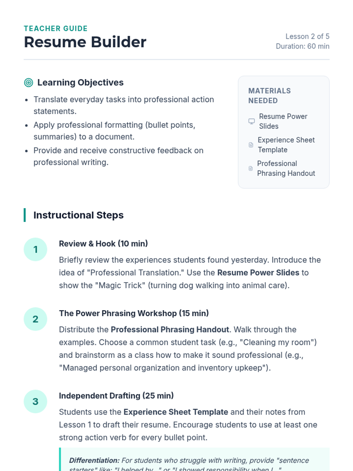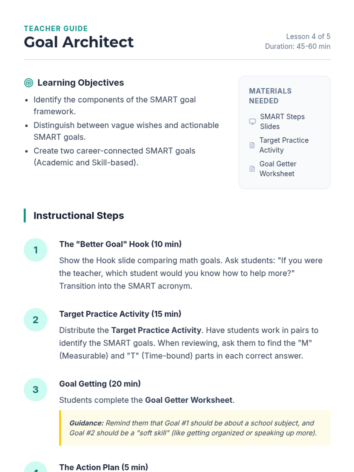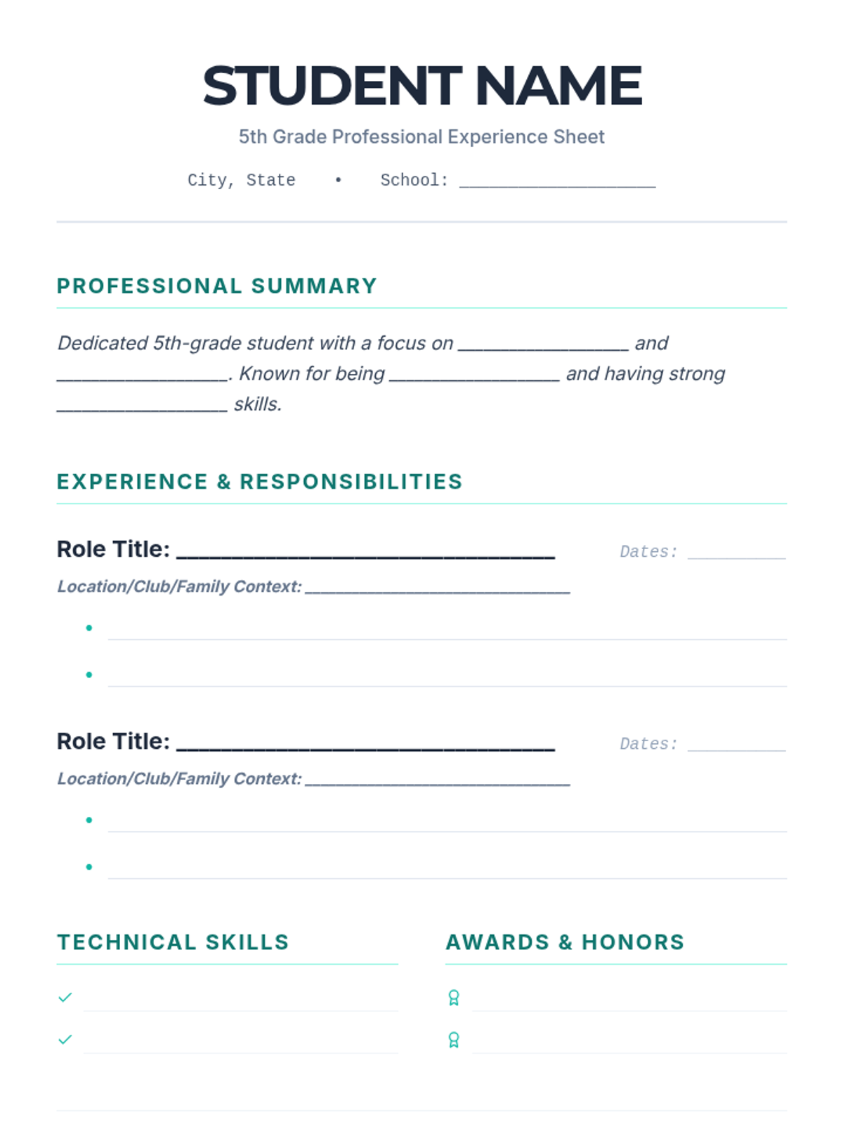 A comprehensive career exploration unit for 5th graders, guiding them from understanding professional documentation to building a complete career portfolio. Students learn to translate their current activities into skills, practice networking, and set SMART goals for their future.