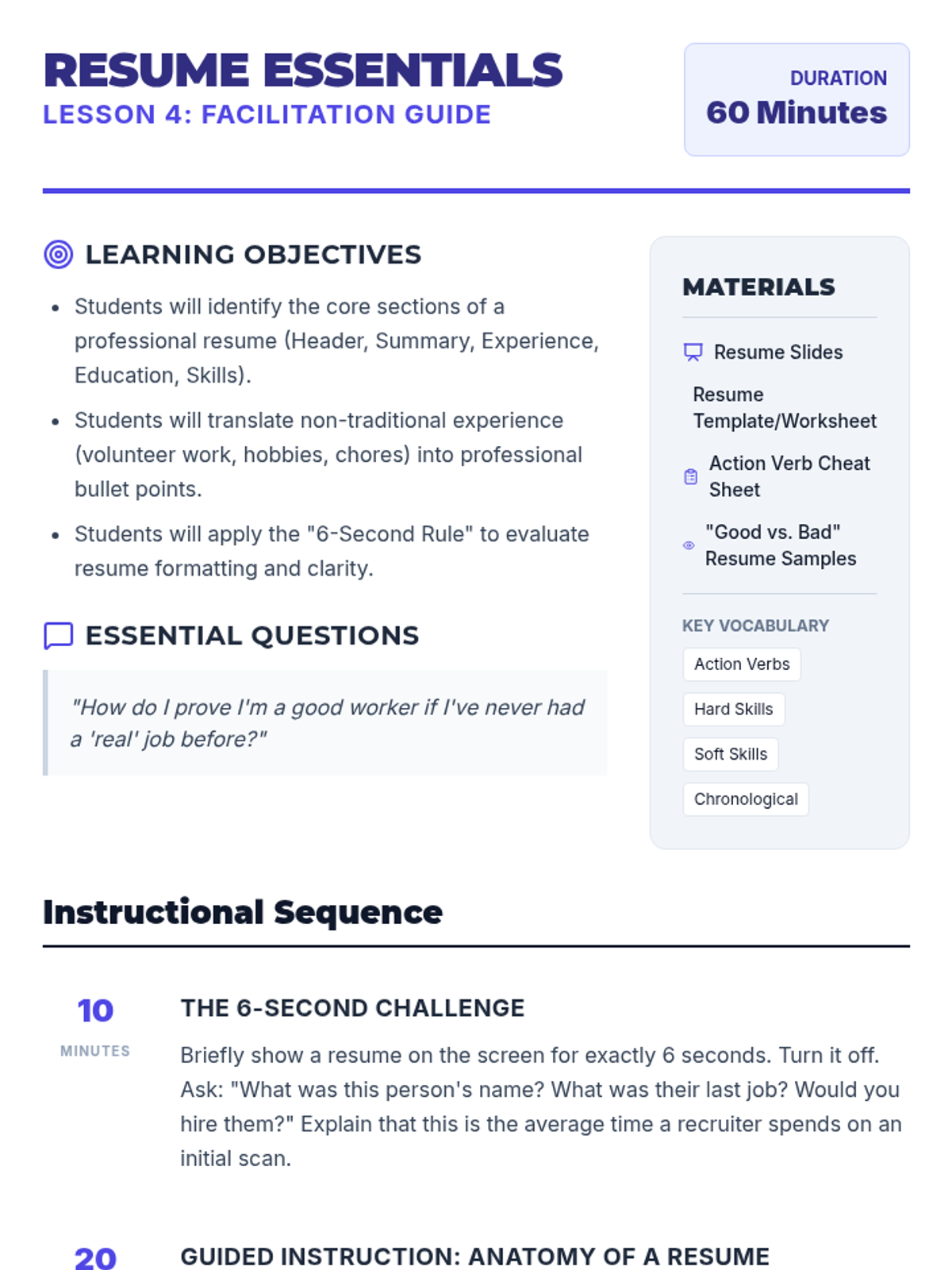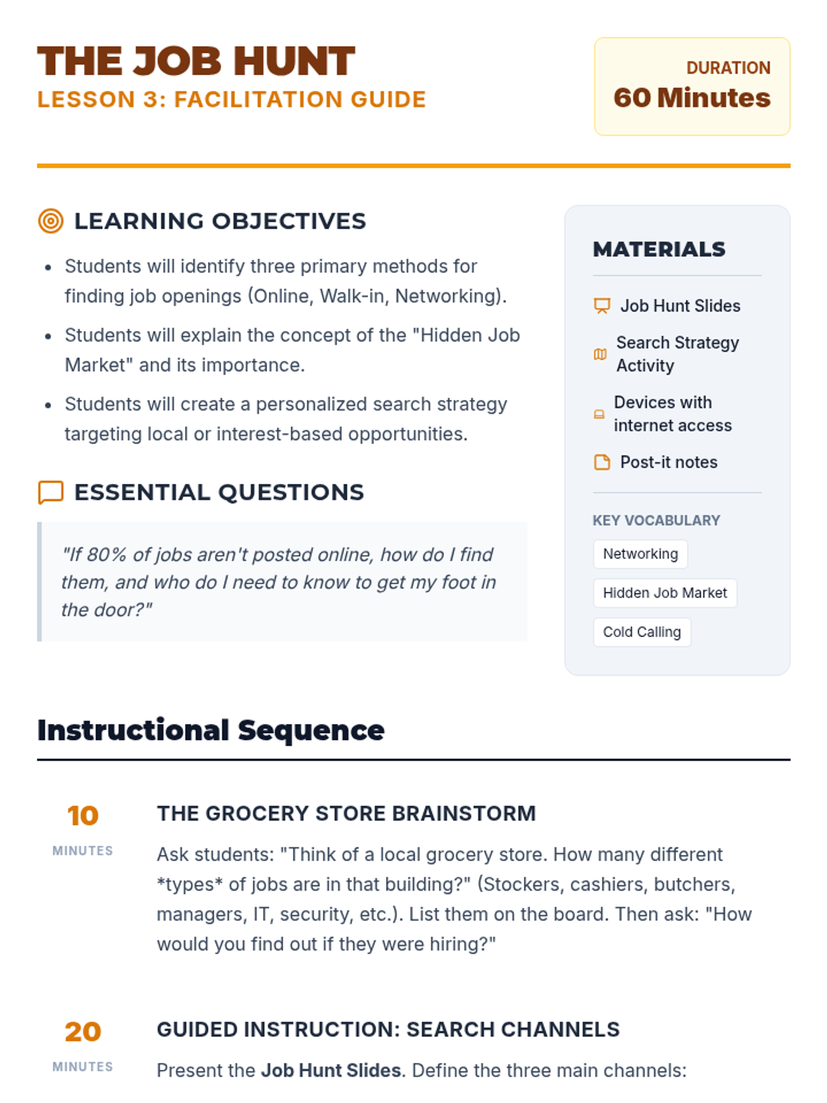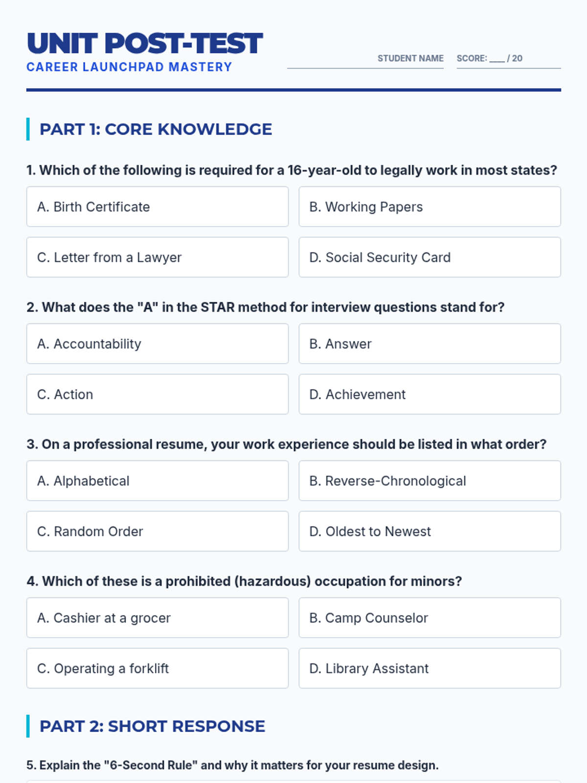 An 8-week comprehensive unit designed to prepare high school students for entering the workforce, covering everything from legal working papers and job applications to interview techniques and long-term career planning.