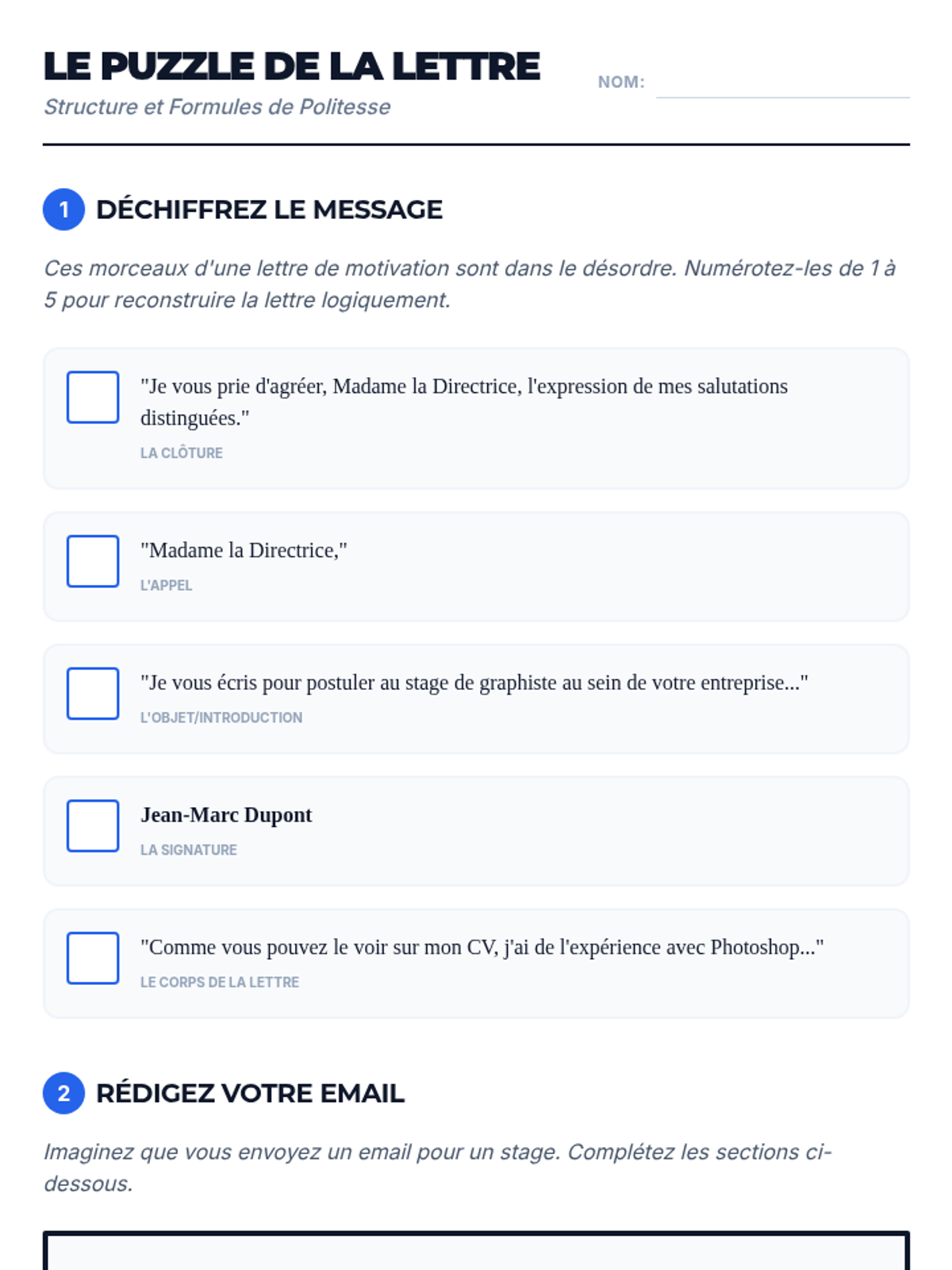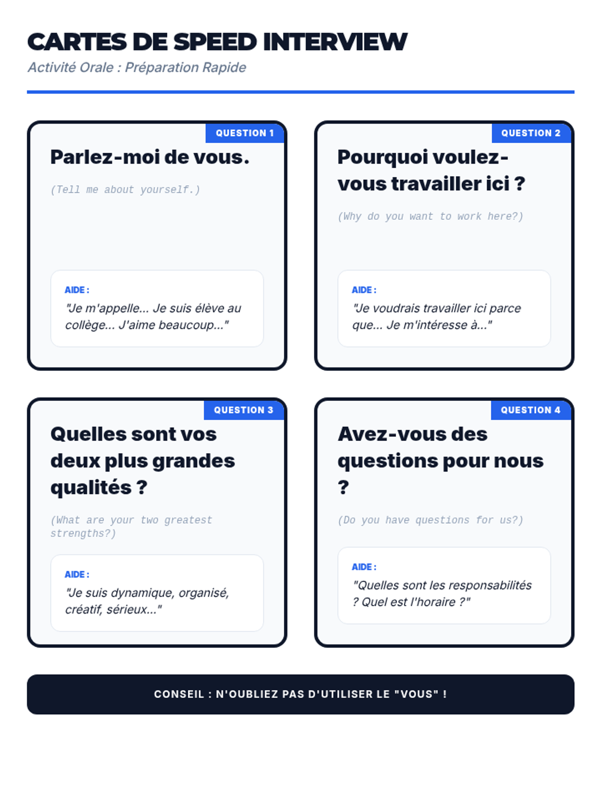 An immersive sequence where 8th-grade students master intermediate French professional vocabulary, formal communication strategies, and cultural workplace etiquette through simulated career scenarios.