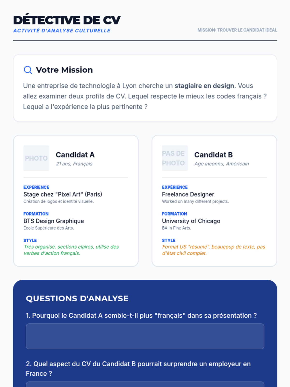 A beginner French listening sequence where students act as social observers, analyzing registers, personal details, family structures, and preferences through auditory scripts.