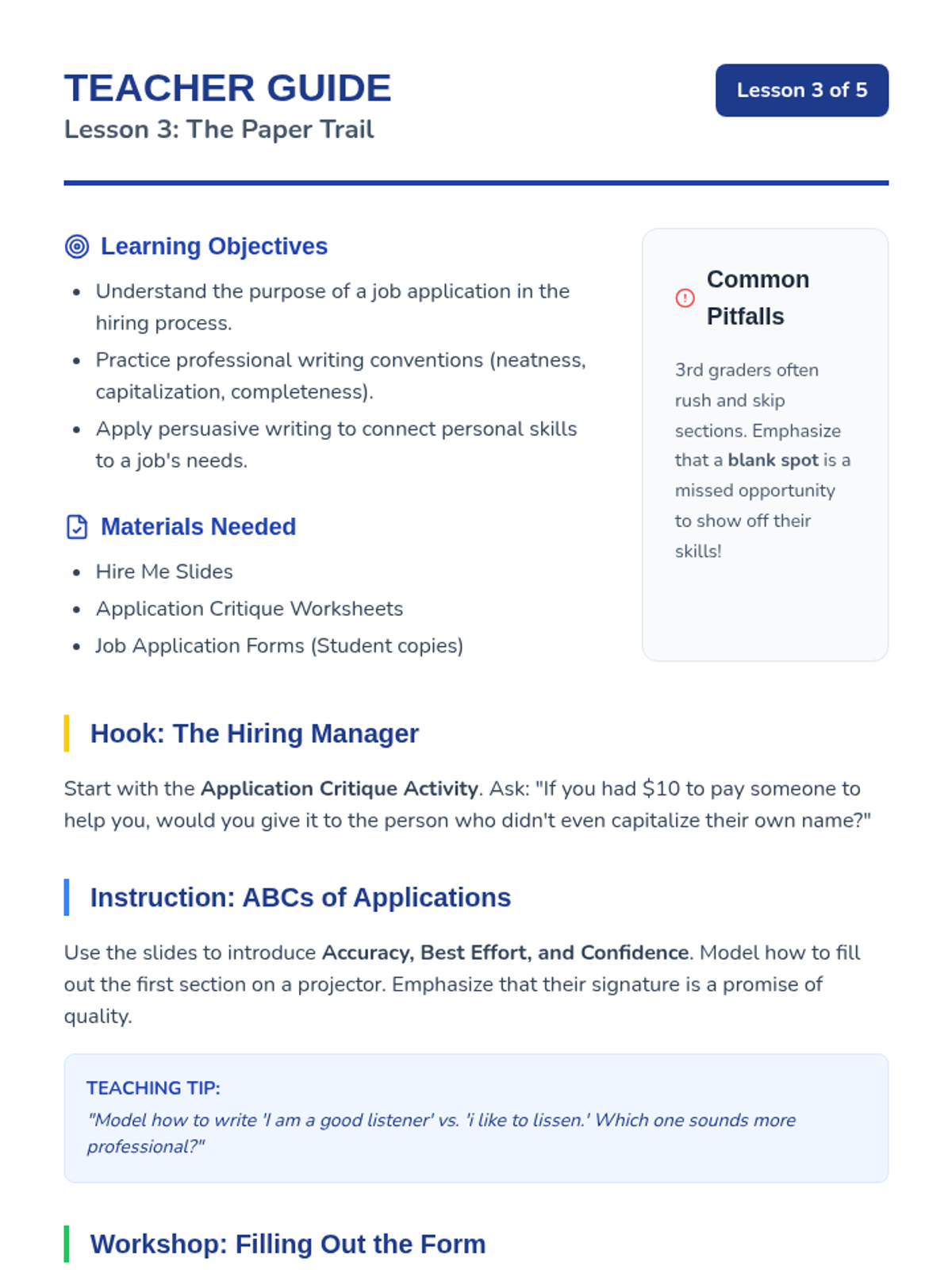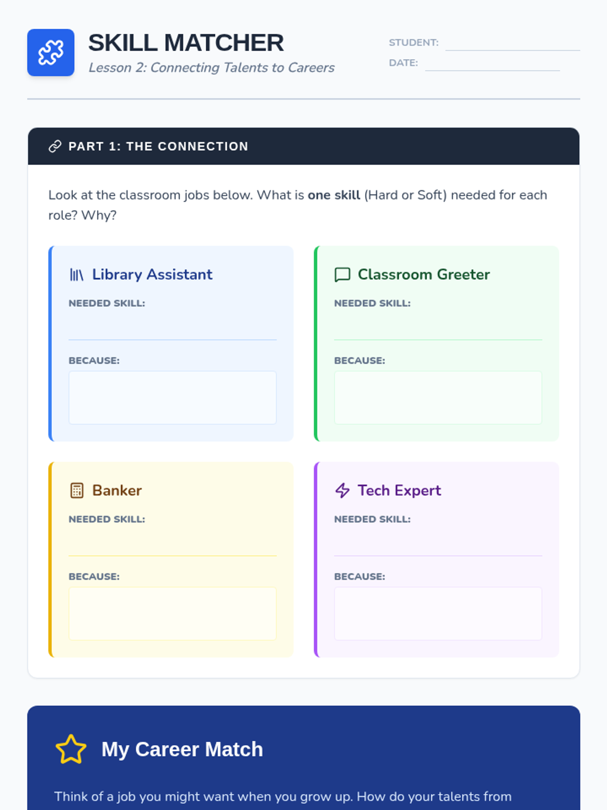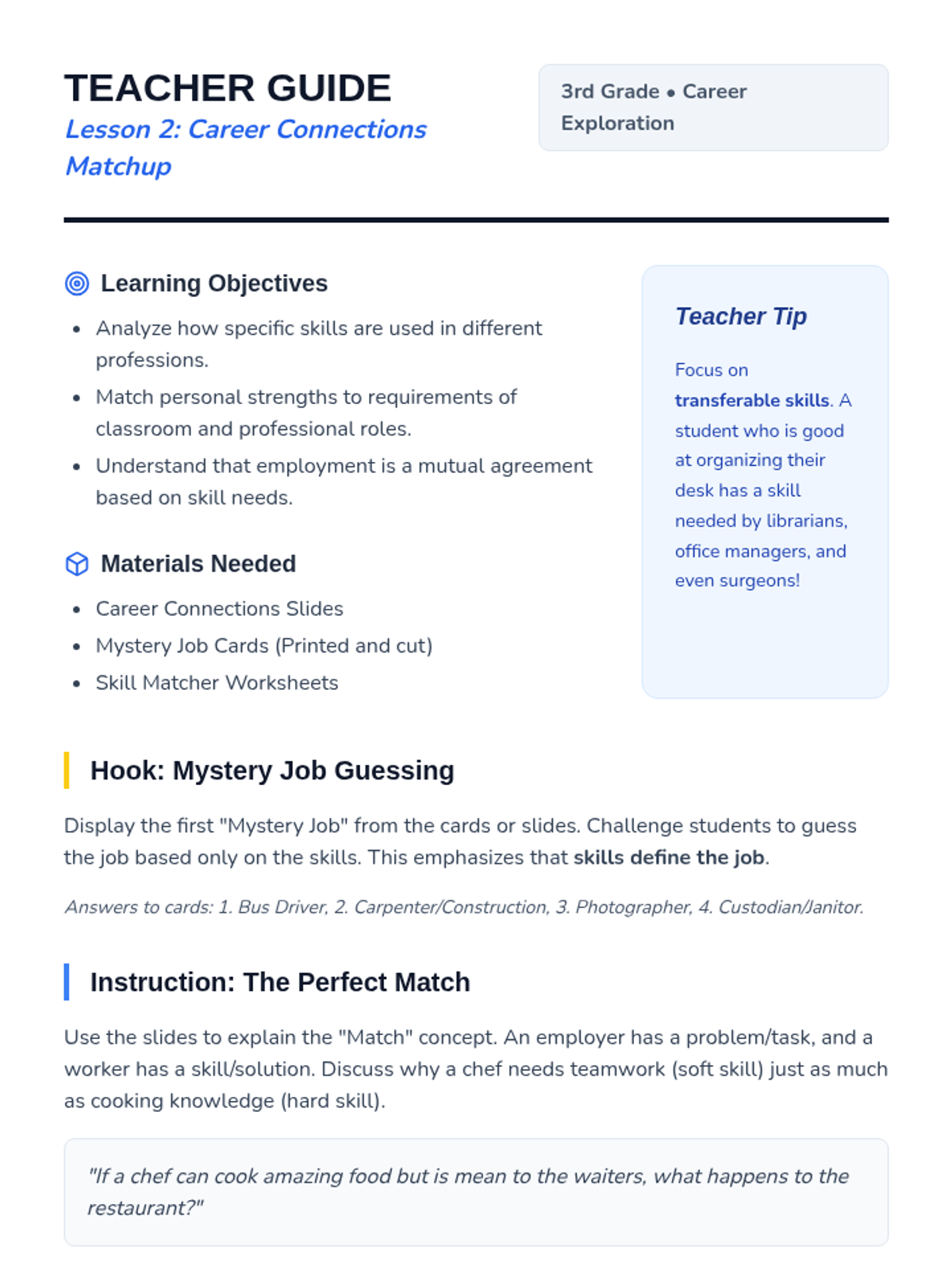 A five-lesson sequence for 3rd-grade students exploring the connection between personal skills and employment. Students identify their strengths, explore careers, practice professional writing through job applications, and participate in mock interviews.