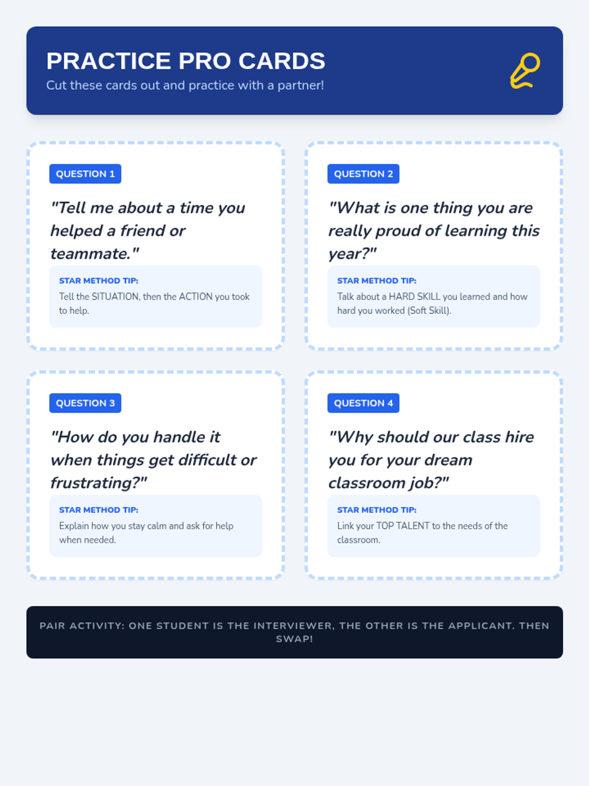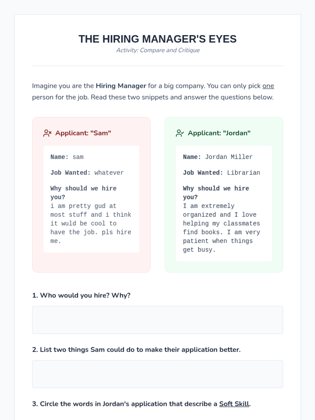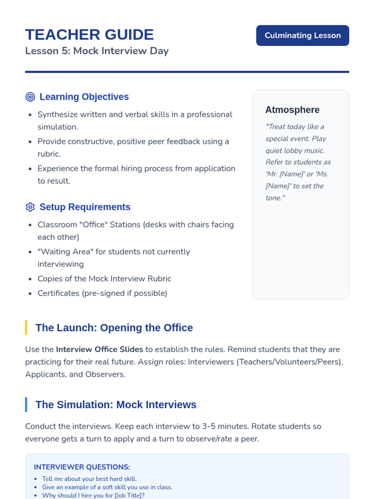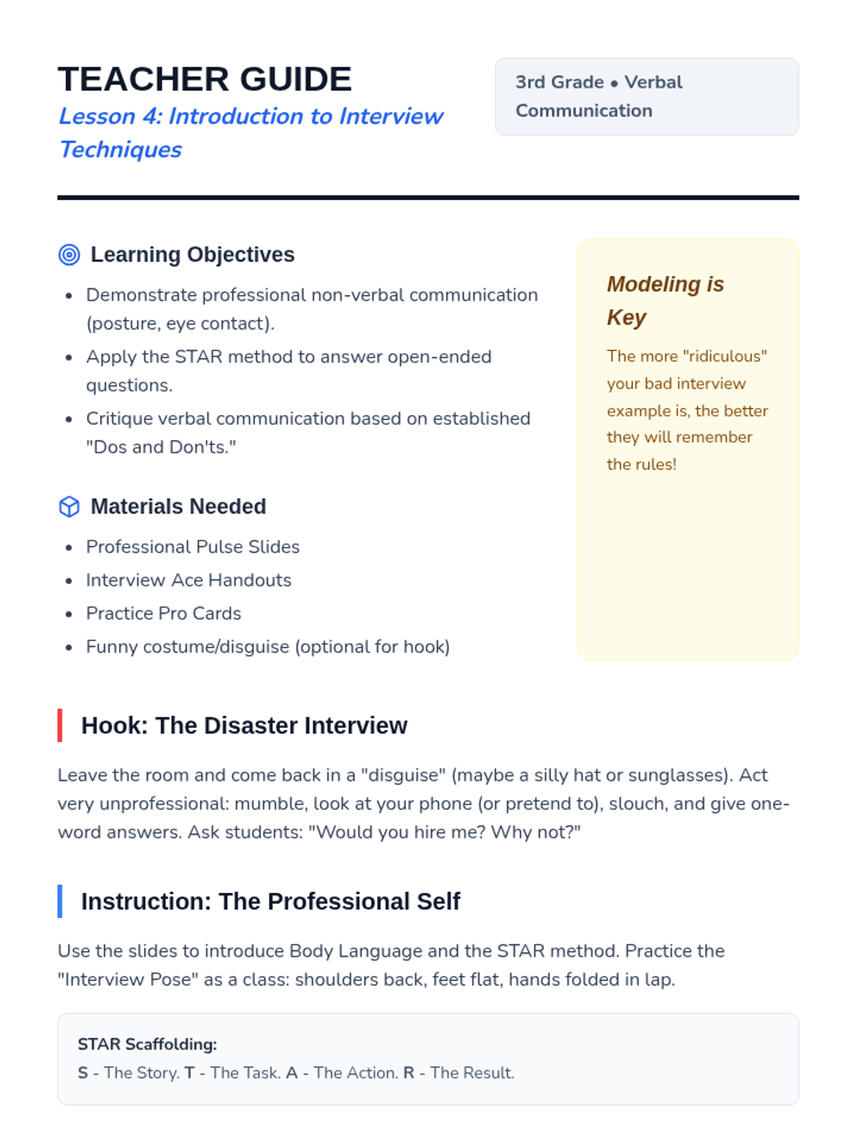 A five-lesson sequence for 3rd-grade students exploring the connection between personal skills and employment. Students identify their strengths, explore careers, practice professional writing through job applications, and participate in mock interviews.