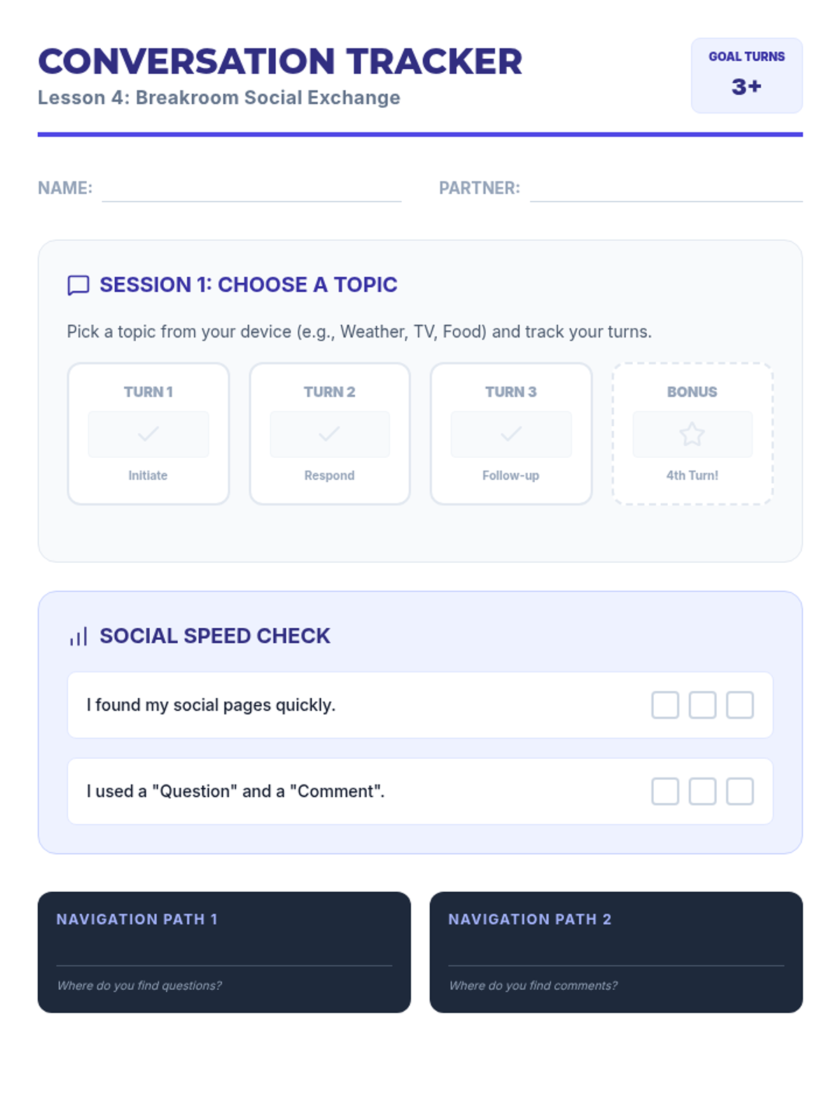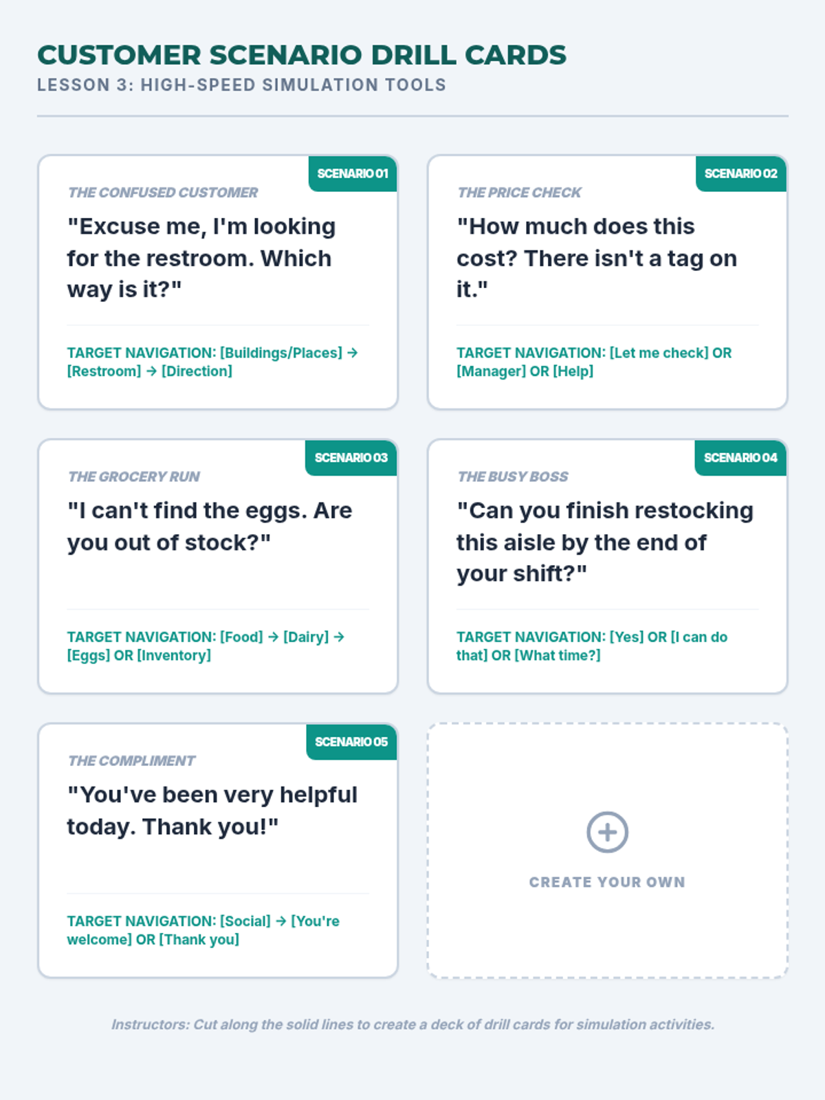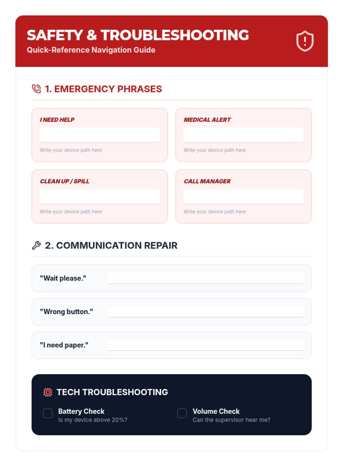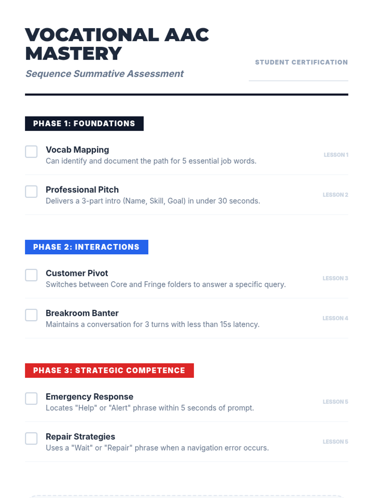 A comprehensive 5-lesson sequence designed for 11th-grade AAC users to master device navigation within vocational settings. Students progress from vocabulary mapping to high-stakes workplace simulations, focusing on speed, accuracy, and professional communication strategies.