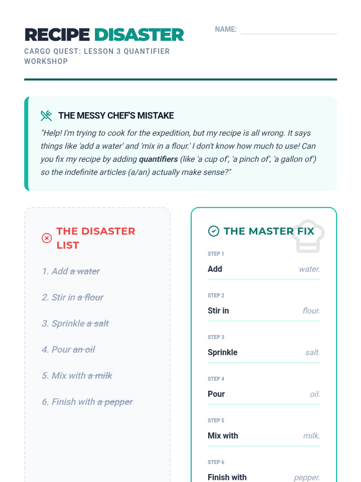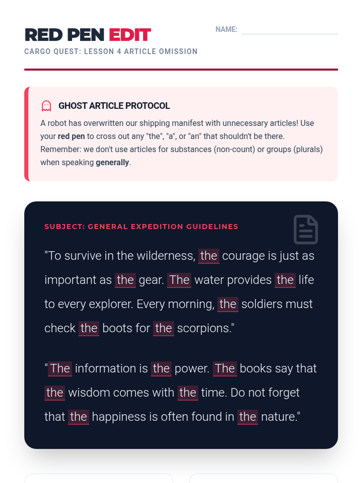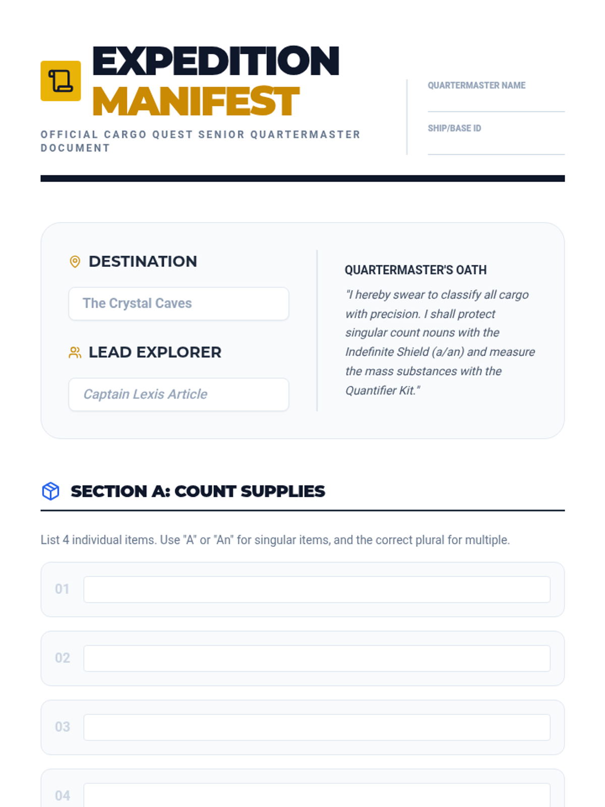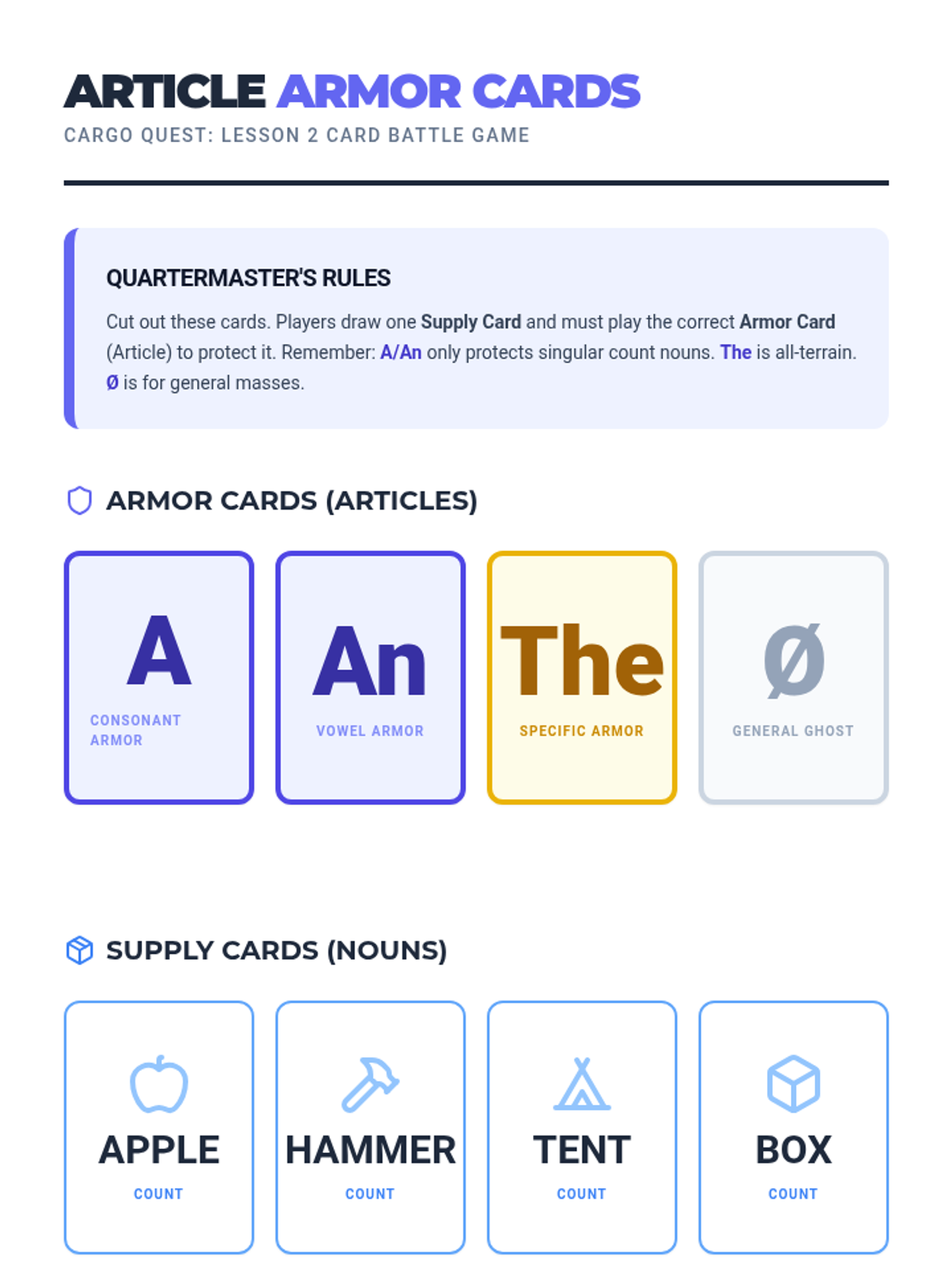 A game-based ELA sequence where 5th-grade students master the use of articles (a, an, the, and null) by distinguishing between count and non-count nouns through the lens of supply management and inventory logistics.