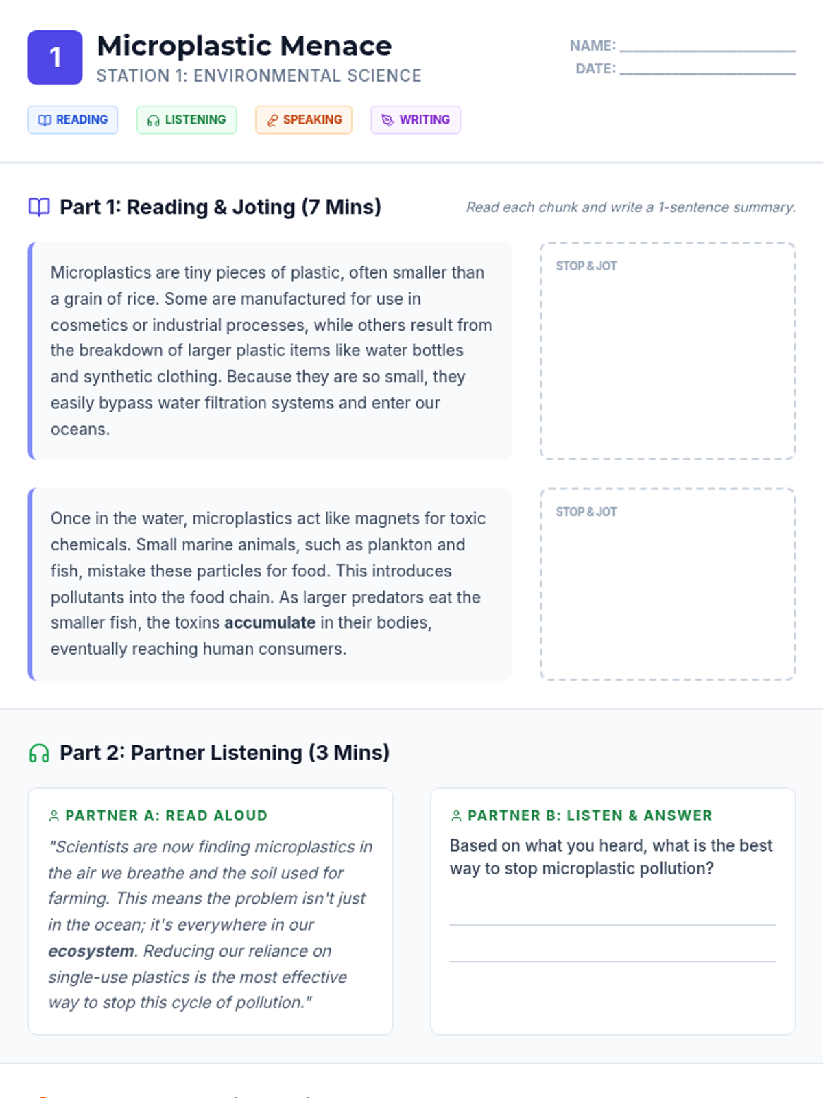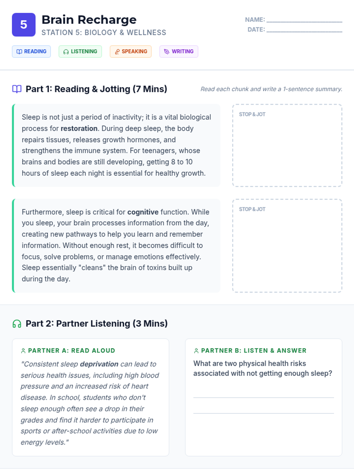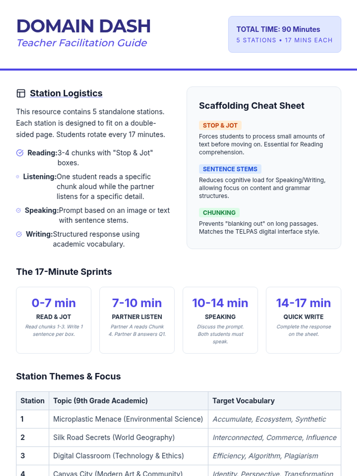 A comprehensive TELPAS prep sequence designed for 9th-grade students, featuring five high-intensity stations covering reading, writing, listening, and speaking with built-in scaffolds like chunking and sentence stems.
