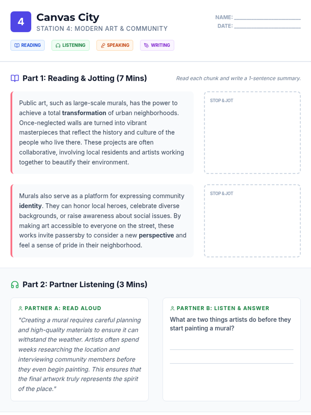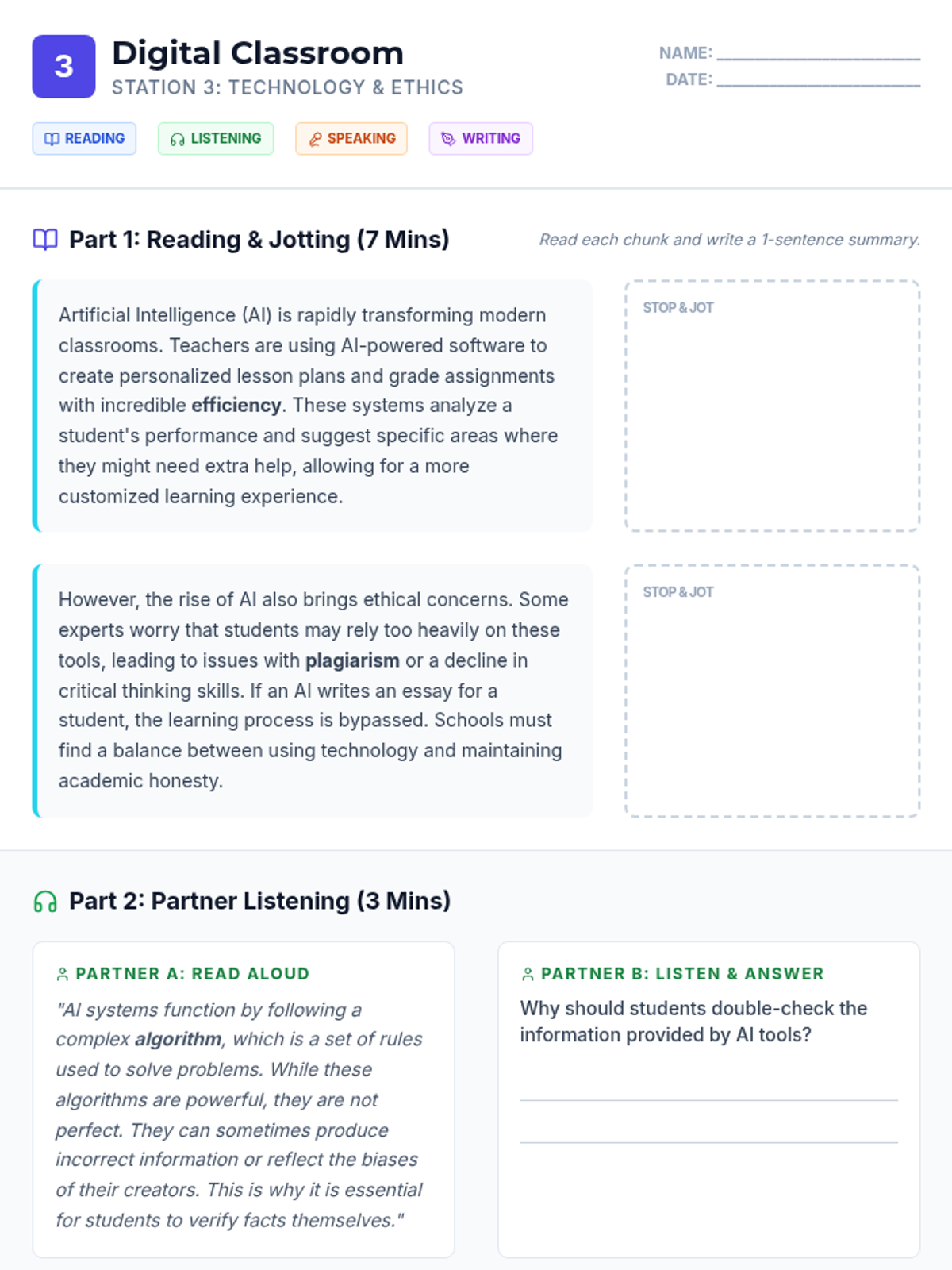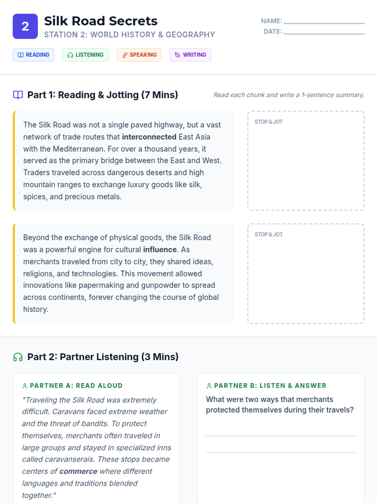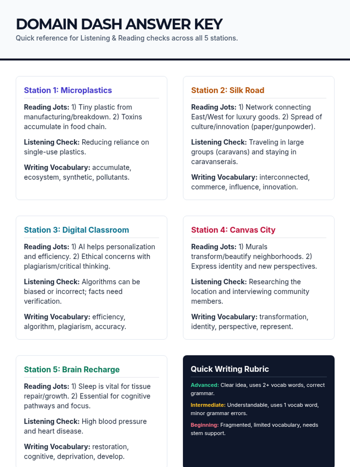 A comprehensive TELPAS prep sequence designed for 9th-grade students, featuring five high-intensity stations covering reading, writing, listening, and speaking with built-in scaffolds like chunking and sentence stems.