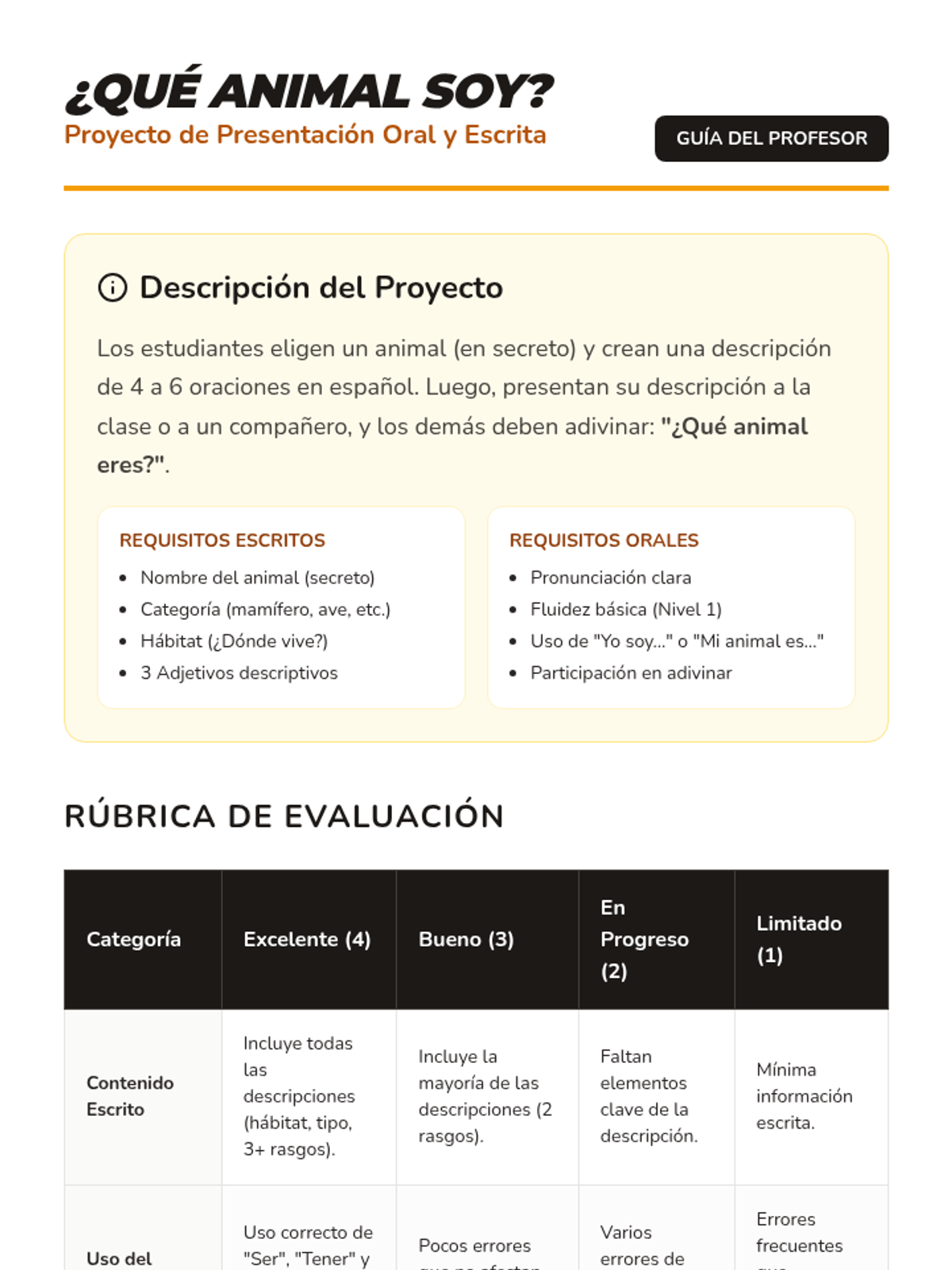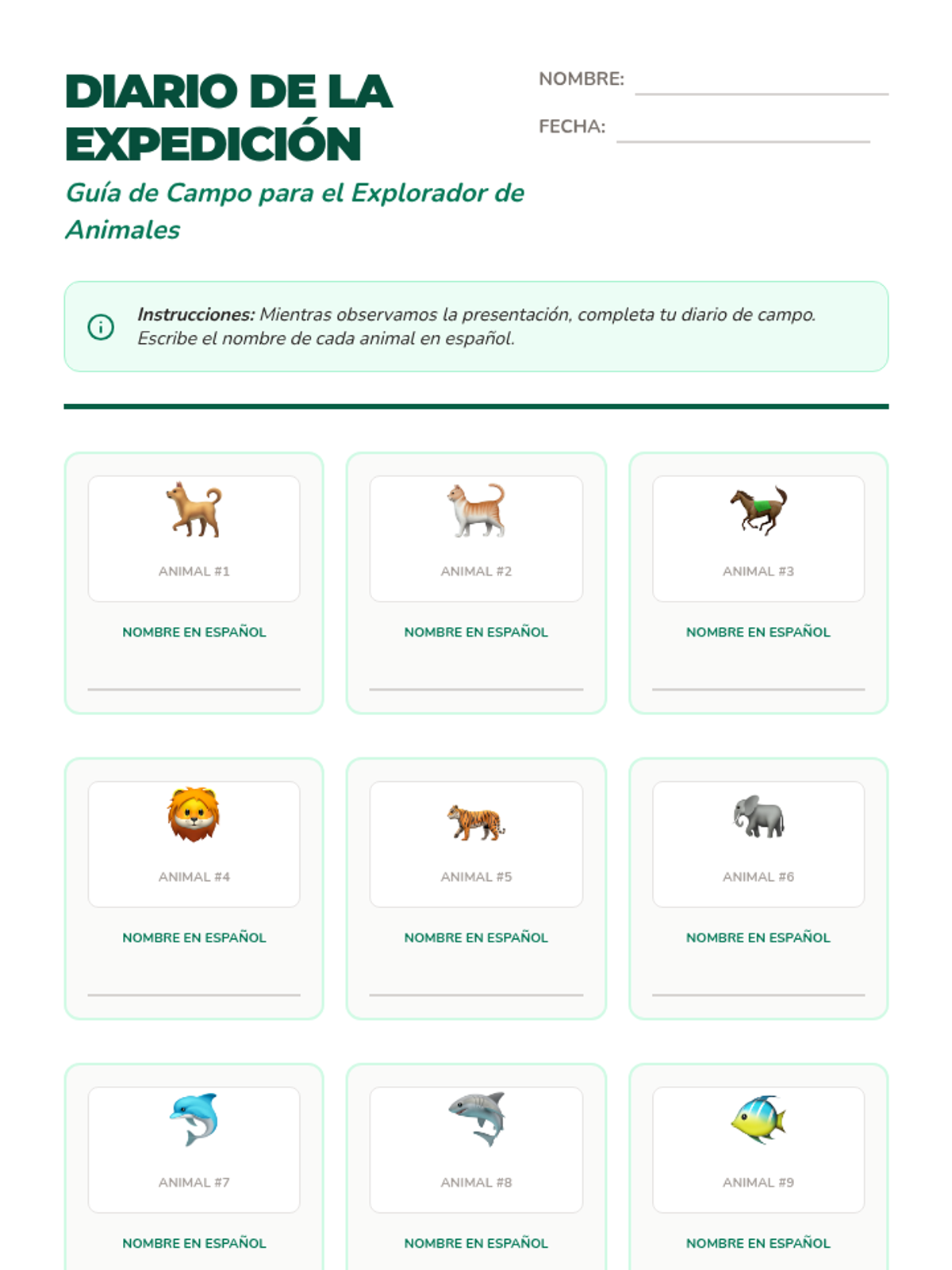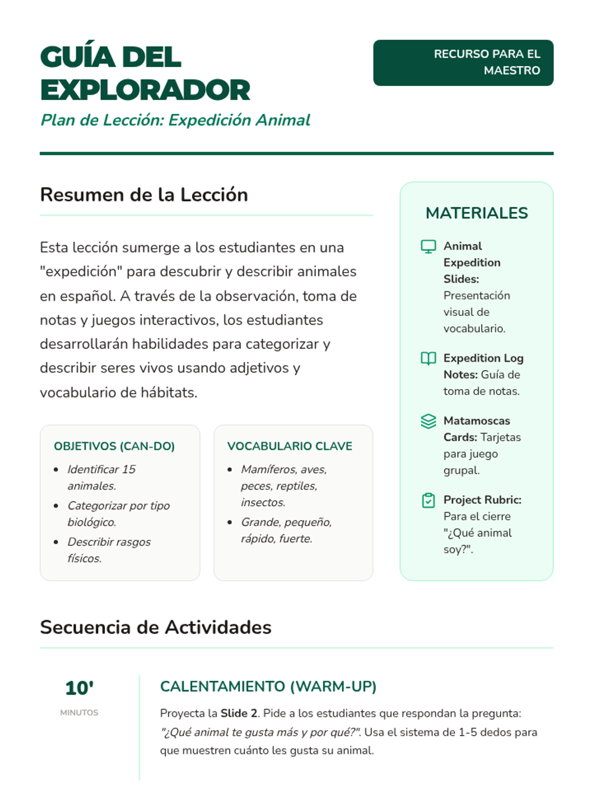 A unit covering animal vocabulary, descriptions, and likes/dislikes in Spanish, designed for Level 1 learners to build foundational communication skills about the natural world.