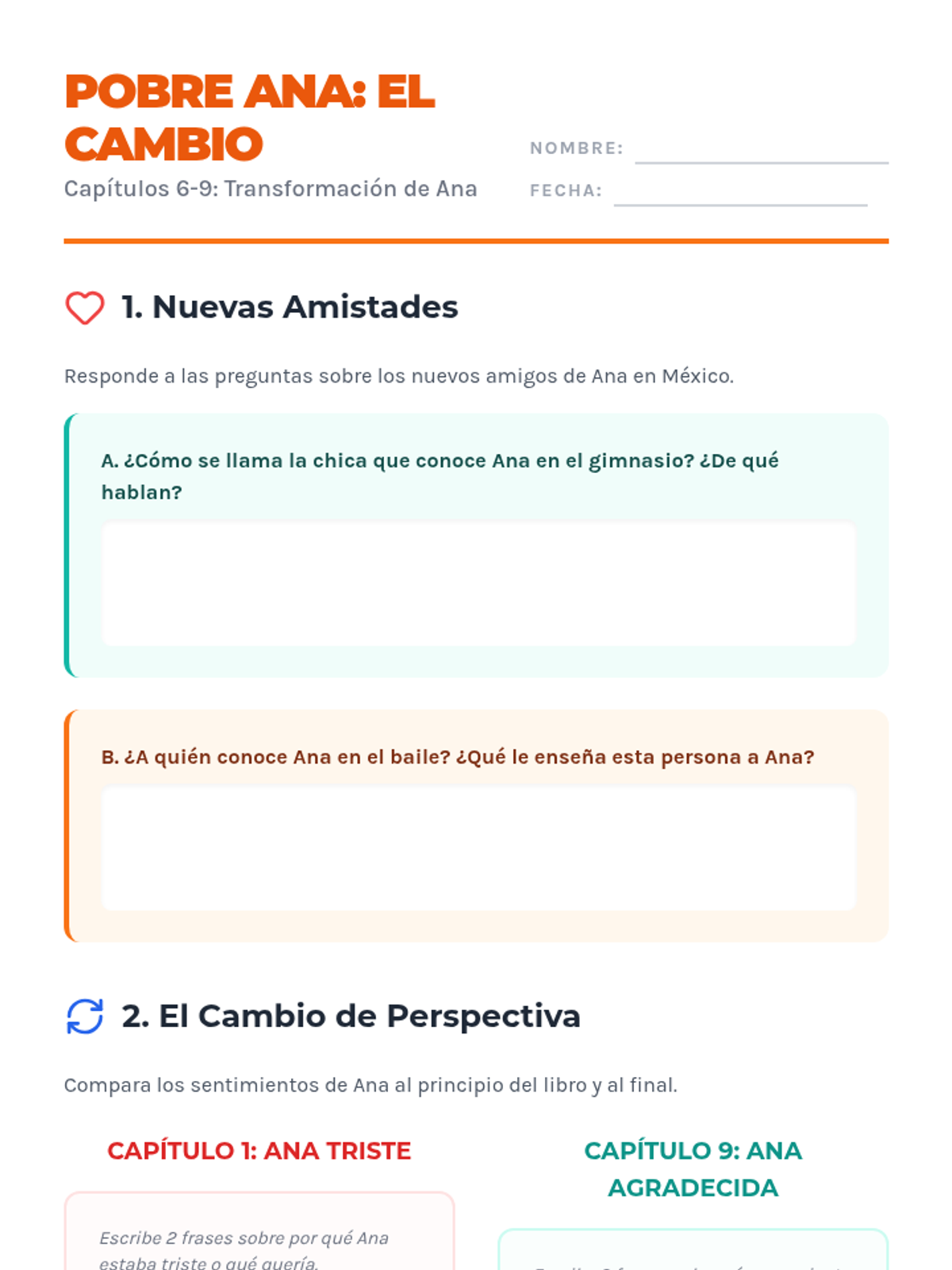 A comprehensive unit for the novel Pobre Ana, exploring character development, cultural comparisons, and narrative comprehension for Spanish 1 students.