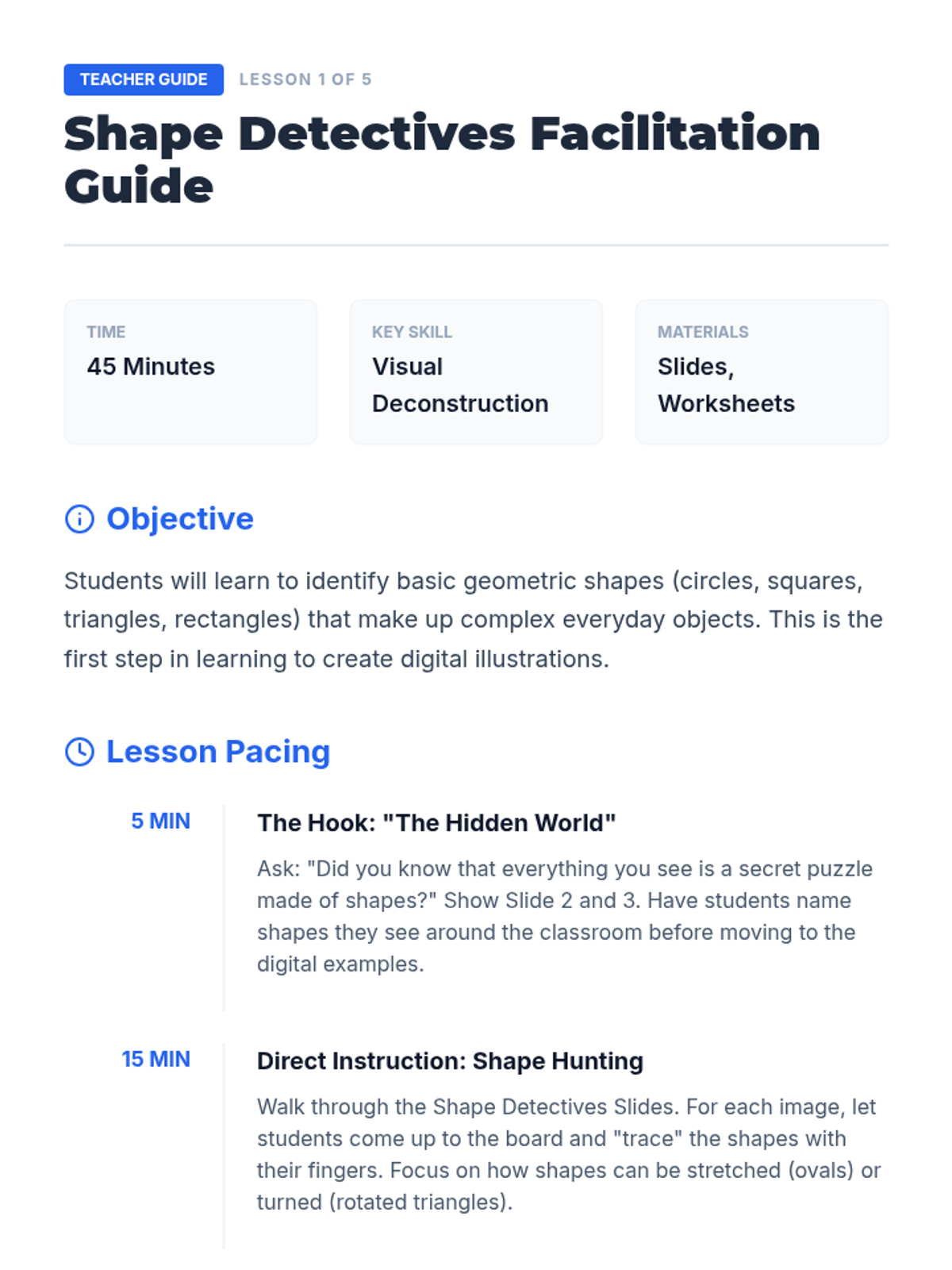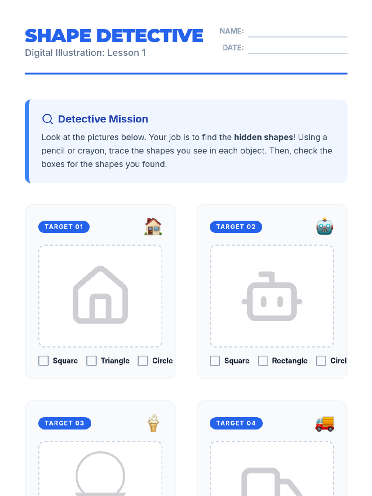 This sequence introduces 2nd grade students to the fundamentals of digital illustration by focusing on geometric shapes, digital tool manipulation, and the concept of layering. Students move from identifying shapes in the world to creating complex digital characters and scenes.