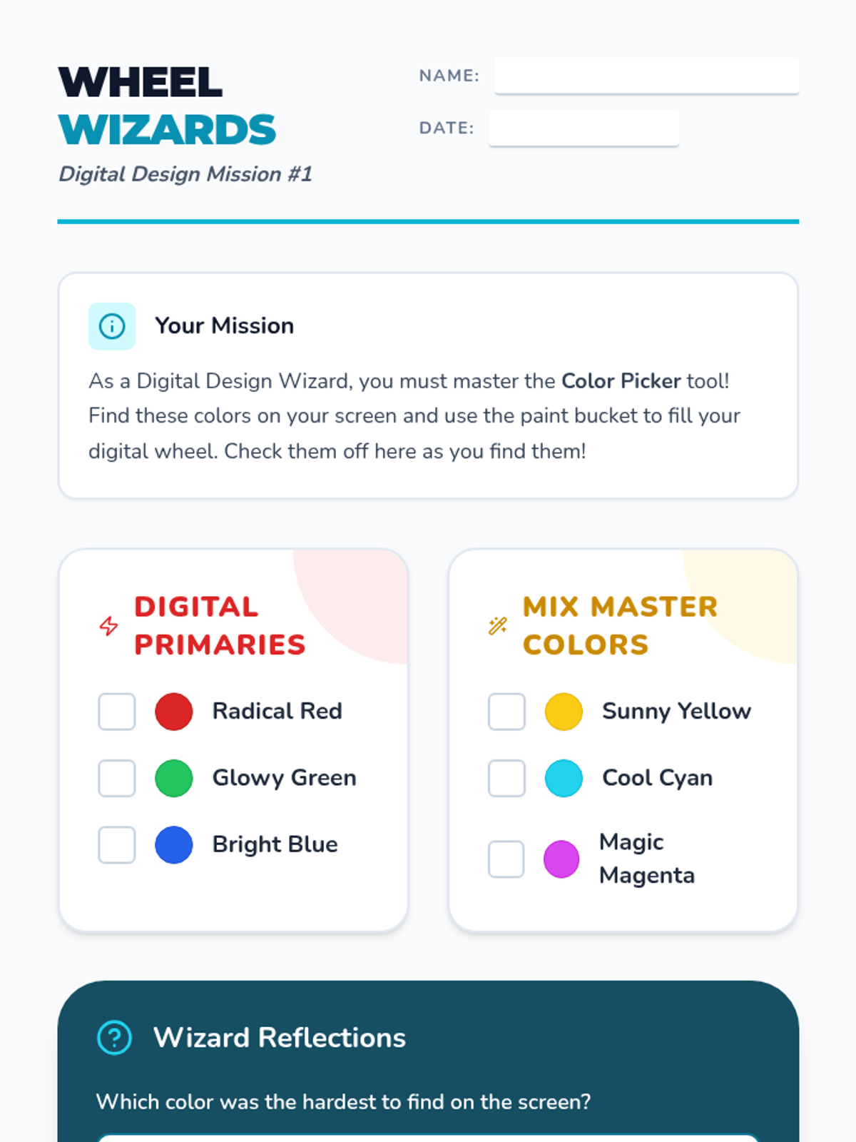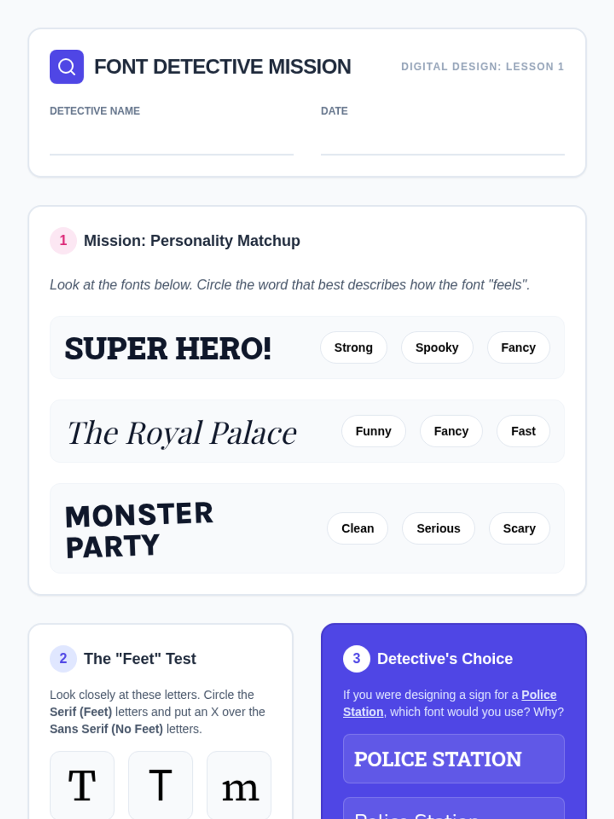 A foundational sequence for 2nd graders to learn typography and layout through the lens of 'text as art'. Students explore font personality, visual hierarchy, contrast, and layout balance to create effective digital communications.