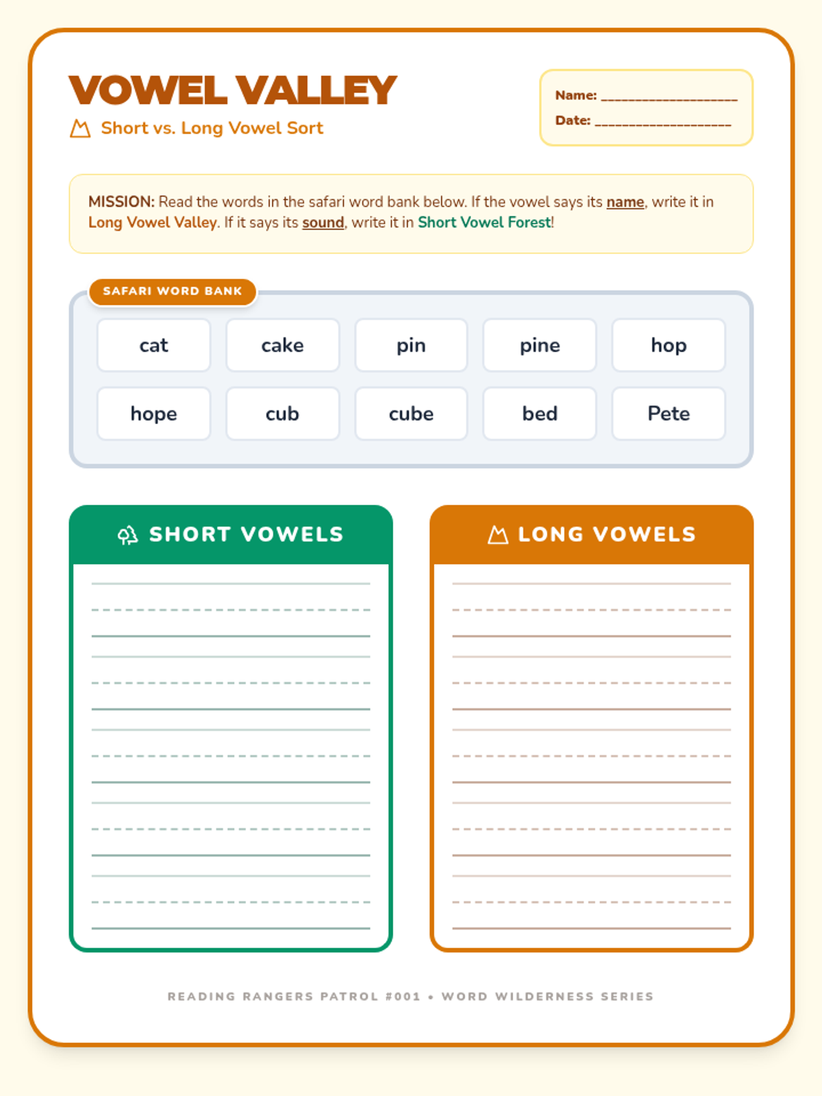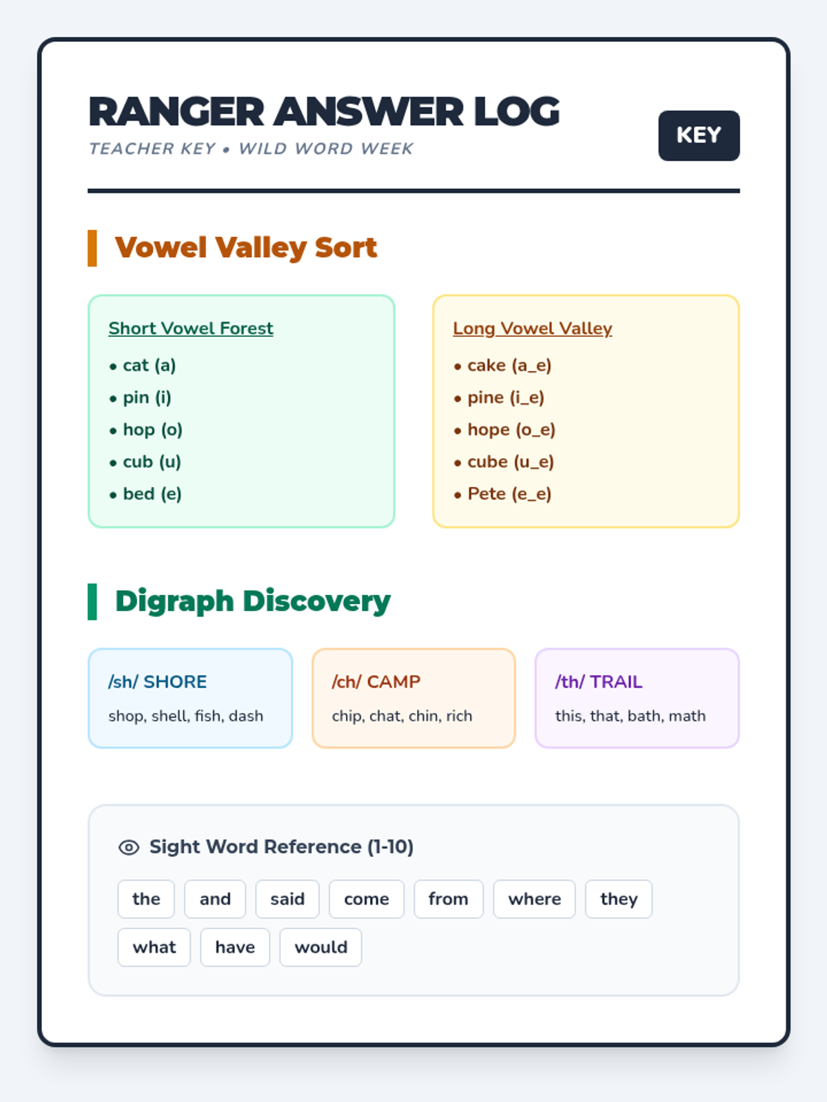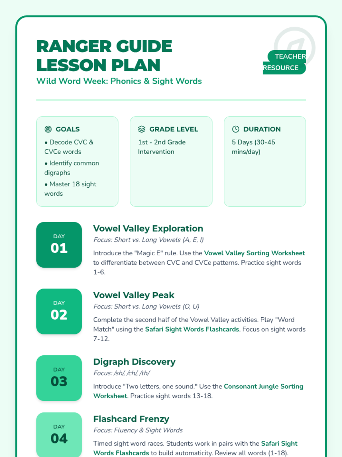 A detective-themed phonics unit focusing on foundational reading skills including short vowels, digraphs, blends, trigraphs, VCE words, and vowel teams. Each lesson provides daily warm-up activities structured as 'evidence files' and 'case investigations'.
