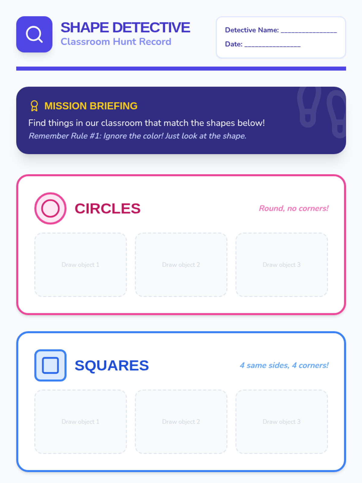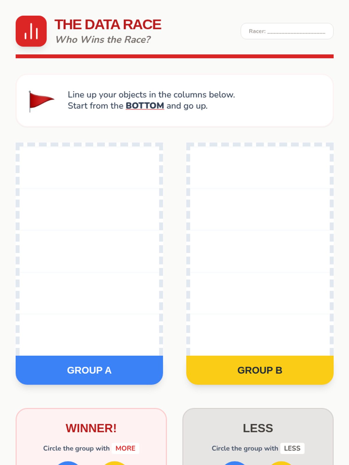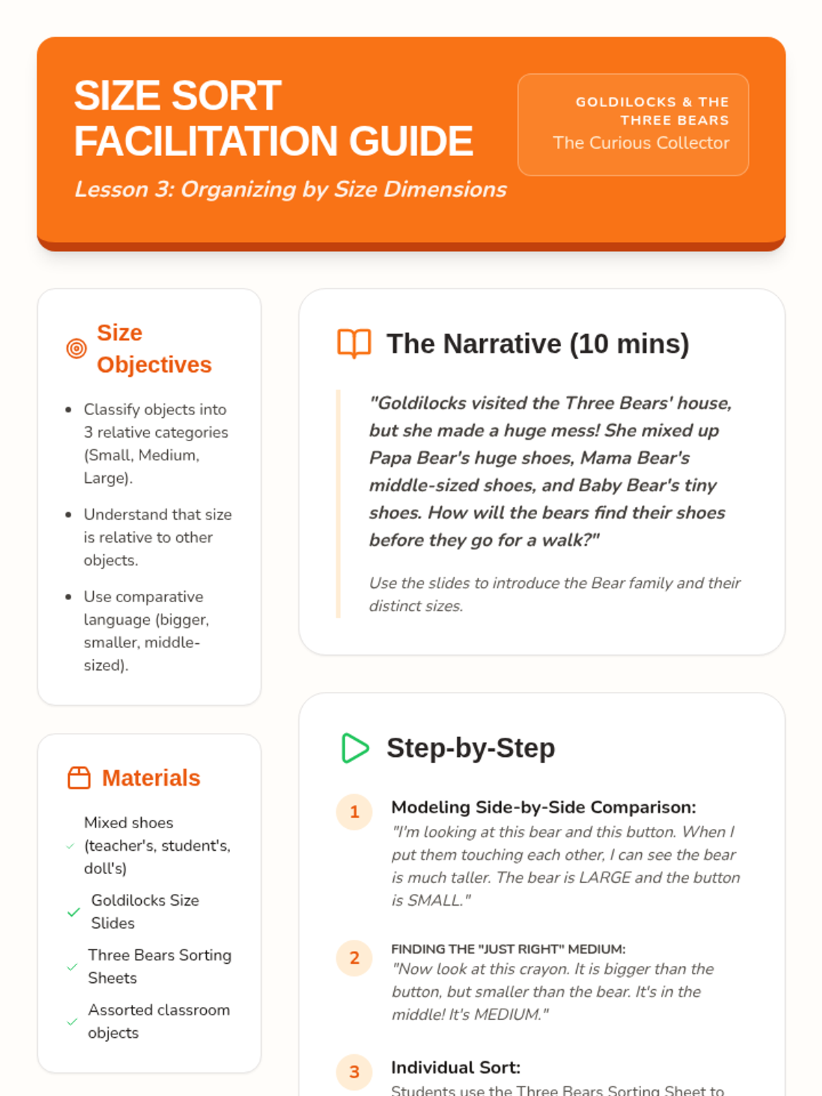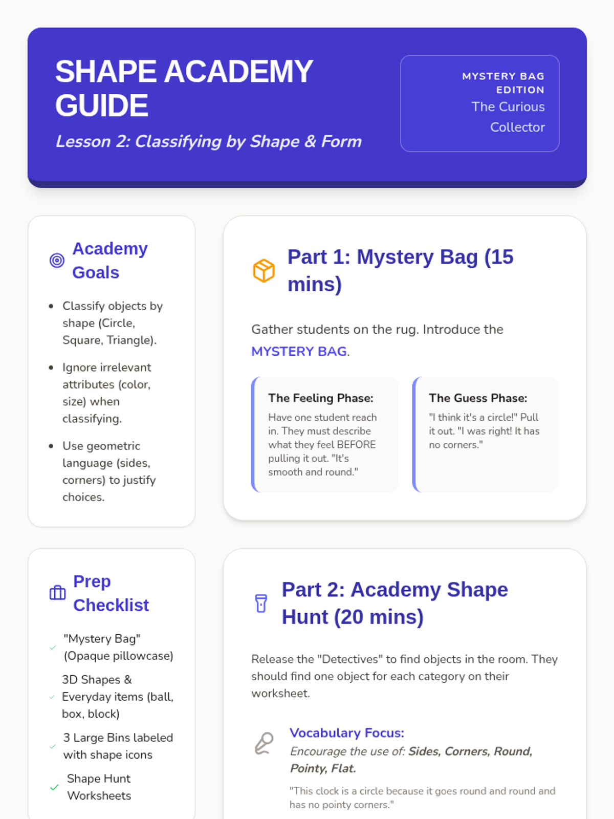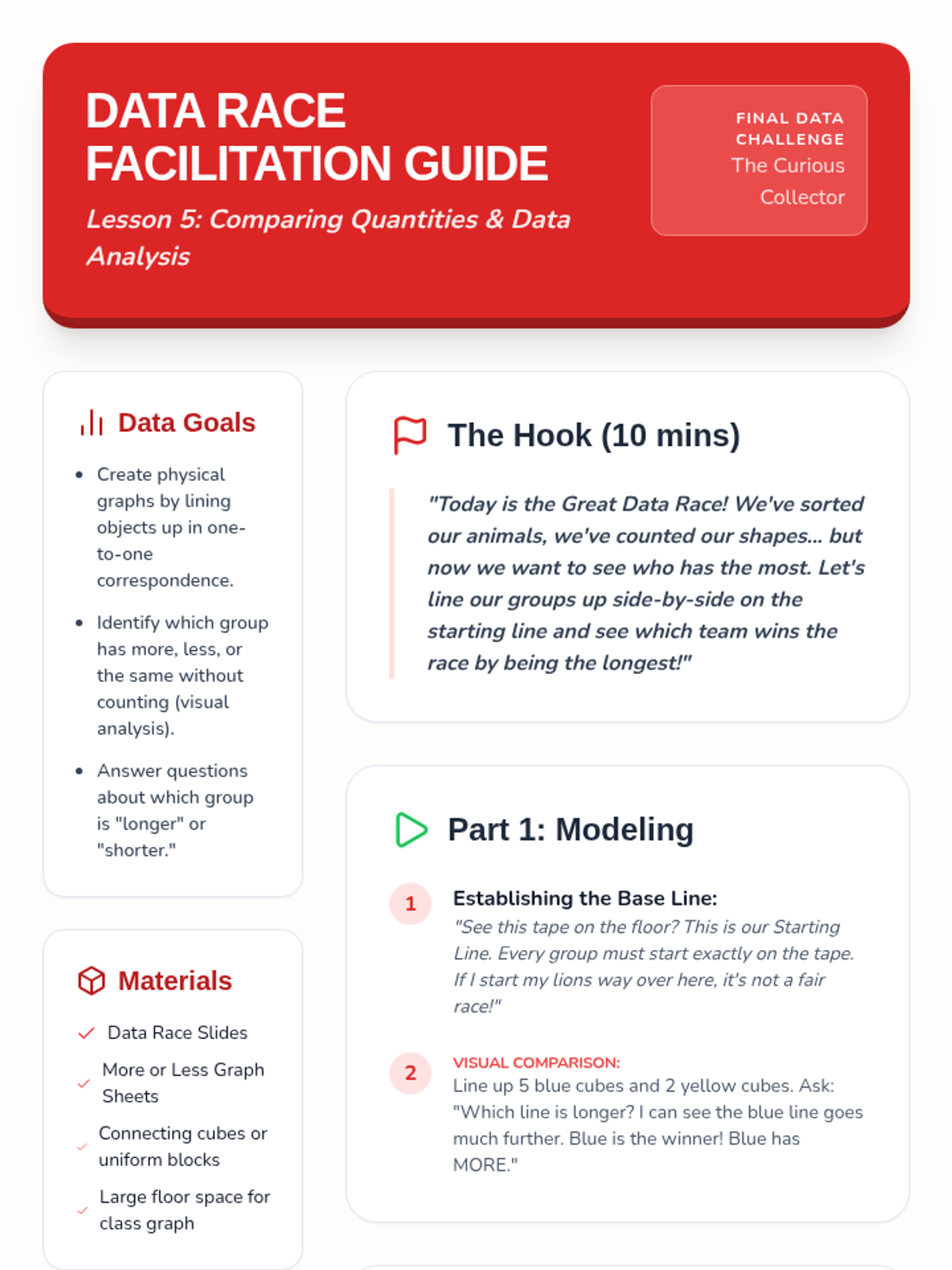 A comprehensive Kindergarten math unit focusing on sorting, classifying, and comparing objects by attributes like color, shape, and size, leading into basic data representation and analysis.