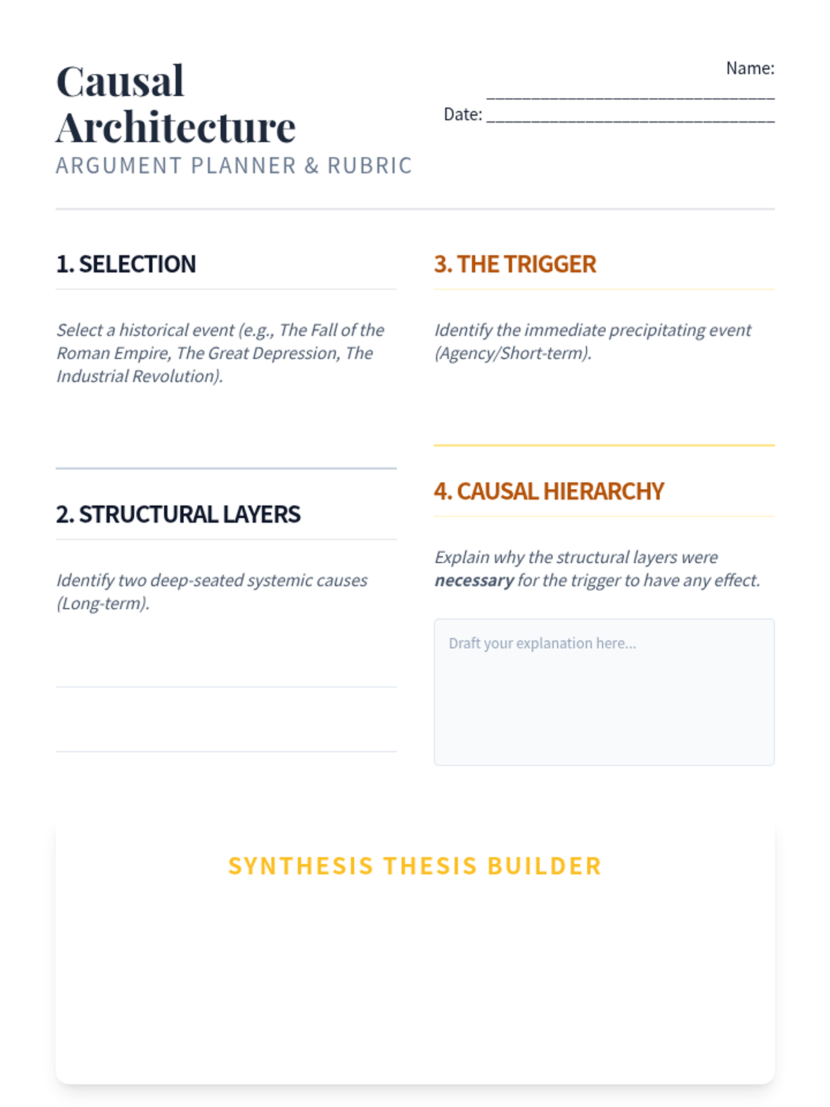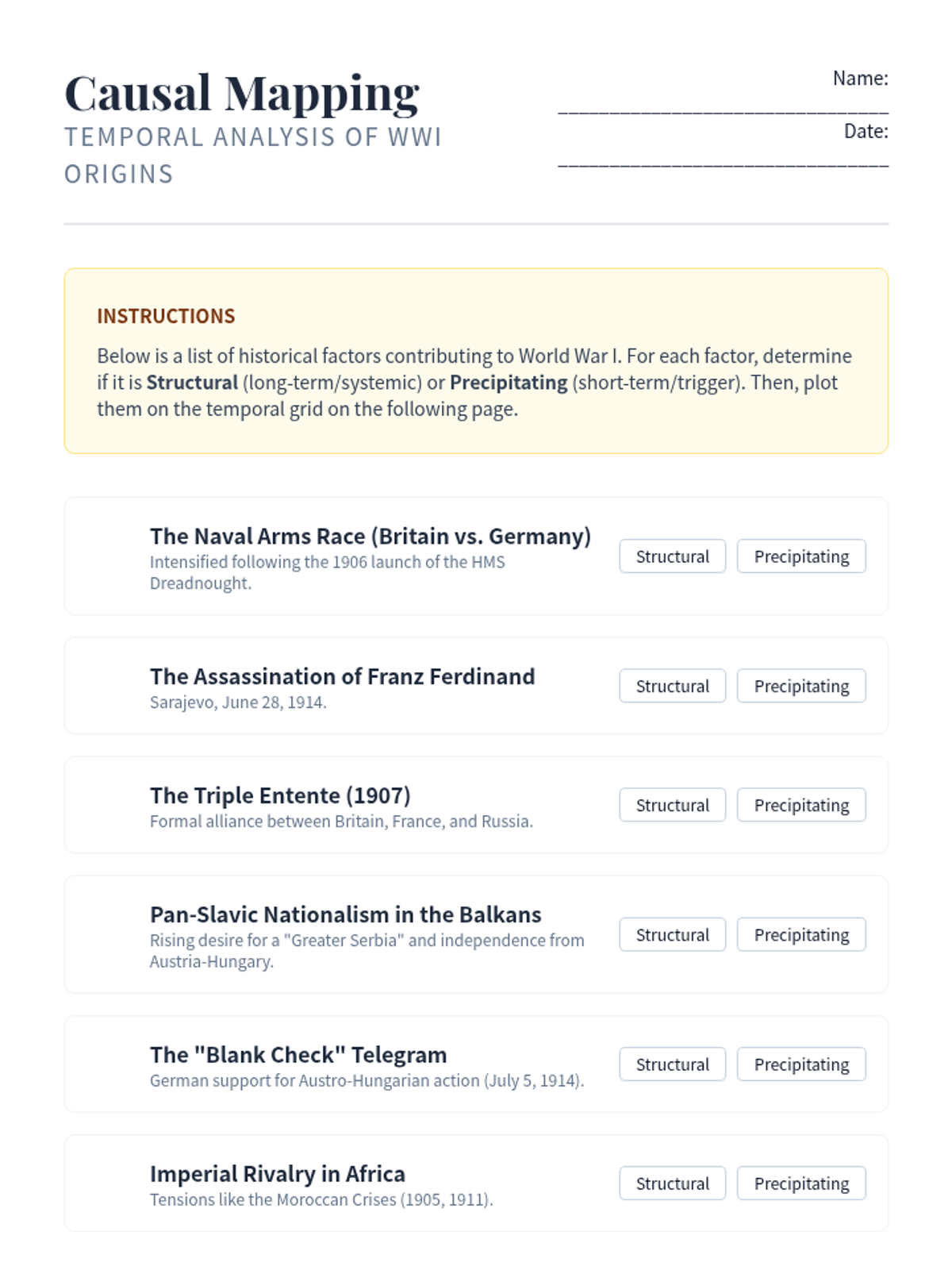 This sequence for undergraduate students explores the nuances of historical causation, distinguishing between long-term structural factors and immediate precipitating triggers. Students will analyze historiographical theories, case studies like WWI and the French Revolution, and logical fallacies to build robust, multi-causal arguments.