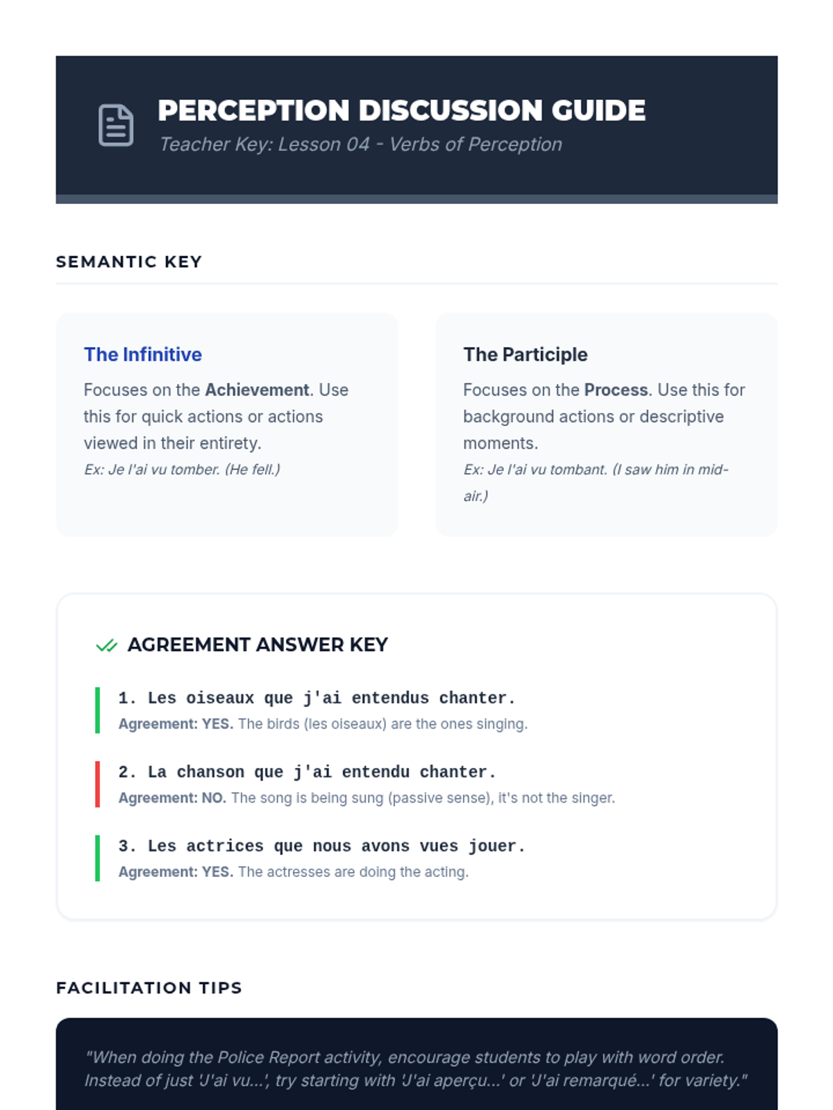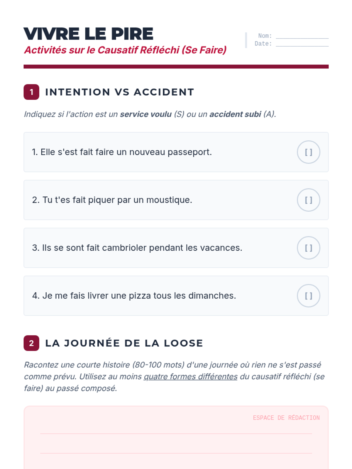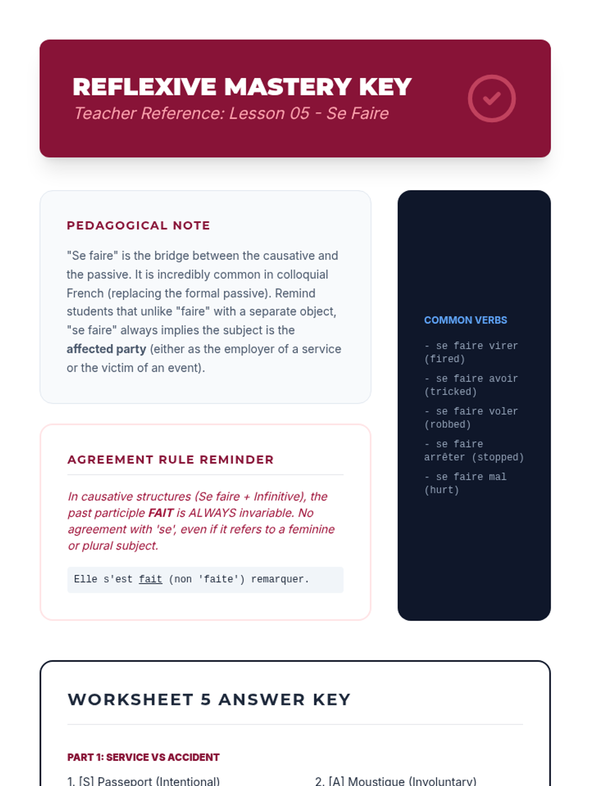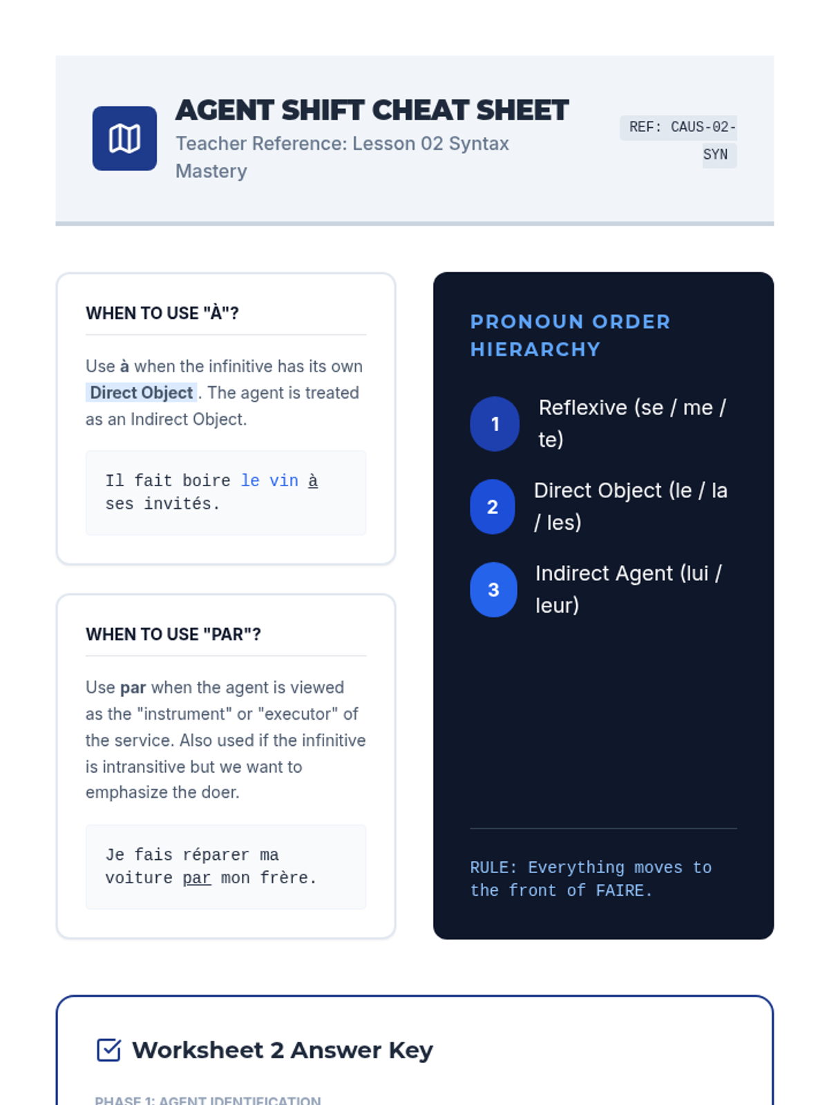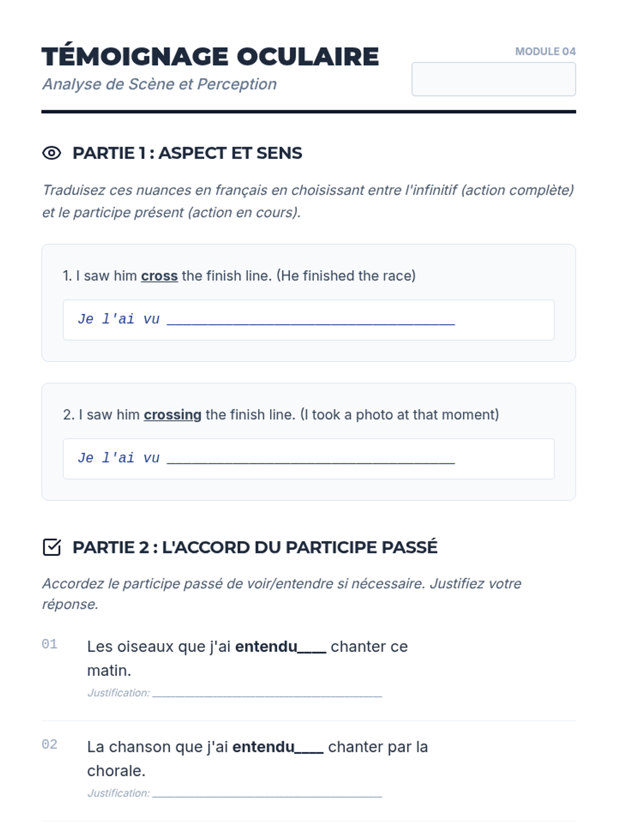 An advanced French grammar sequence focusing on the causative construction (Faire + Infinitive) and verbs of perception (Laisser, Voir, Entendre). Students will master the distinction between agency and causation, pronoun placement in complex structures, and the nuances of permission and perception.