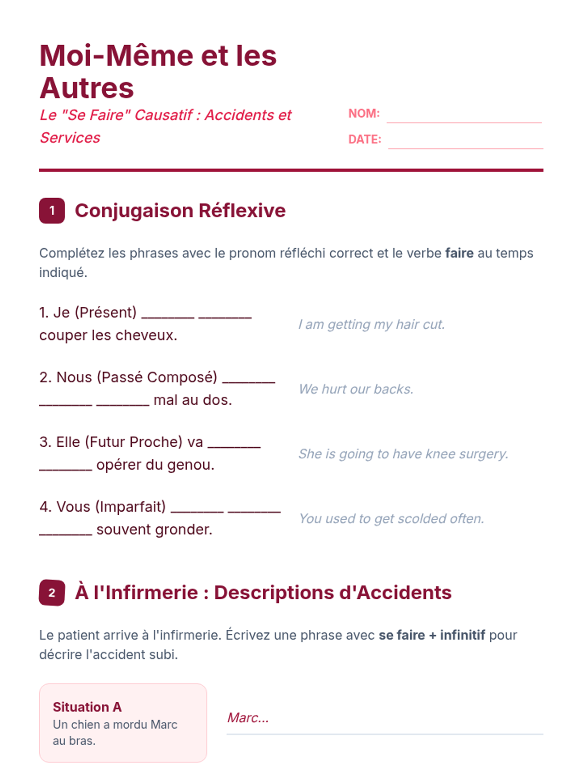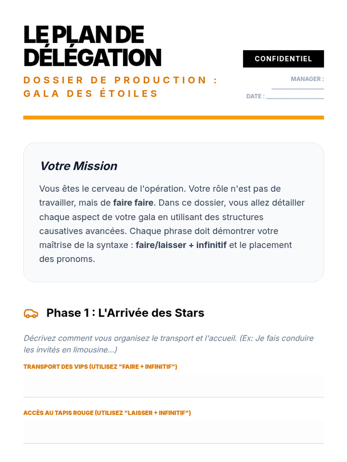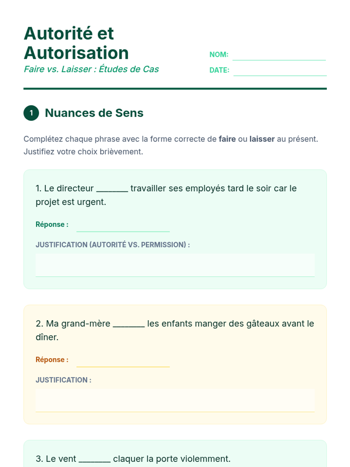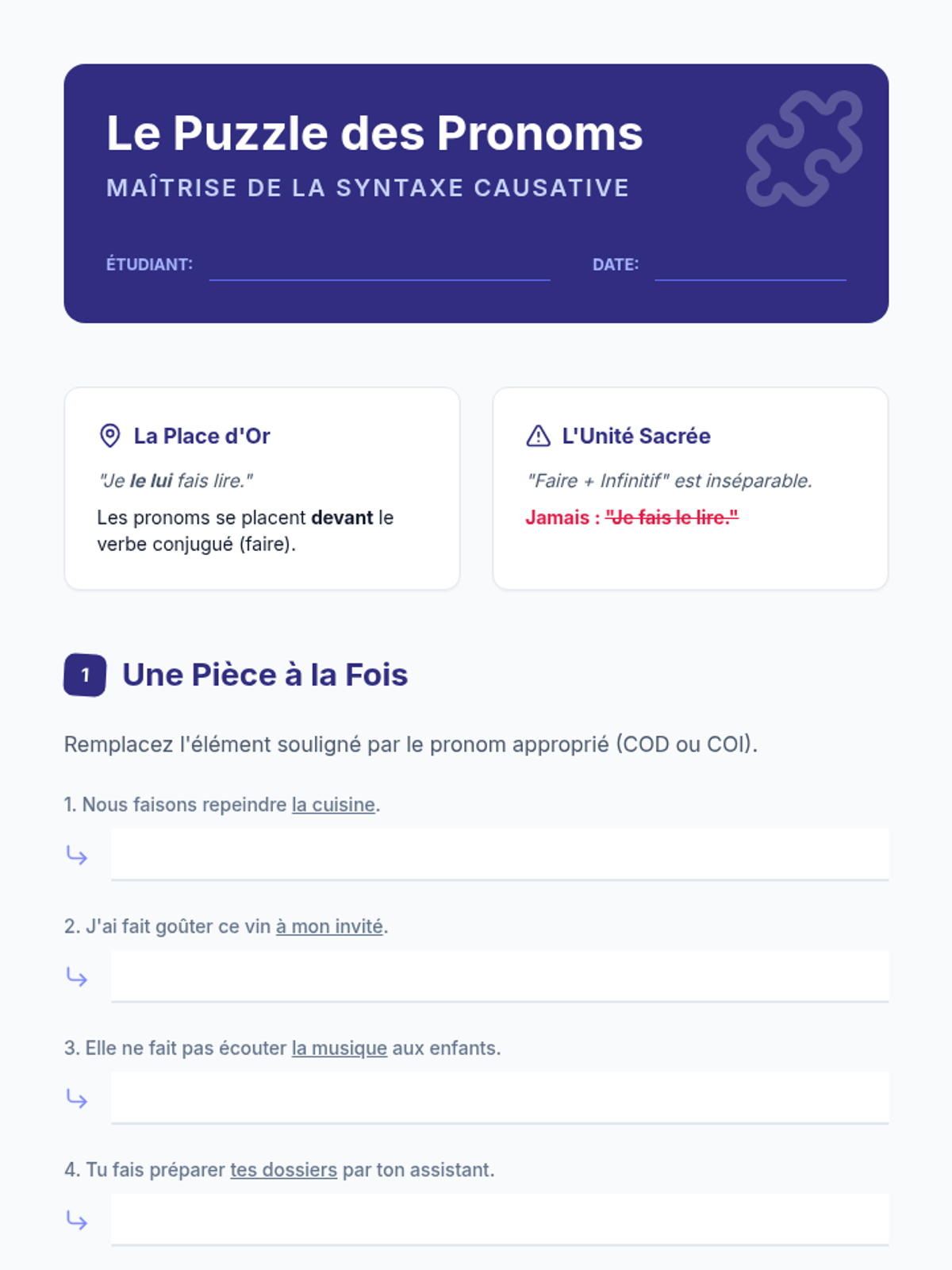 An advanced French grammar sequence focusing on the causative construction 'faire + infinitive' and 'laisser + infinitive'. Students explore the nuances of agency, delegation, and permission through practical scenarios and linguistic analysis.