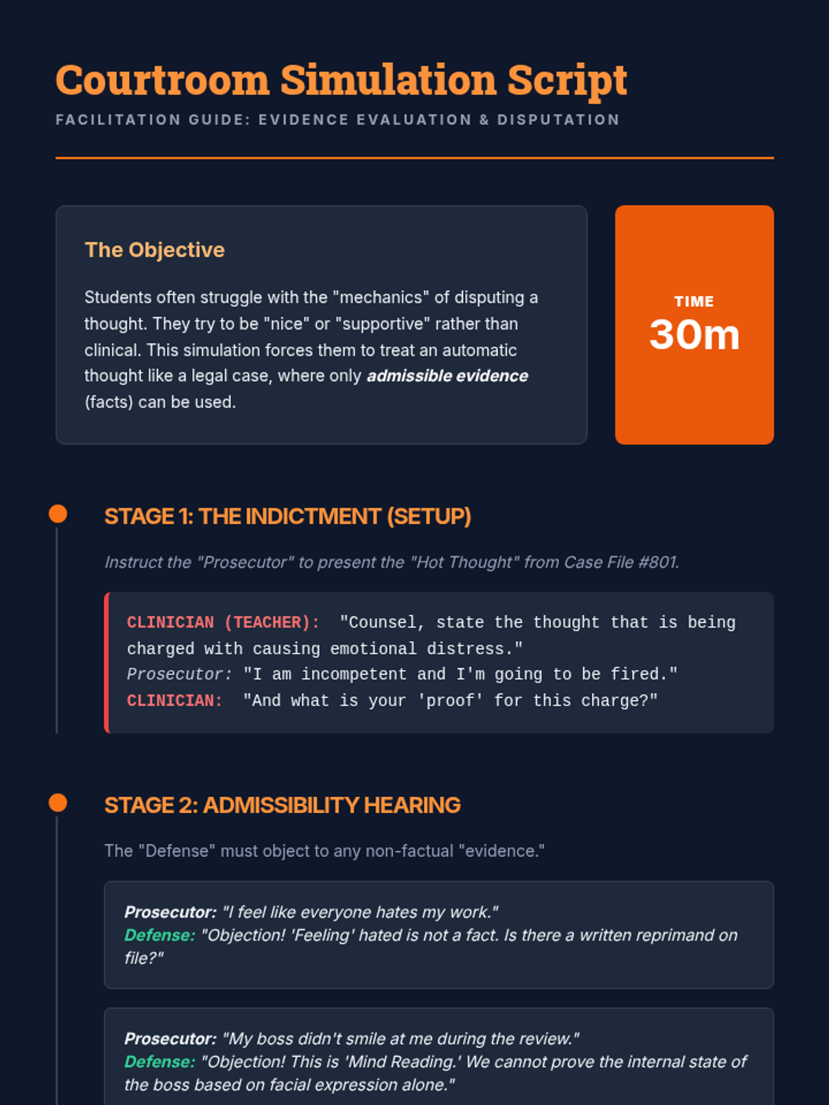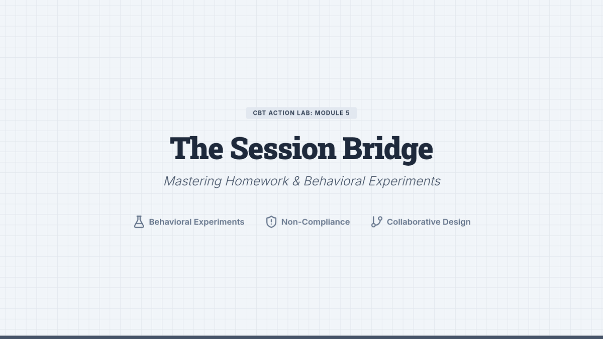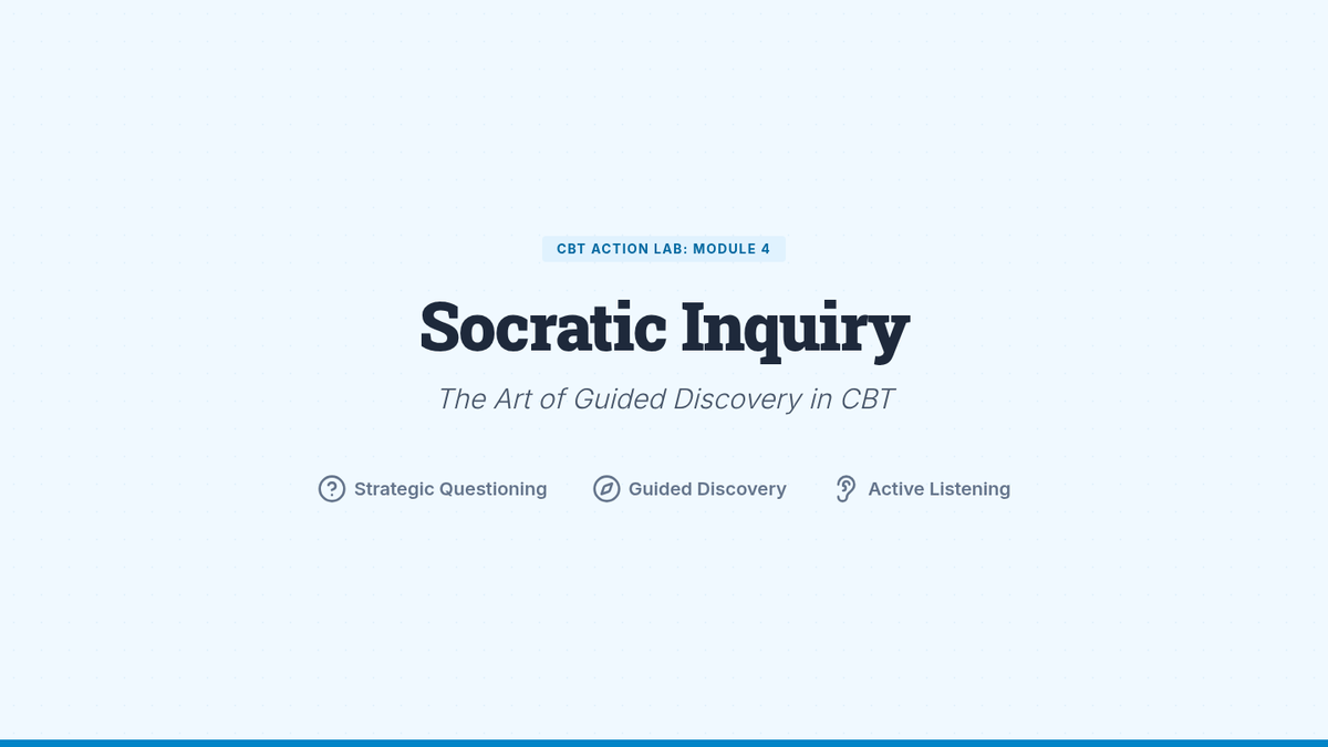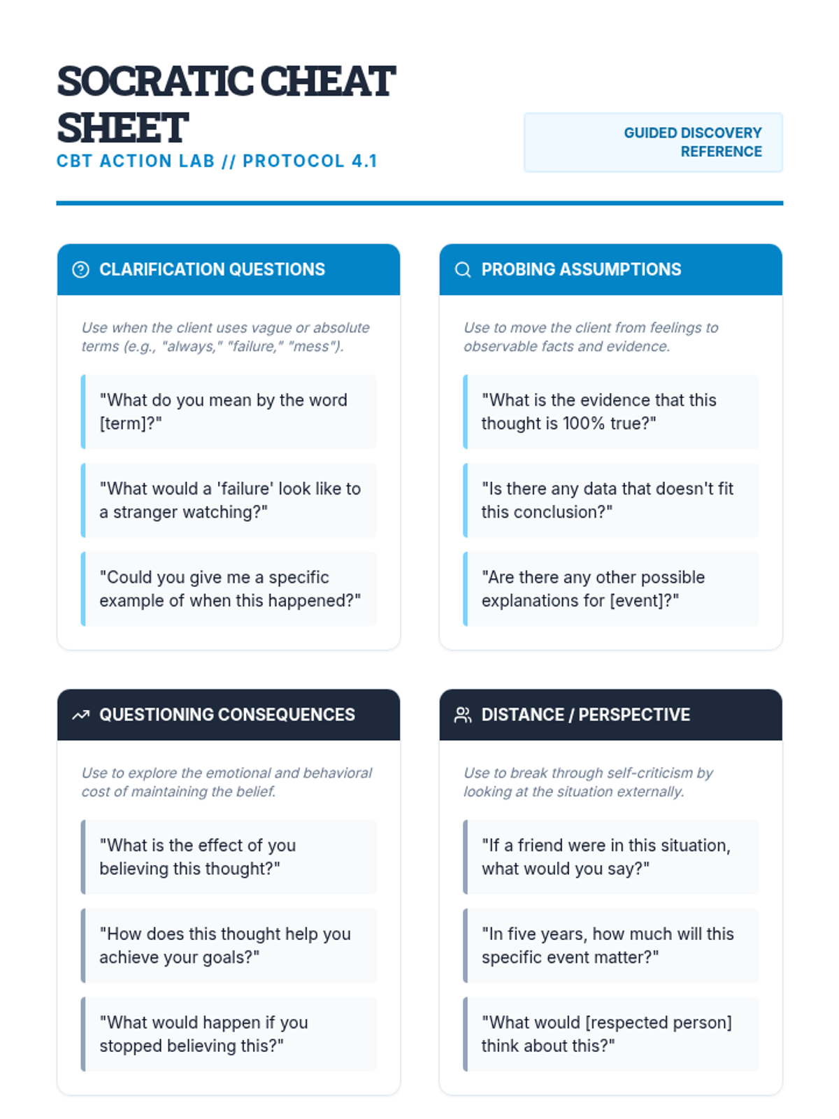 A skills-based sequence for undergraduate counseling students focused on the practical application of Behavioral Activation and Cognitive Restructuring protocols. Students move from behavioral scheduling to the nuanced art of Socratic questioning and cognitive disputation.