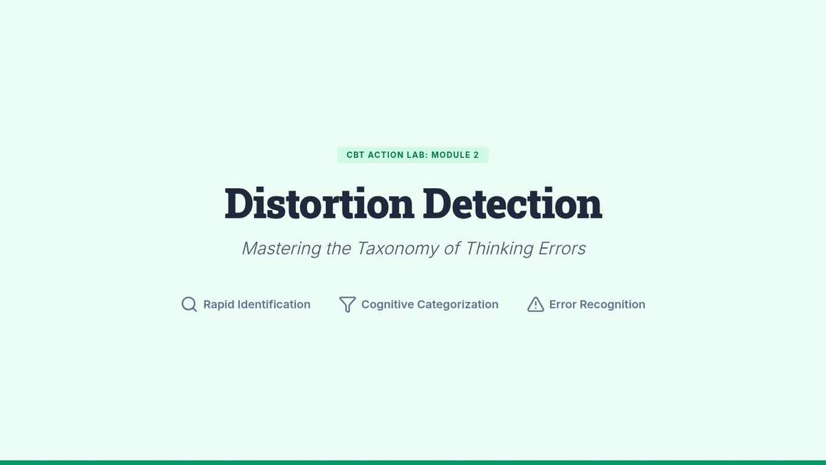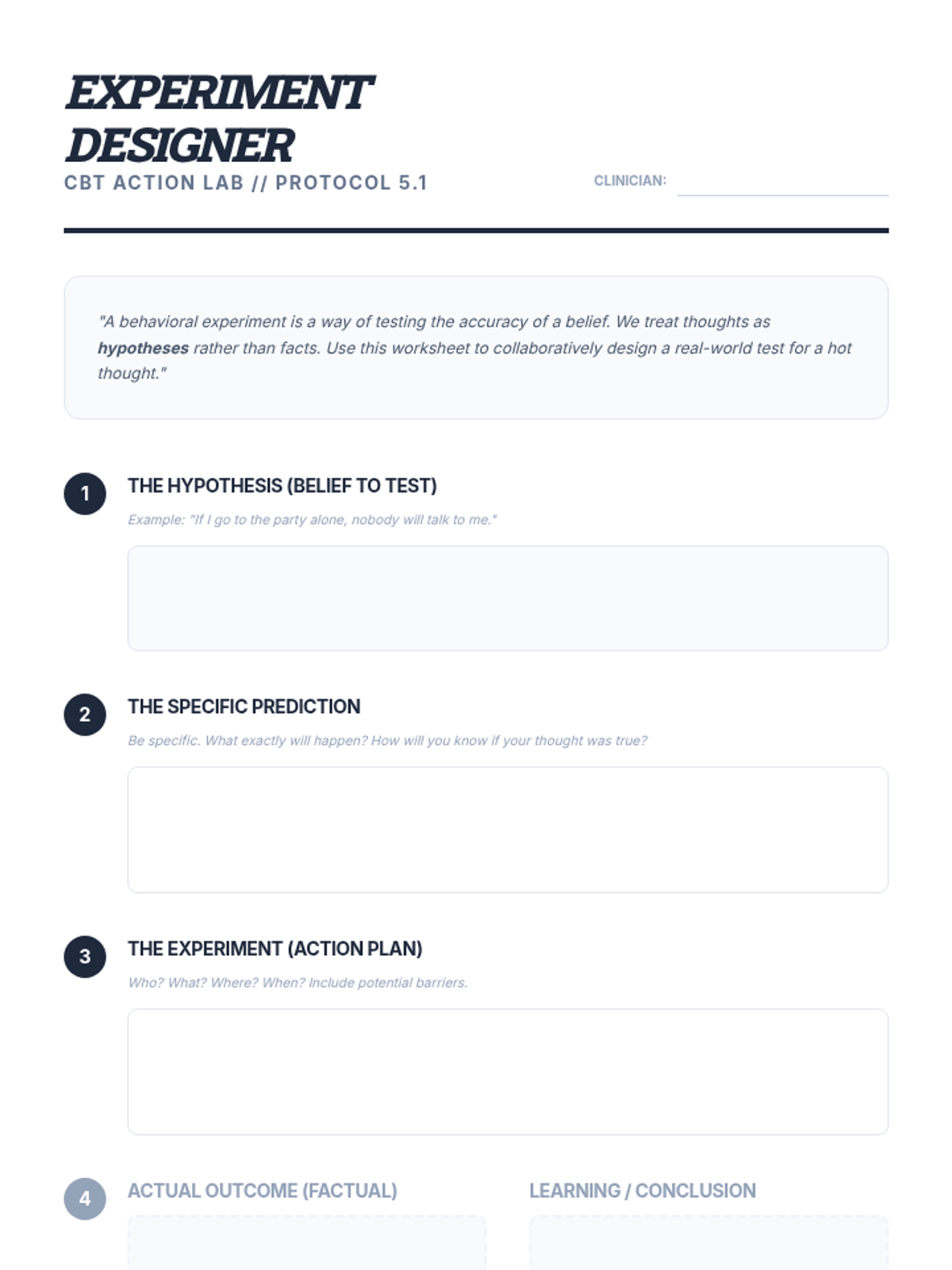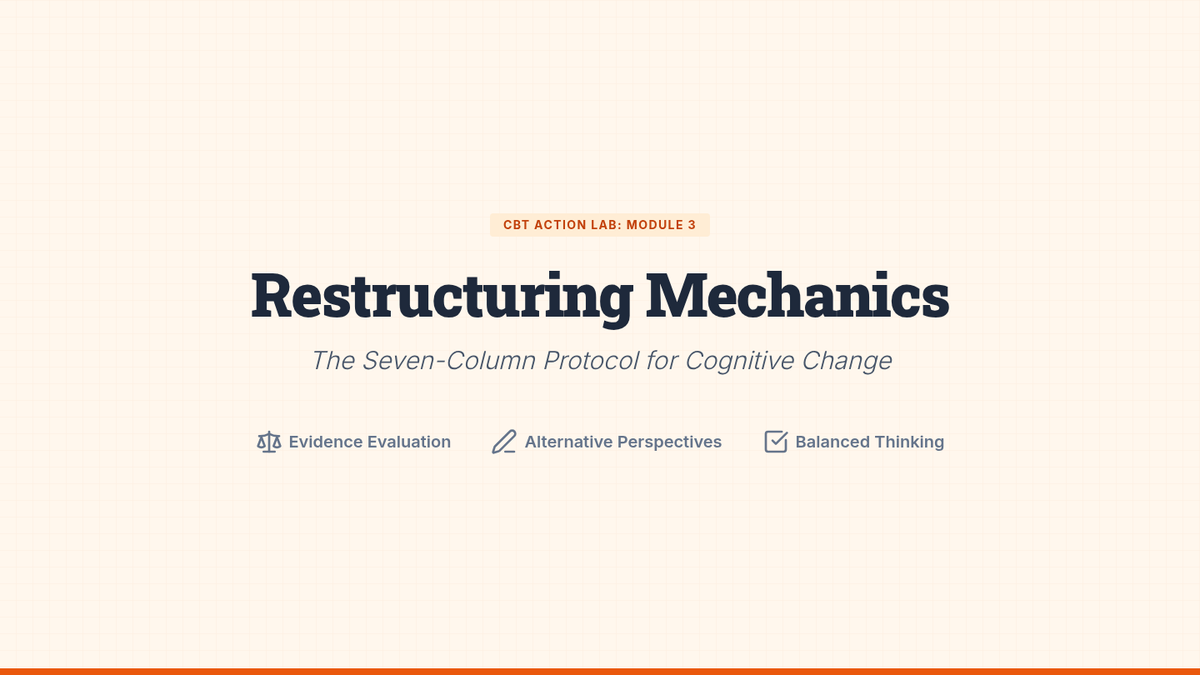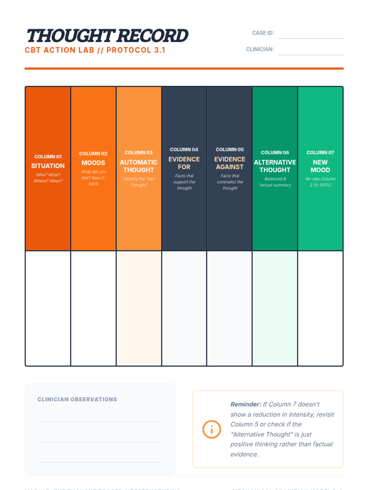 A skills-based sequence for undergraduate counseling students focused on the practical application of Behavioral Activation and Cognitive Restructuring protocols. Students move from behavioral scheduling to the nuanced art of Socratic questioning and cognitive disputation.