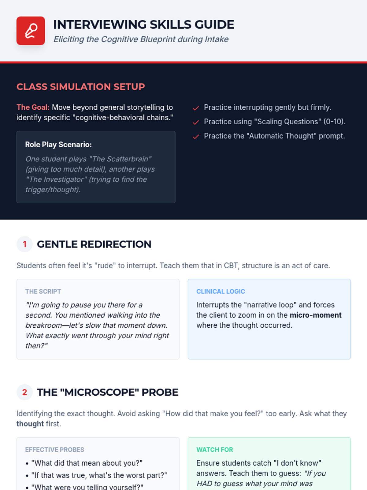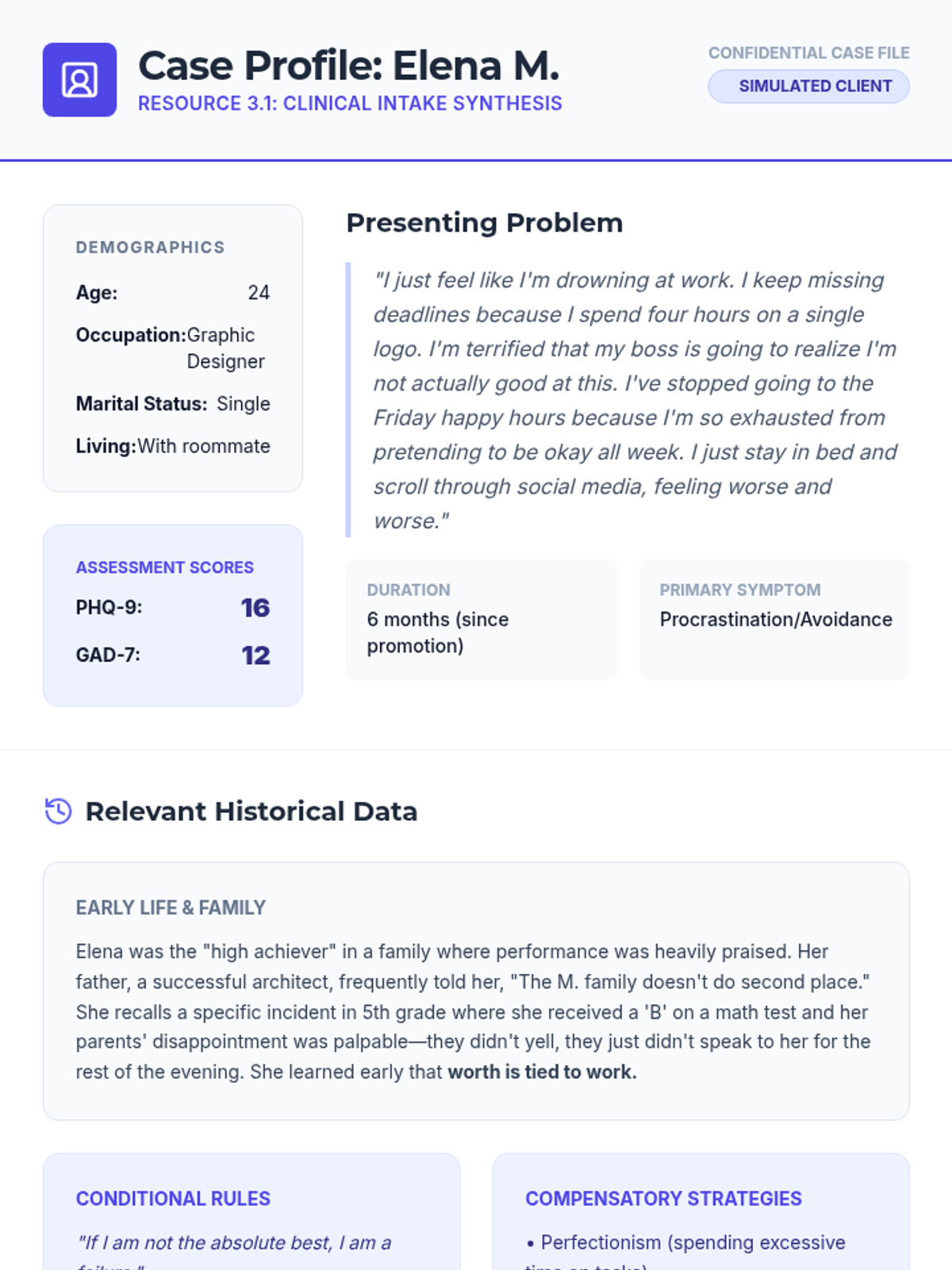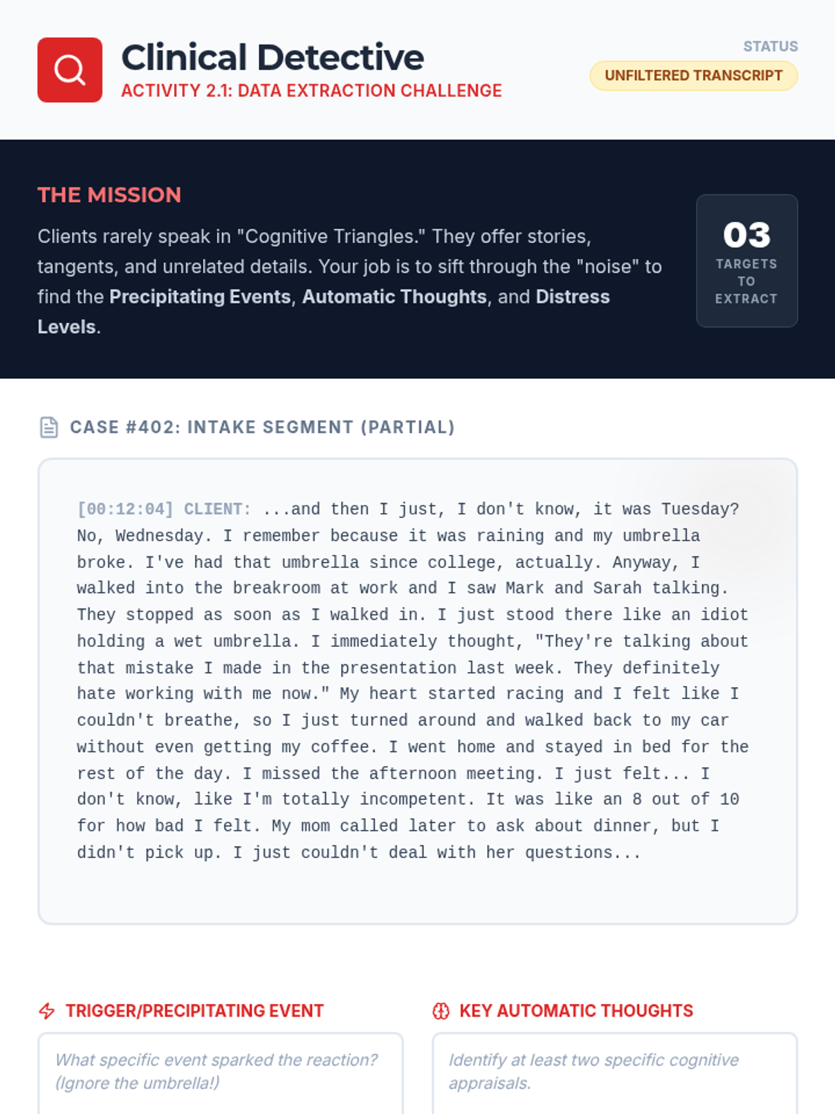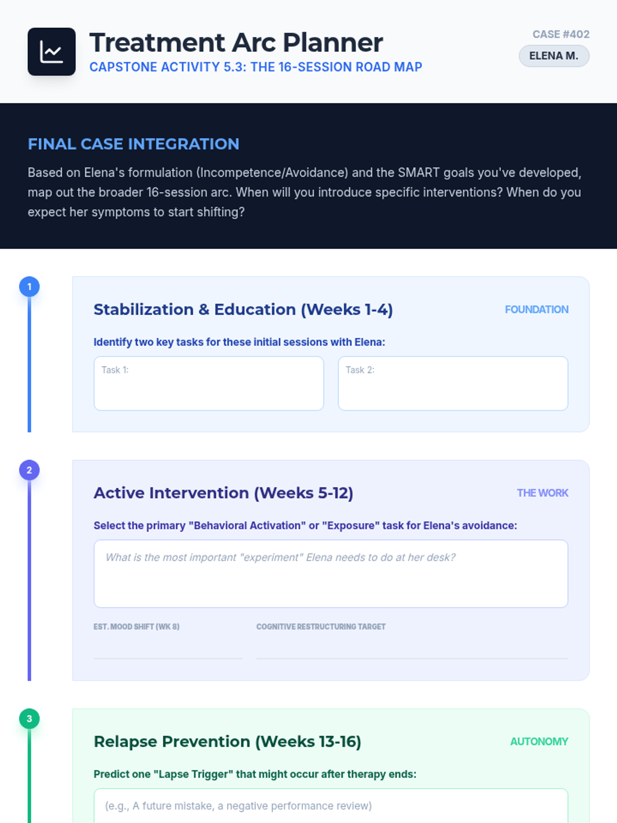 This sequence introduces undergraduate students to the foundational architecture of Cognitive Behavioral Therapy (CBT) through the lens of case conceptualization. Students will move from understanding the cognitive model to synthesizing clinical data into a formal treatment plan for a simulated client.