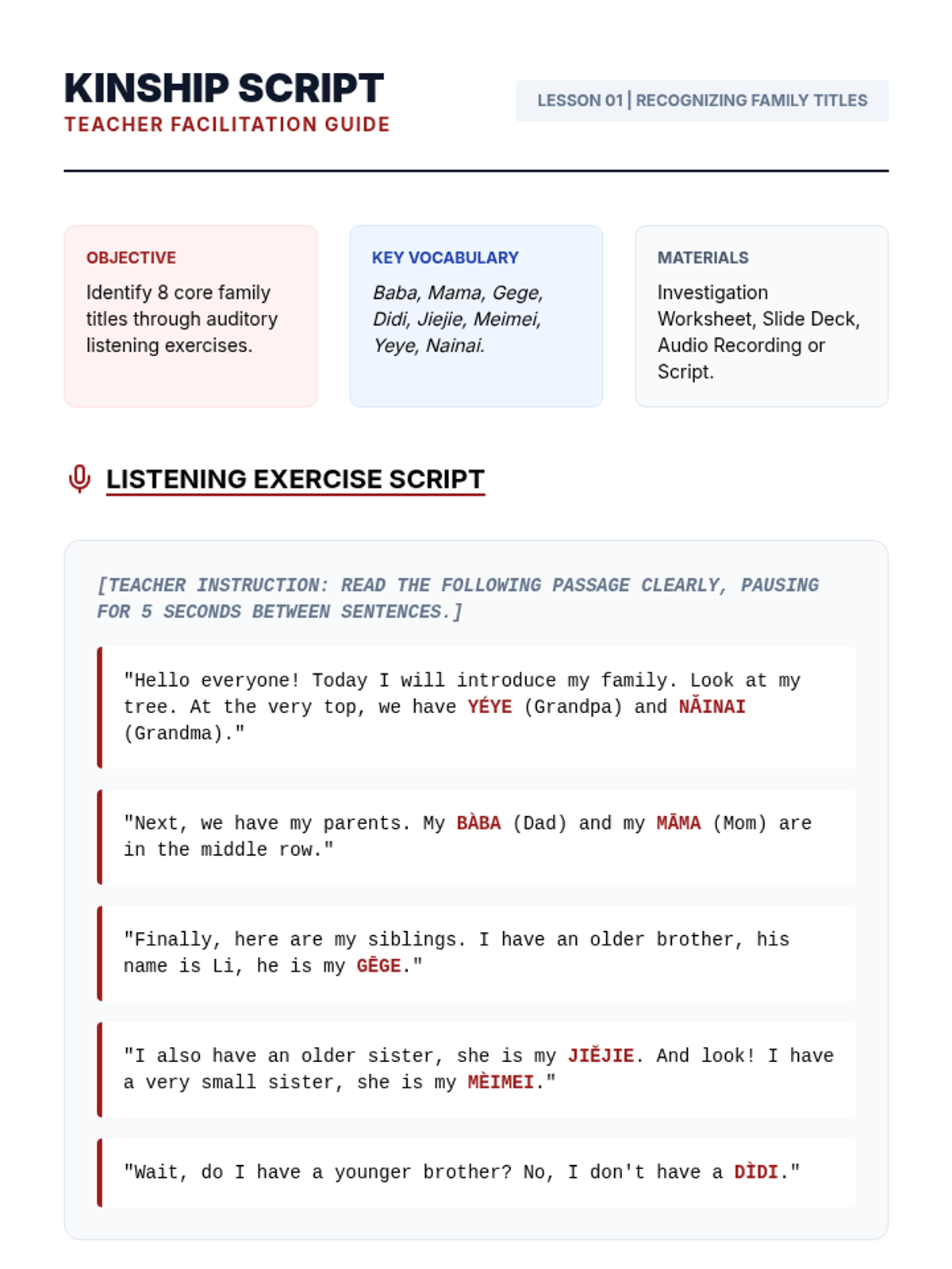 A 6th-grade Mandarin Chinese sequence focusing on listening comprehension for family members and physical descriptions. Students progress from basic kinship titles to complex comparative structures and narrative synthesis.