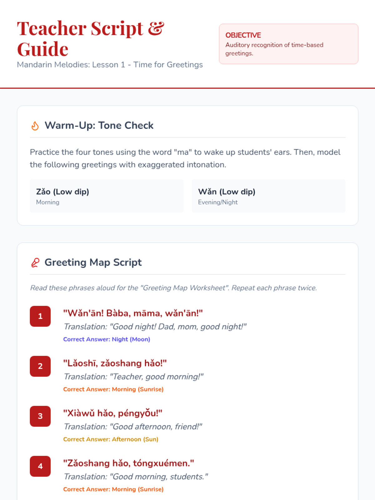 This sequence immerses students in common social scenarios to build comprehension of greetings, introductions, and basic etiquette in Mandarin Chinese. Through listening tasks and simulations, students learn to distinguish between formal and informal registers, identify names and titles, and recognize nationalities.