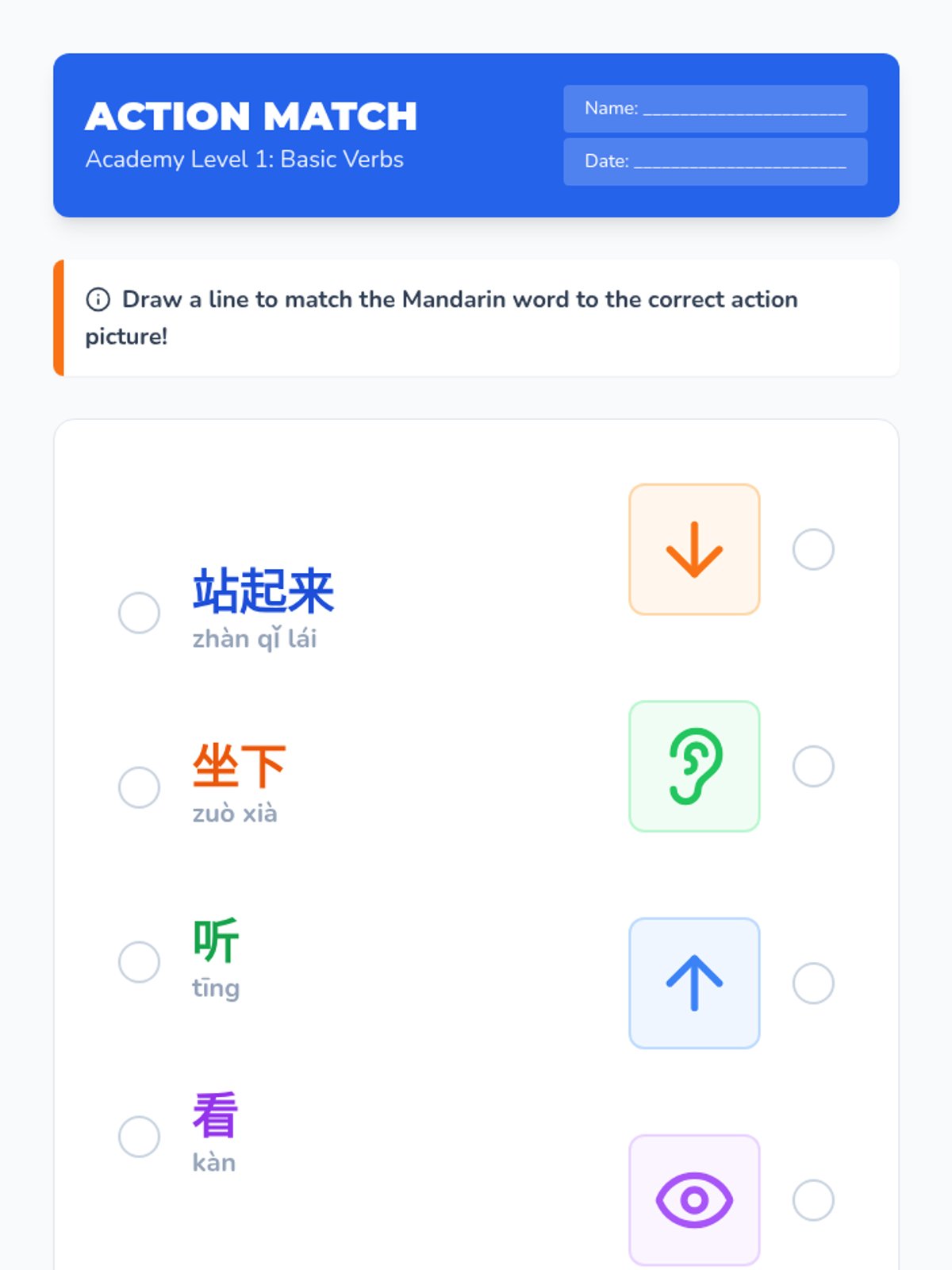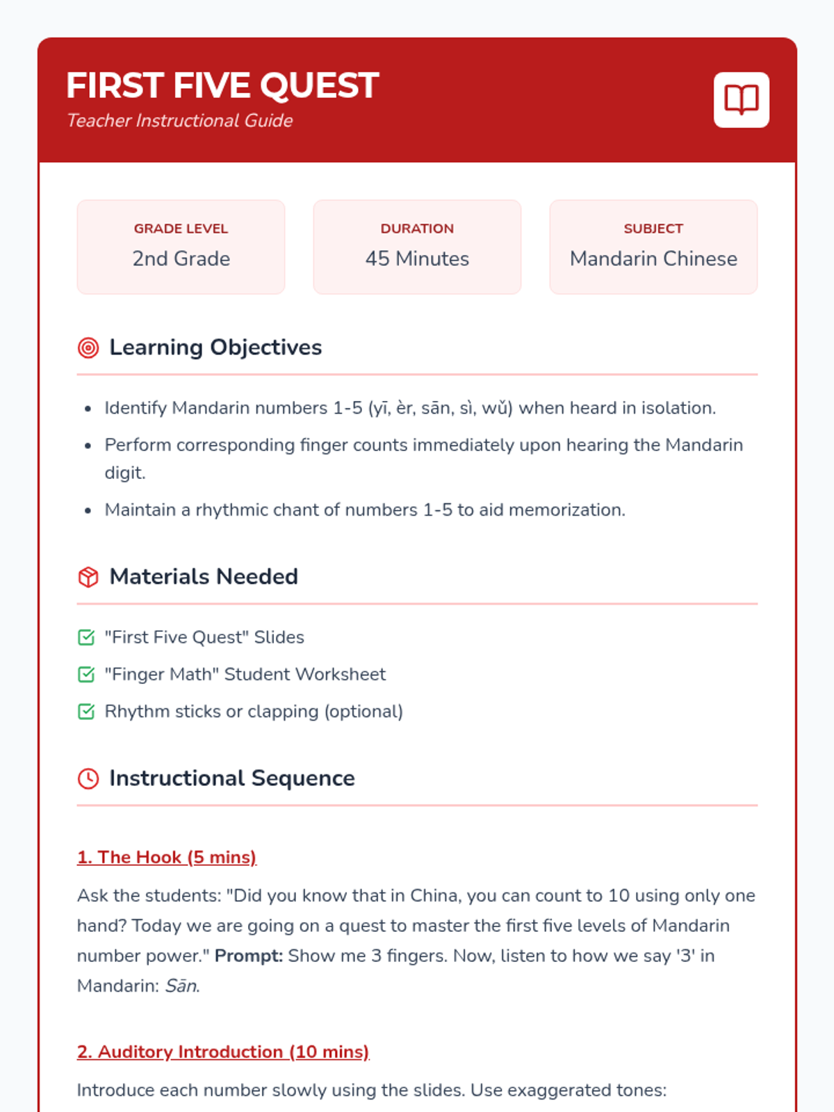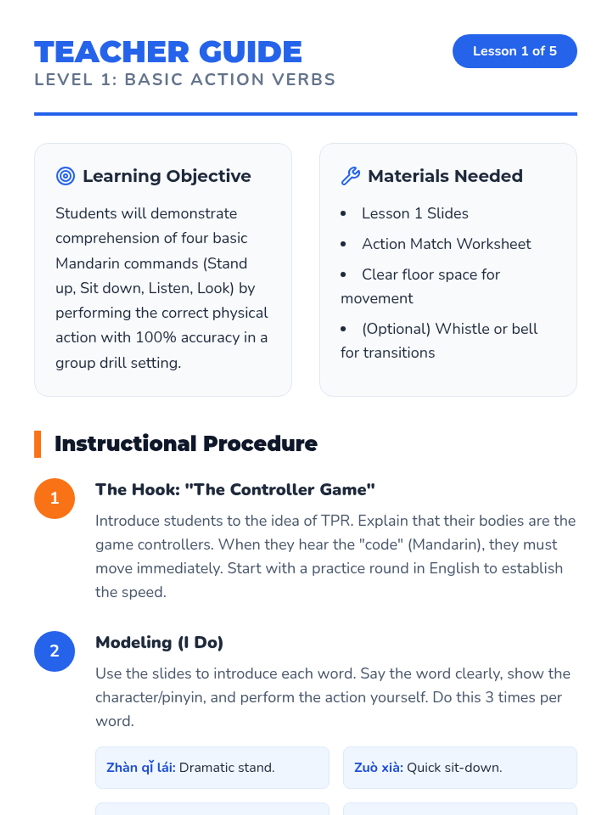 A 5-lesson sequence for 2nd Grade students to learn high-frequency Mandarin action verbs (look, listen, go, come, eat, drink, open, close) through Total Physical Response (TPR) and game-based learning. Students connect written characters directly to physical movements to build immediate comprehension.